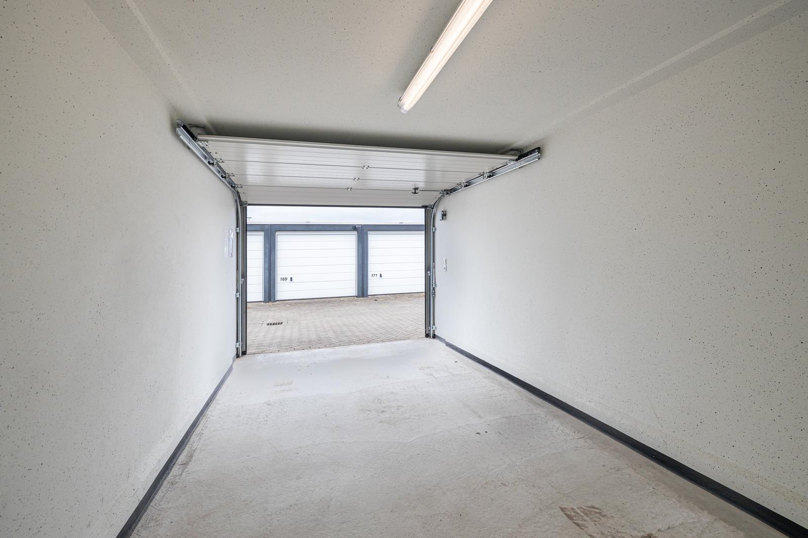 Garage box located on a closed and guarded terrain in a residential area. The terrain can be accessed via a sliding gate. The box measures approx. 15m2 and is located at the rear of the property. The height of the box measures 2.14 metres and the clearance height is approx. 1.89m. The unit is accessed via a manually operated overhead door. The equipment includes lighting and various wall sockets.
