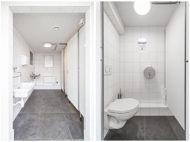 - Algemene ruimte met een tweetal toiletten, wastafel en uitstortgootsteen.