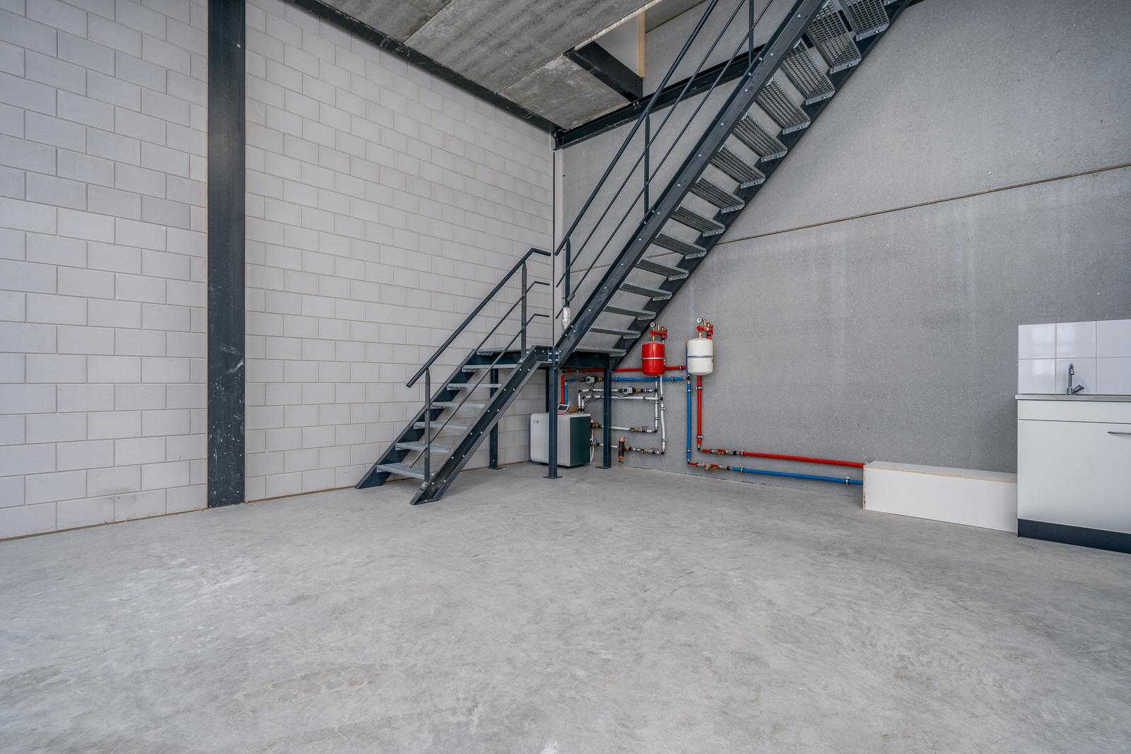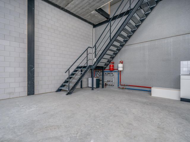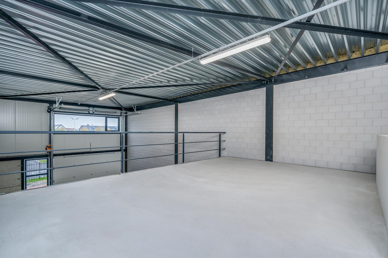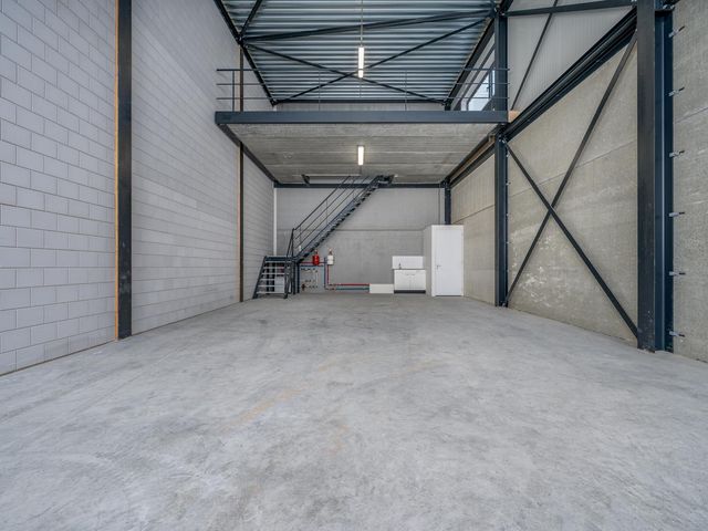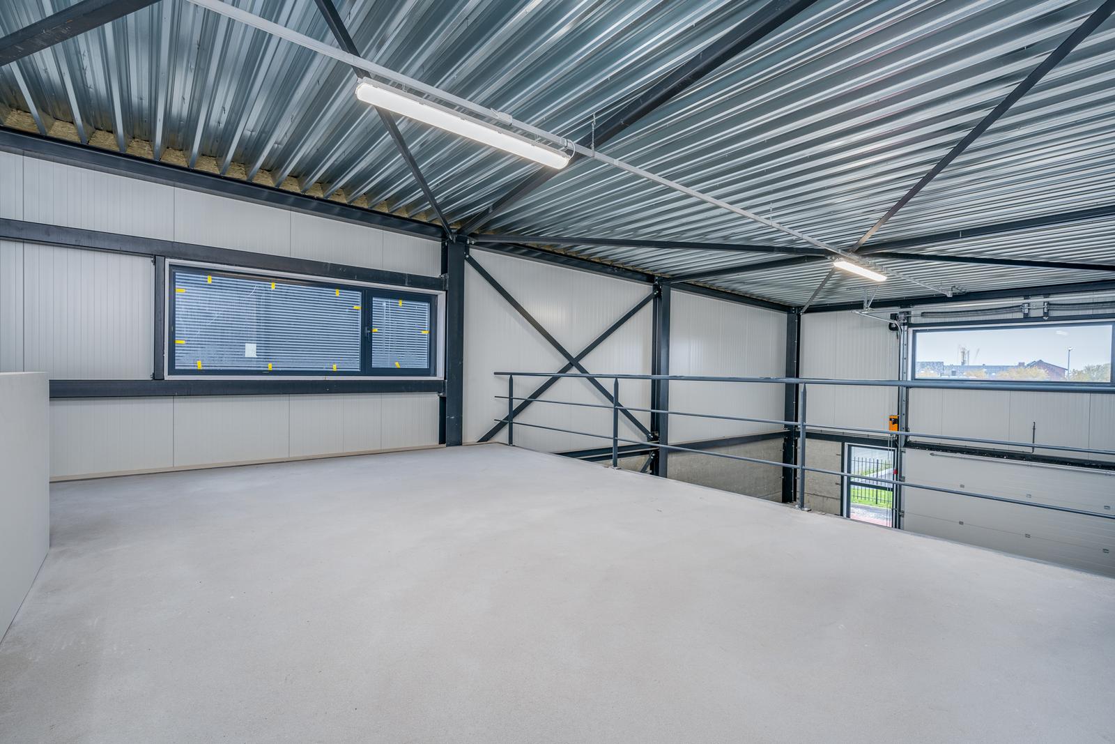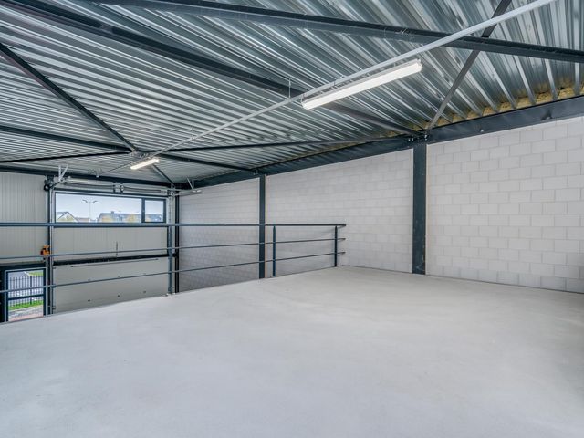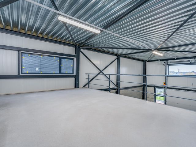 De entresol meet ca. 38m2 en ligt aan de achterzijde van de bedrijfshal en heeft middels een raam daglichttoetreding via de zijkant. Vanaf de entresol heb je zicht op de hal.