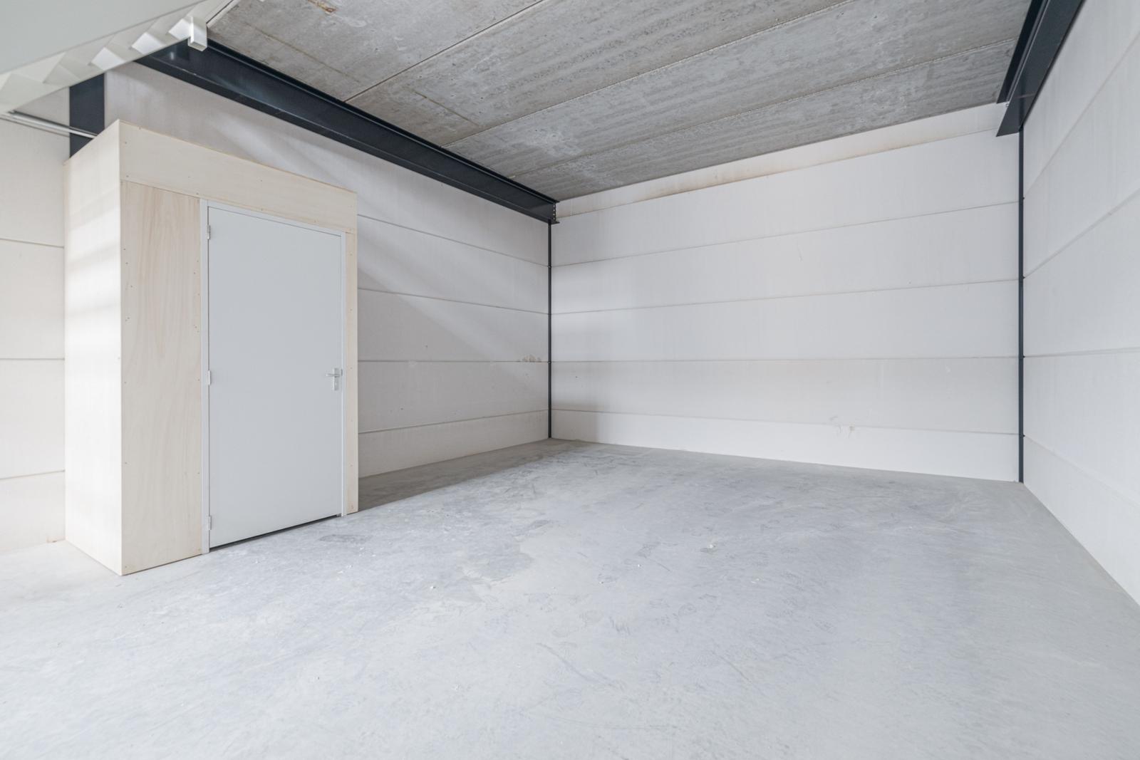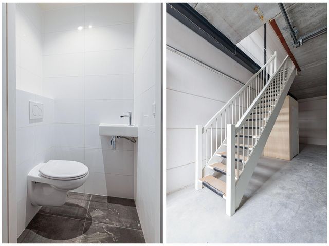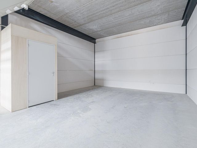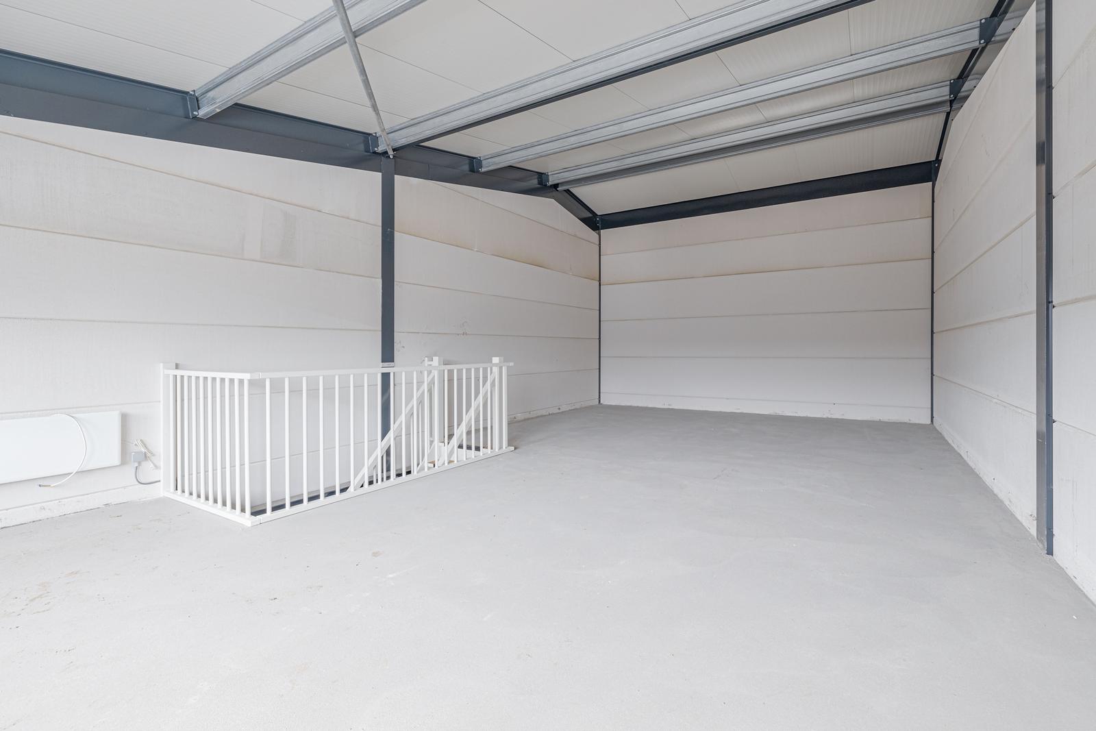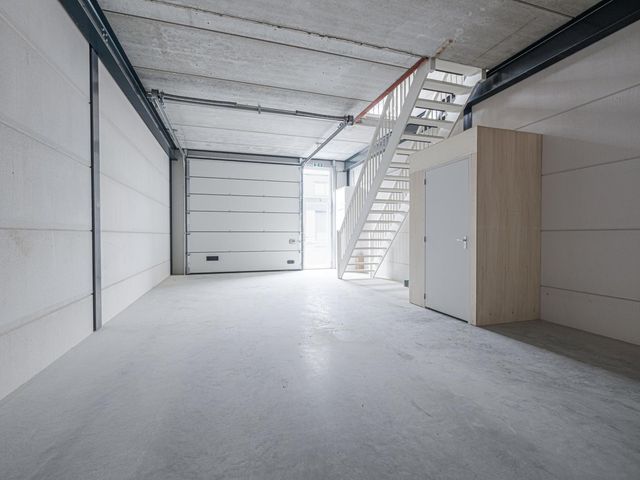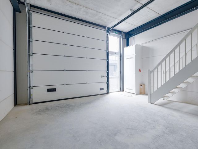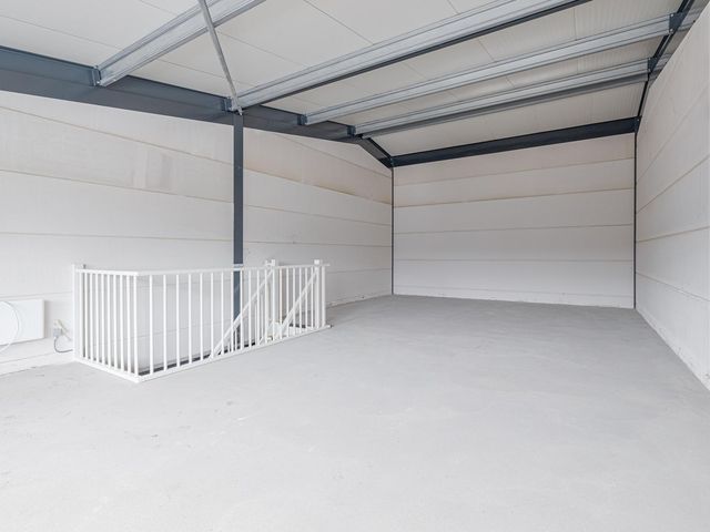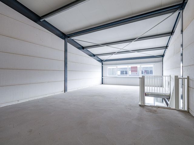 Toegang tot de ruimte via de (loop)deur of de hand bedienbare overheaddeur. De verdieping meet in totaal ca. 61m2. heeft een hoogte van 3,60 meter en uitgevoerd met een keurig toilet. Het toilet is in zijn geheel betegeld met een witte wandtegel, een antracietkleurige vloertegel en is uitgevoerd met een hangend toilet, fonteintje en inbouwspots.