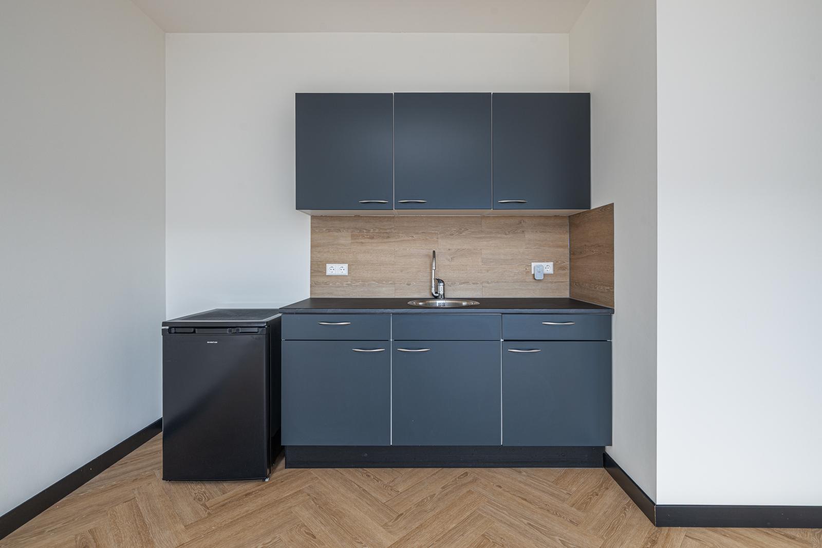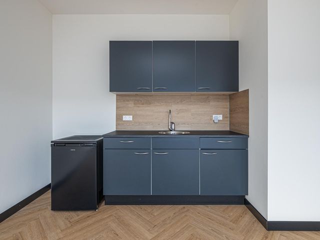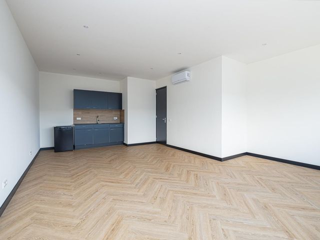 Het lichte kantoor is modern te noemen en meet ca. 34m2 (VVO). Voldoende ruimte voor een aantal werkplekken. Diverse stopcontacten rondom en het plafond is uitgevoerd met inbouwspots. De grote raampartij aan de voorzijde zorgt dat er veel lichtinval is. De uitvoering kent een wit zwarte kleurstelling, waarbij de vloer is voorzien van een pvc-vloer gelegd in visgraat motief. De nette pantry/keuken heeft drie kastjes boven en drie kastjes onder en tevens een wasbak. Warm water voorziening middels een close in boiler.