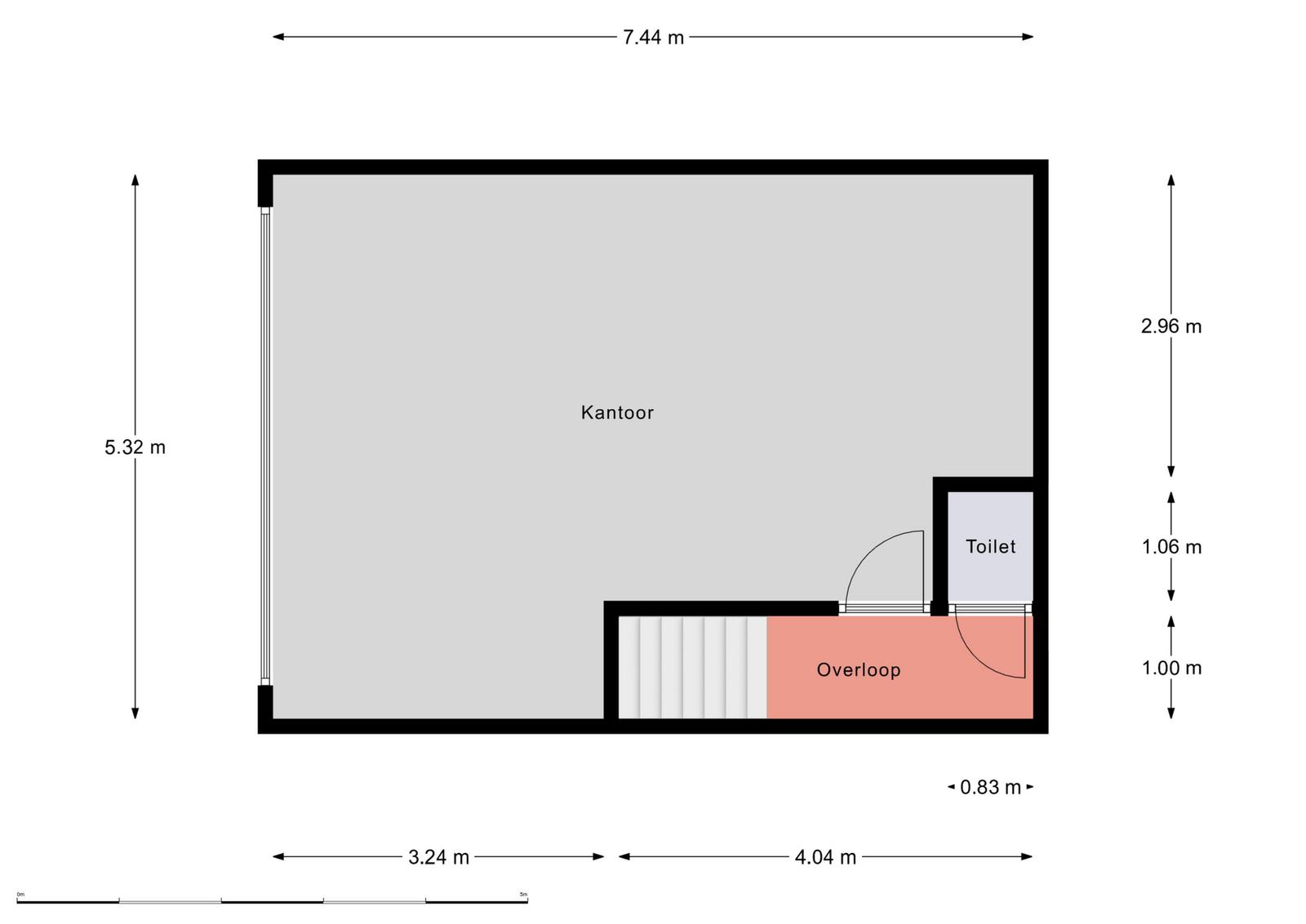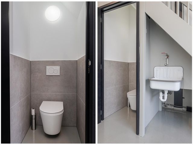 Overloop met toegang tot het toilet en de kantoorruimte. Het toilet is betegeld met een grijze vloer- en wandtegel en uitgevoerd met een hangend toilet. Diverse stopcontacten rondom zorgen er voor dat je door heel de hal heen werkzaamheden uit kan voeren waar stroom voor nodig is. Via de trap toegang tot de 1e verdieping.