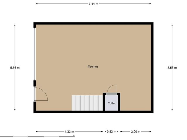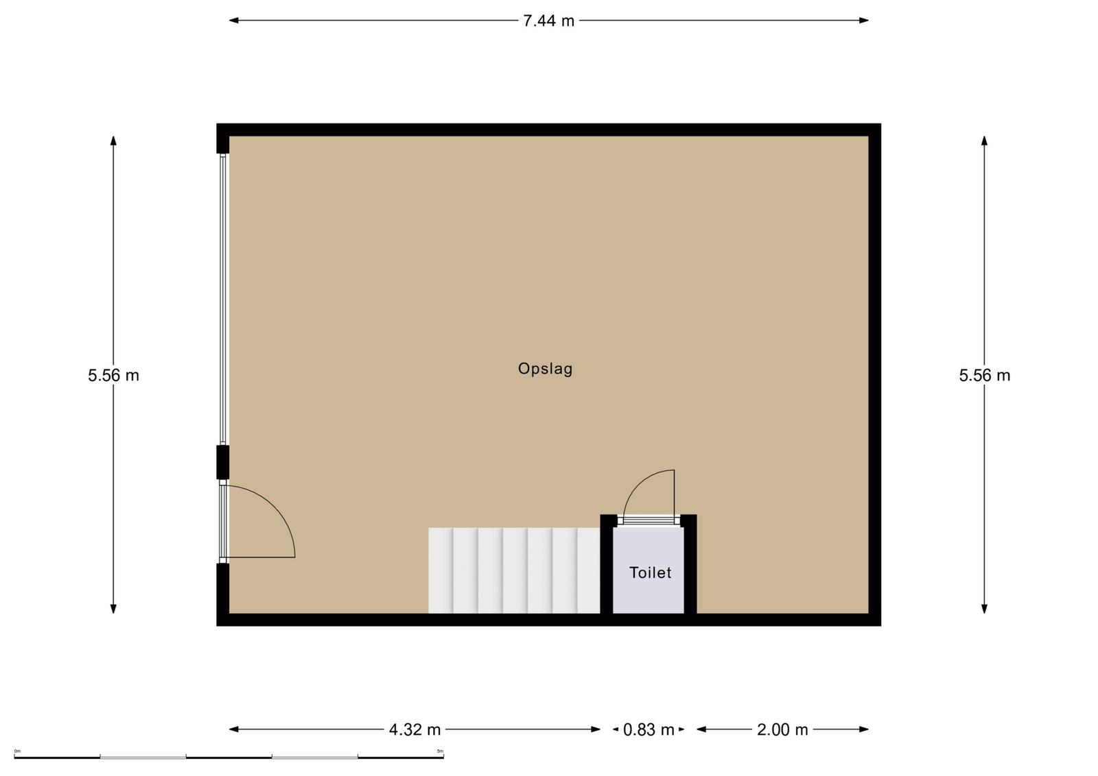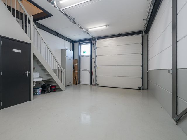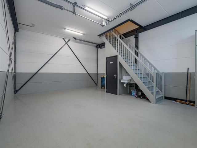 Binnenkomst in de hal van ca. 40m2 (VVO) via de loopdeur of de elektrisch bedienbare overheaddeur. De vloer is gecoat en de uitvoering bestaat uit ledverlichting, een luxe toilet, en een uitstort gootsteen. Via de trap toegang tot de eerste verdieping.