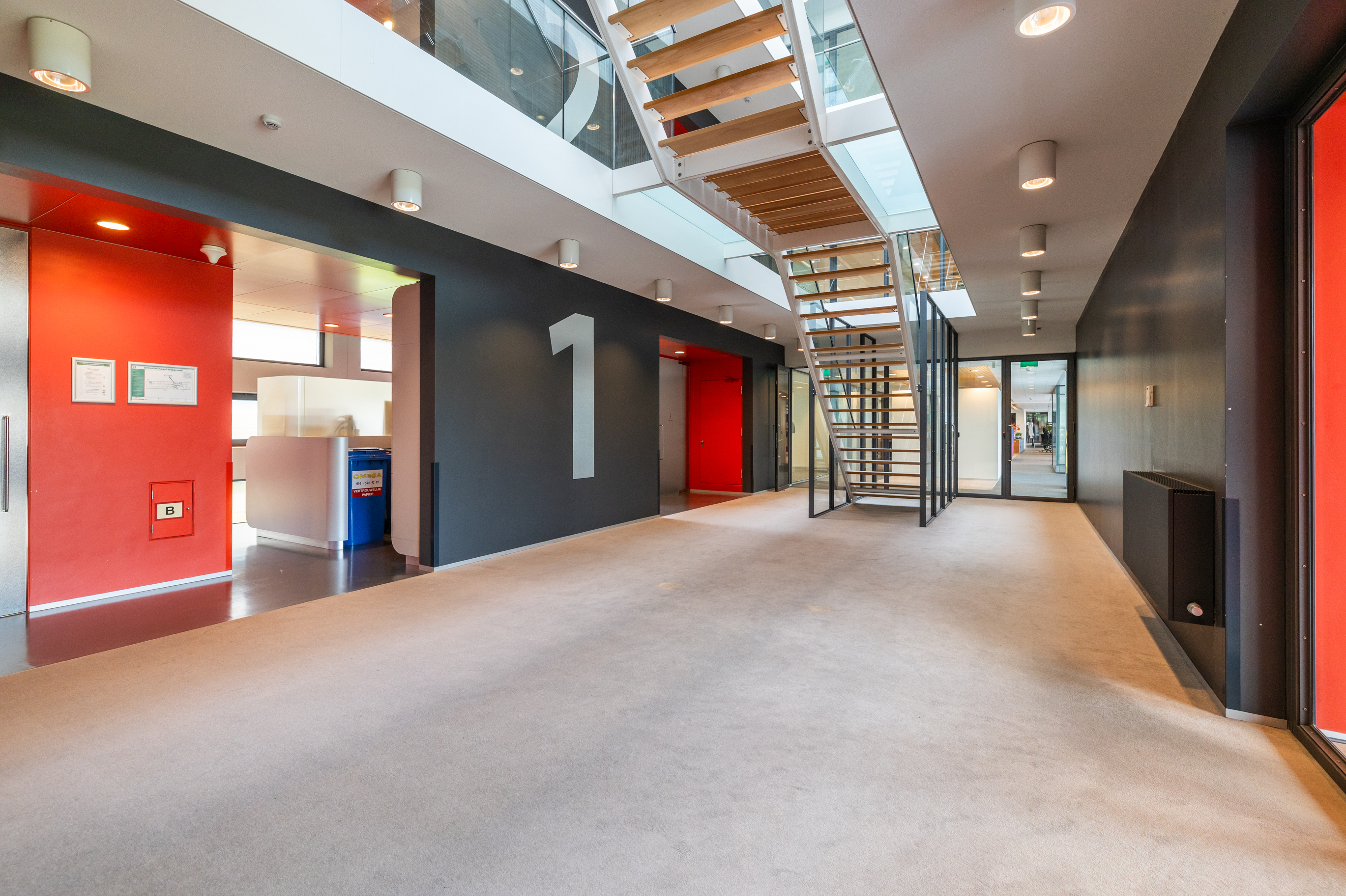- Entree tot de kantoorvleugel met trap en lift naar de eerste etage.