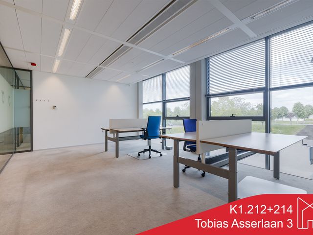 Unit K1.212-214 biedt een prettig werkklimaat met uitzicht over de voorzijde van het gebouw, het parkeerterrein en schuin rechts het "Gemeentehuis van Lansingerland". Deze representatieve ruimte is onder andere voorzien van: