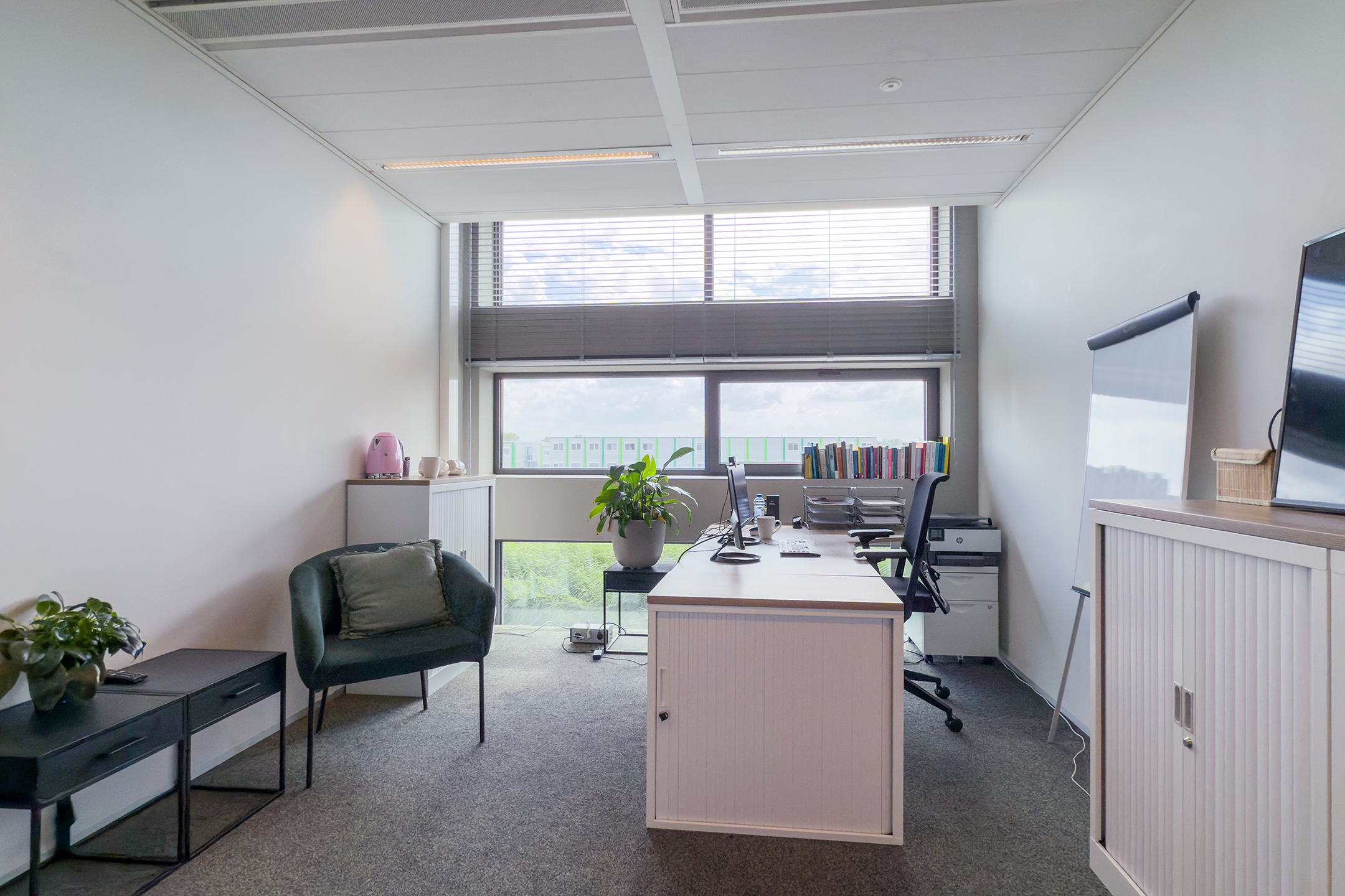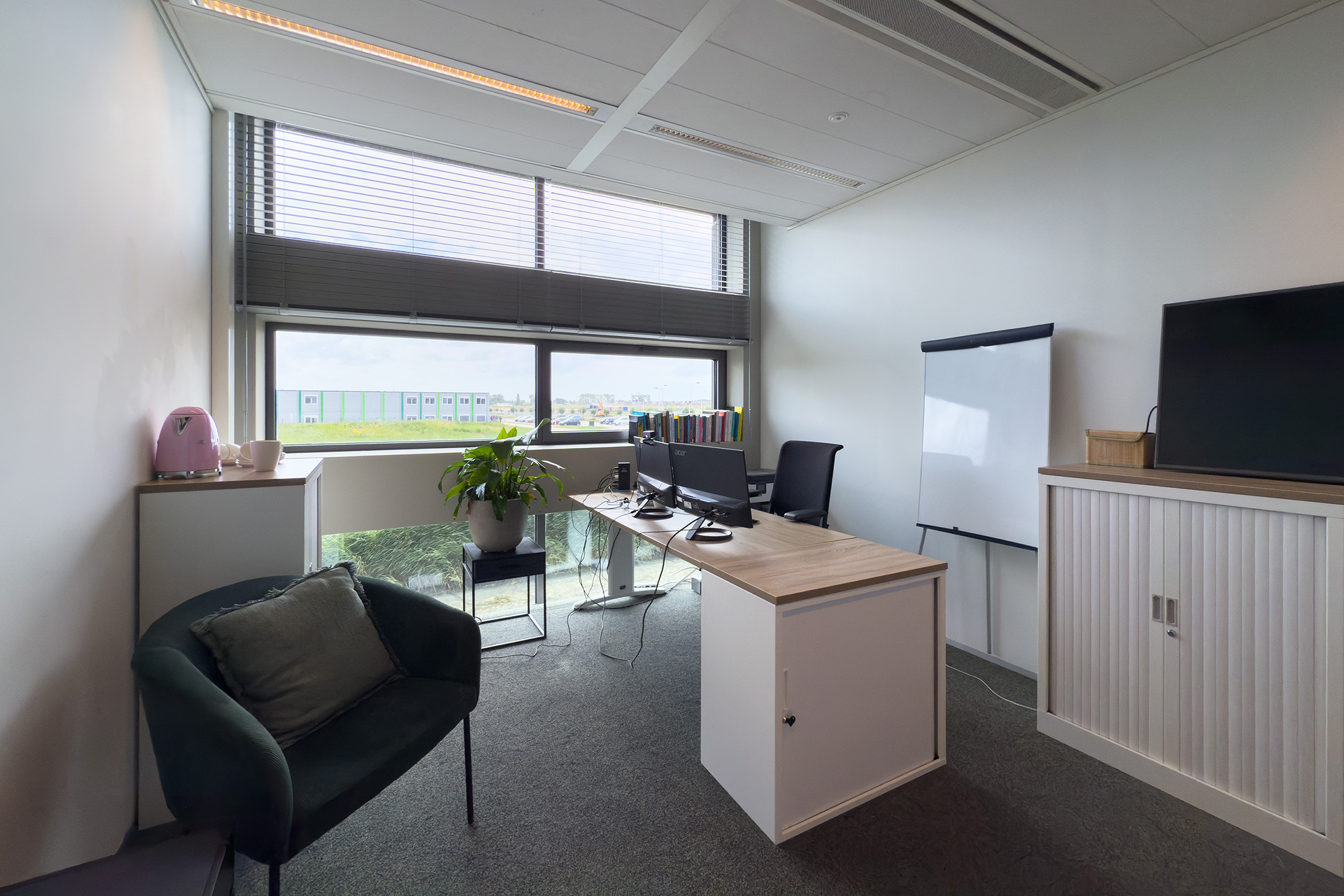 De unit is turn-key en ideaal voor zelfstandig ondernemers, freelancers of kleine bedrijven die op zoek zijn naar een efficiënte en professionele werkplek.