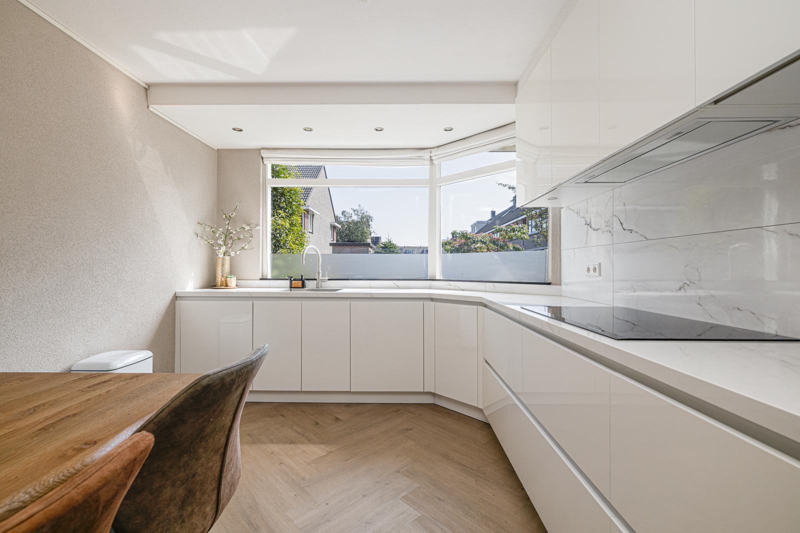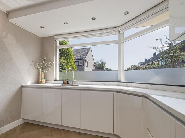 In de woonkamer van ca. 28m2 is het heerlijk sfeervol, zeker met de open haard aan. Perfect voor gezellige avonden! De keuken is een echte eyecatcher. Groot, L-vormig, en helemaal vernieuwd in 2021. Uitgevoerd in strak wit en van alle gemakken voorzien: inductie kookplaat, afzuigkap, oven, combi-oven, magnetron, vaatwasser, koelkast én een Quooker. Hier kan je serieus lekker koken.
