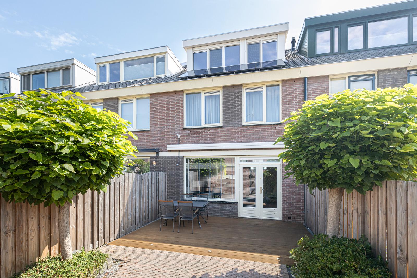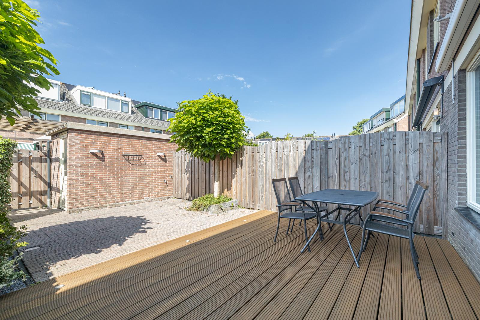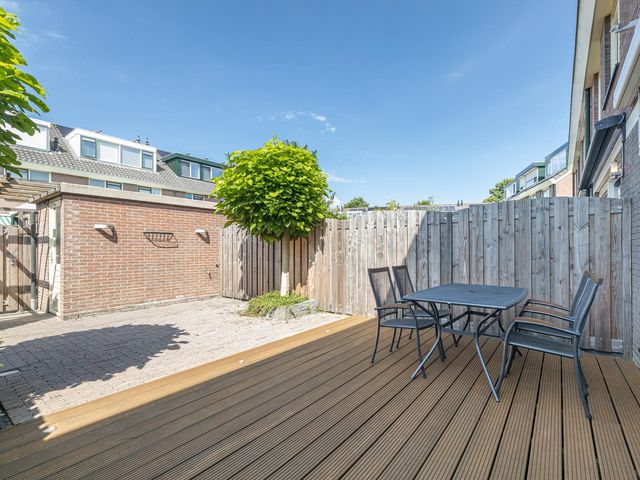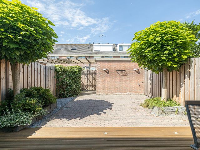Vanuit de woonkamer loop je zo door naar de tuin via de openslaande deuren. De tuin ligt op het westen, dus je zit hier ’s middags en ’s avonds heerlijk in de zon. Alles is keurig aangelegd, met achter in een stenen berging en een poort naar het achterpad. Handig voor de fietsen of het afval.