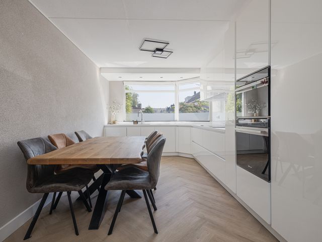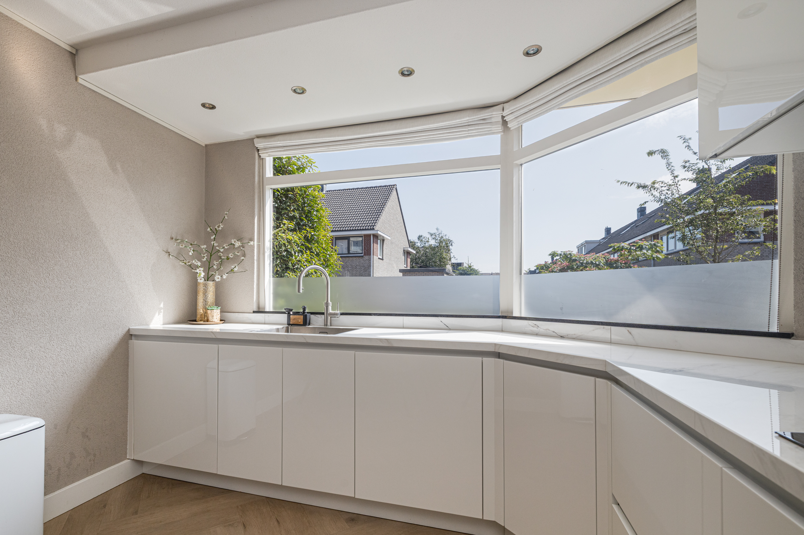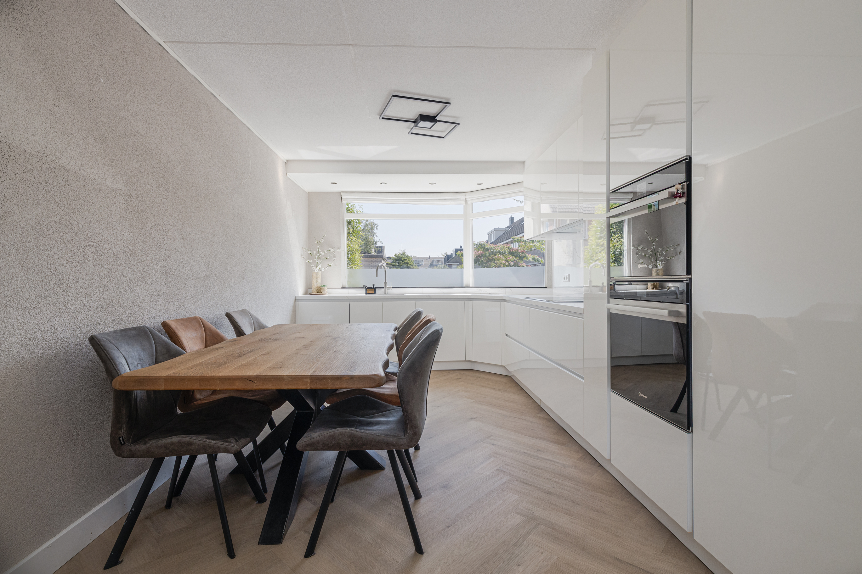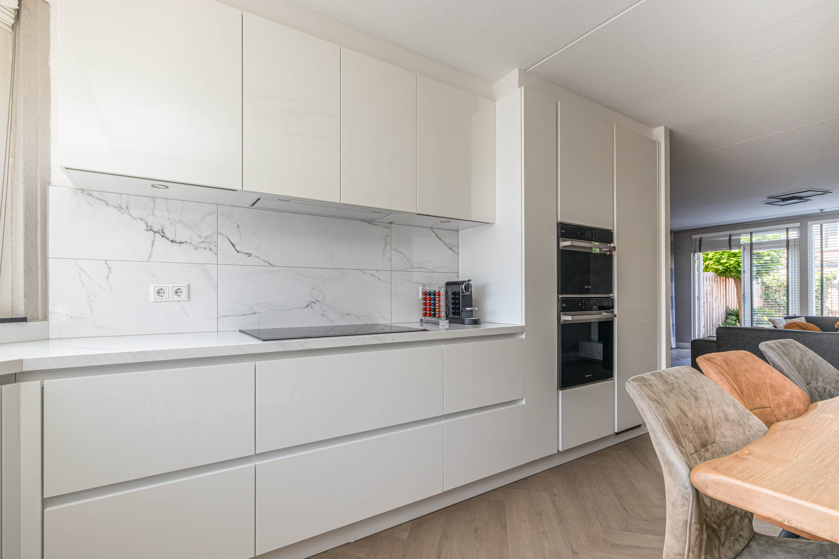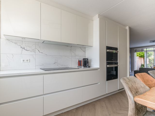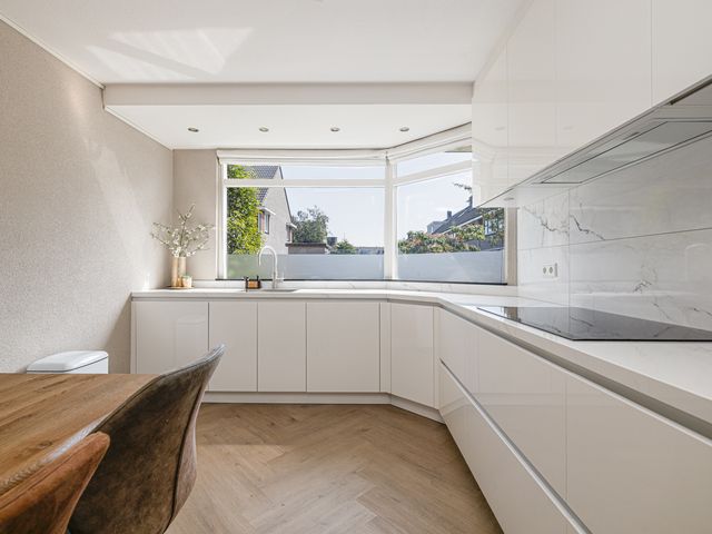 In de woonkamer van ca. 28m2 is het heerlijk sfeervol, zeker met de open haard aan. Perfect voor gezellige avonden! De keuken is een echte eyecatcher. Groot, L-vormig, en helemaal vernieuwd in 2021. Uitgevoerd in strak wit en van alle gemakken voorzien: inductie kookplaat, afzuigkap, oven, combi-oven, magnetron, vaatwasser, koelkast én een Quooker. Hier kan je serieus lekker koken.