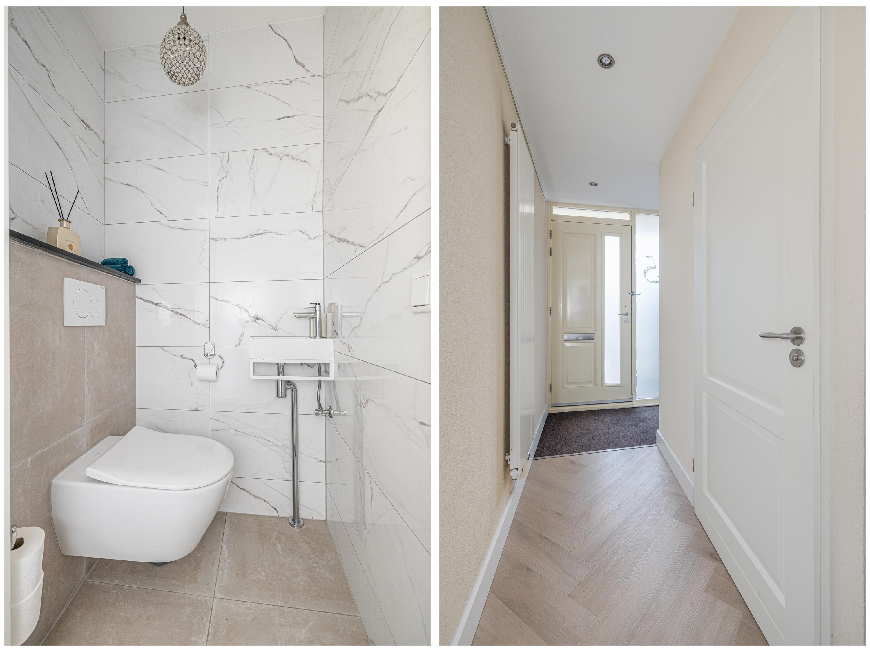 Zodra je binnenkomt in de hal merk je het al, dit huis is tot in de puntjes verzorgd. Vanuit de hal heb je toegang tot het toilet, de woonkamer én de trap naar boven. Het toilet is in zijn geheel betegeld in lichte kleurstelling en voorzien van een hangend toilet en een fonteintje.