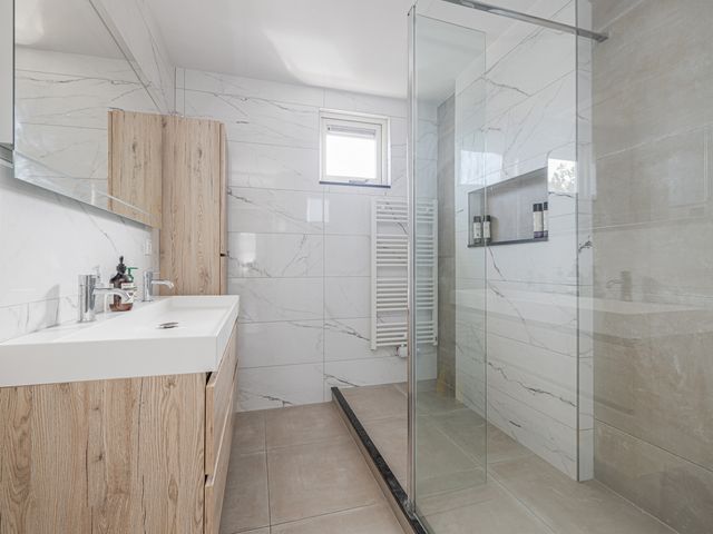 De badkamer is echt een plaatje: luxe uitgevoerd met een inloopdouche, dubbele wastafel en een designradiator. Alles is afgewerkt in een lichte, moderne kleurstelling, helemaal van nu! Er is een apart toilet op deze verdieping. Wel zo handig!