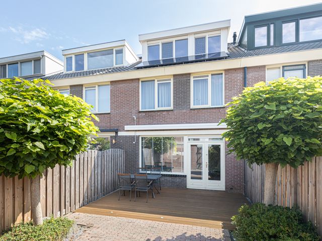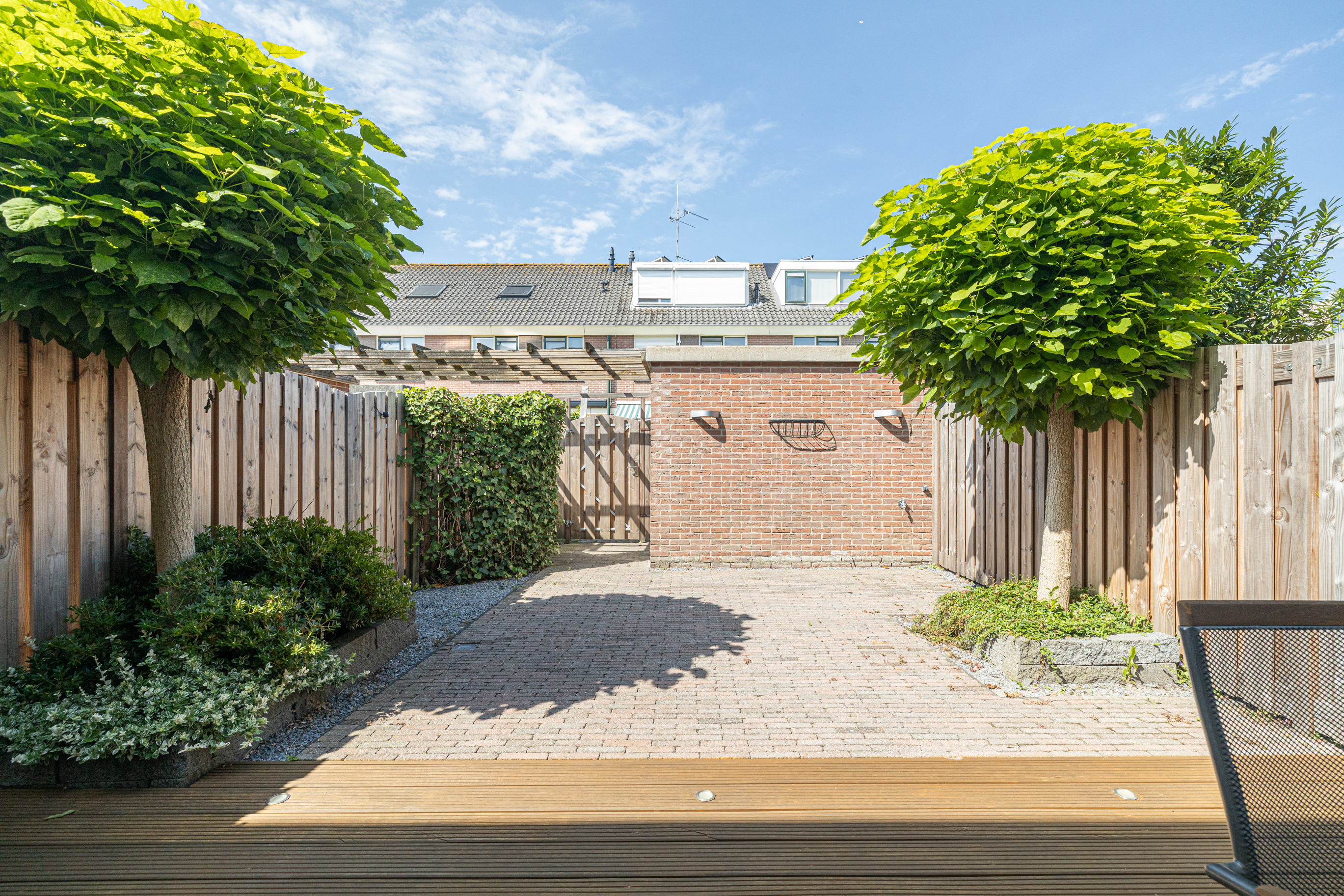Vanuit de woonkamer loop je zo door naar de tuin via de openslaande deuren. De tuin ligt op het westen, dus je zit hier ’s middags en ’s avonds heerlijk in de zon. Alles is keurig aangelegd, met achter in een stenen berging en een poort naar het achterpad. Handig voor de fietsen of het afval.