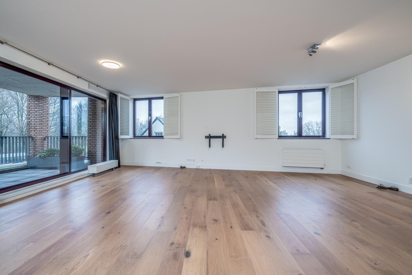 De woonkamer heeft grote raampartijen en voorzien van prachtige witte shutters.