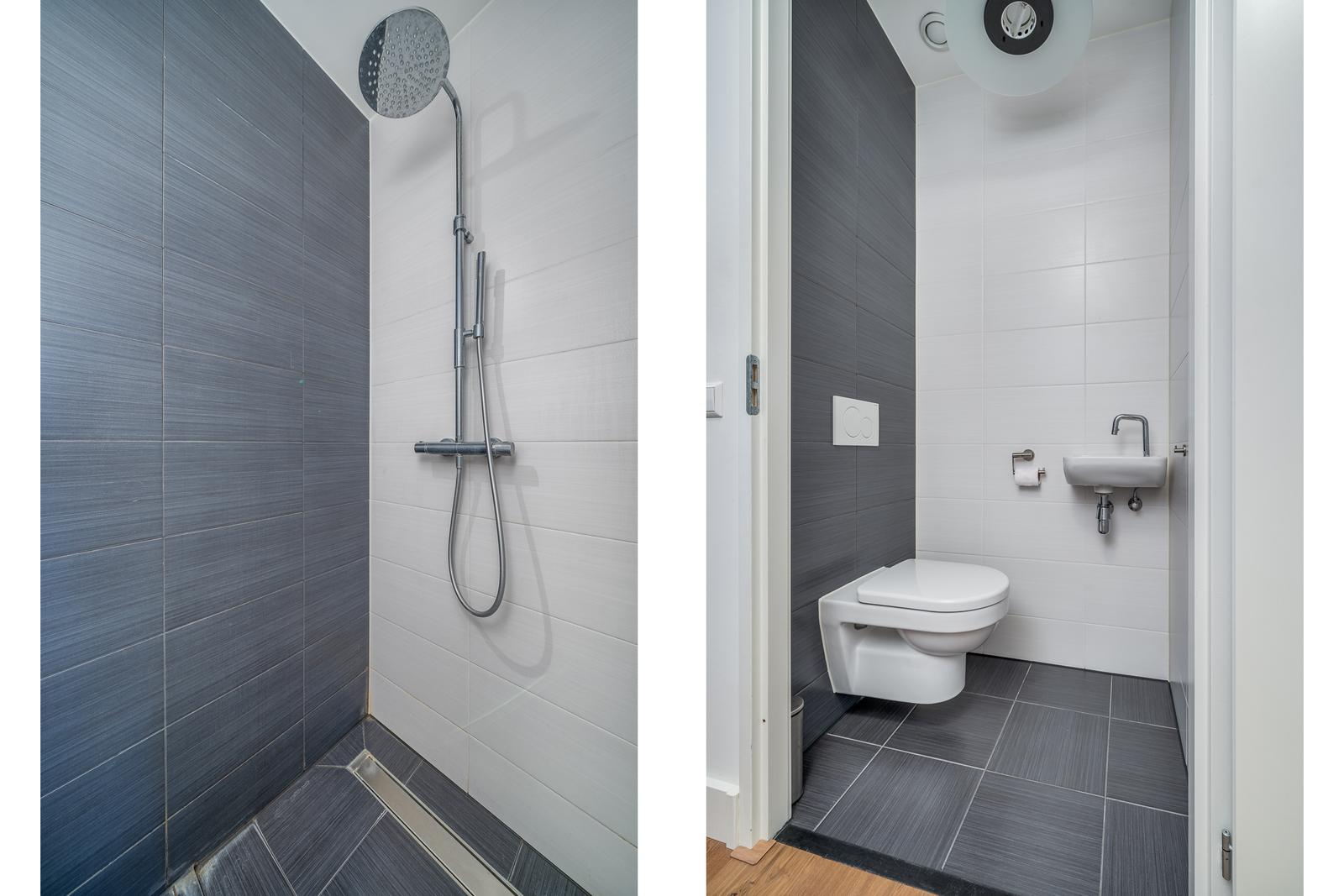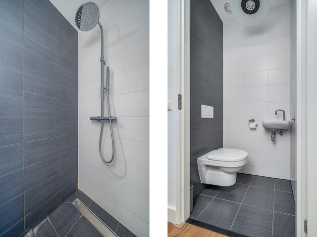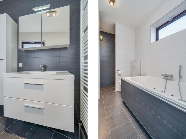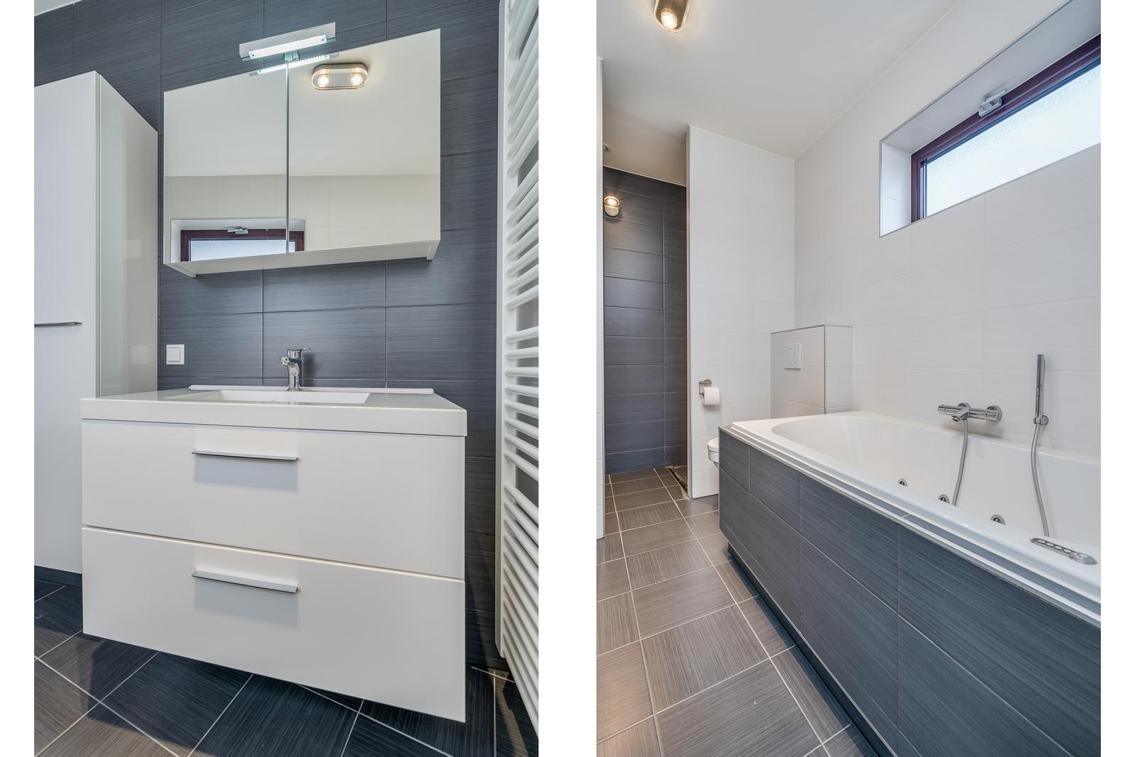 Vanuit de hoofdslaapkamer is de luxe badkamer te bereiken. Deze badkamer ensuite is volledig betegeld en voorzien van inloop douche, whirlpool ligbad, toilet en wastafelmeubel. De betegeling is voorzien van grijze vloertegels en wit/grijze wandtegels.