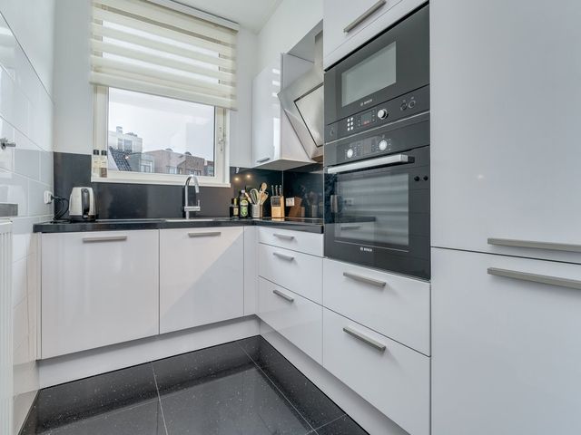 Overloop met garderobe en toegang tot de vertrekken. Royale woonkamer van maar liefst 44m2, met zowel balkon aan de voorzijde als aan de achterzijde. Dichte keuken gelegen aan de achterzijde en voorzien van kookplaat, afzuigkap, vaatwasser, koelkast, oven en magnetron. Slaapkamer I (kleinste slaapkamer van de woning) van ca. 7m2). Hangend volledig betegeld toilet met fonteintje.