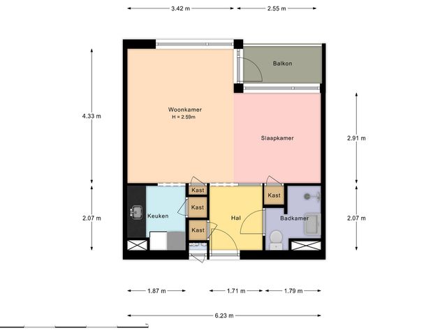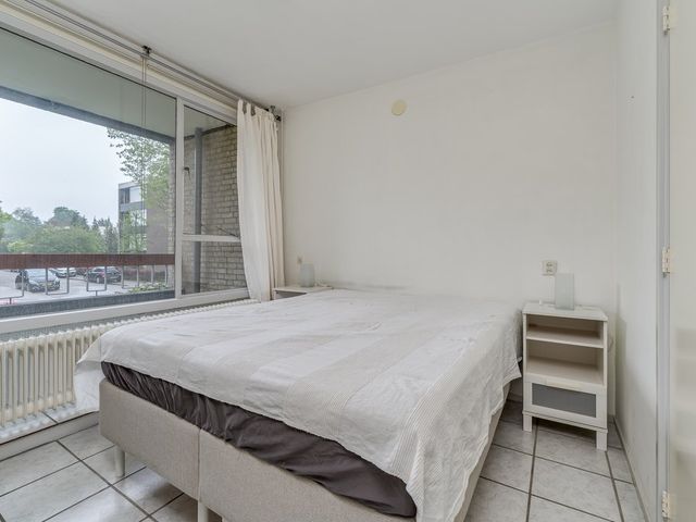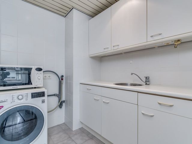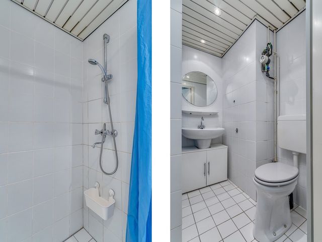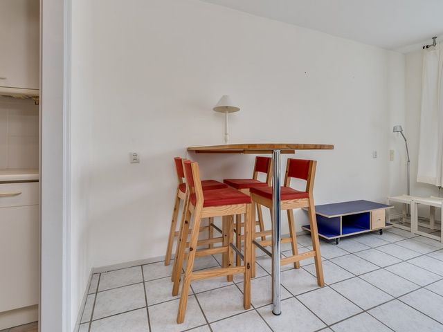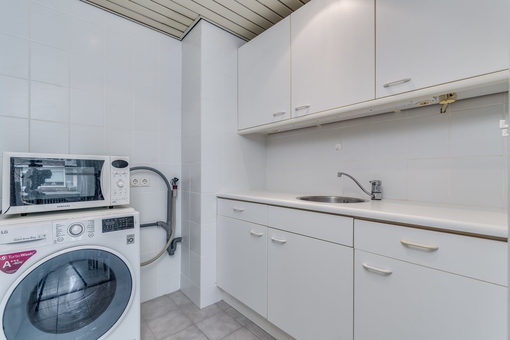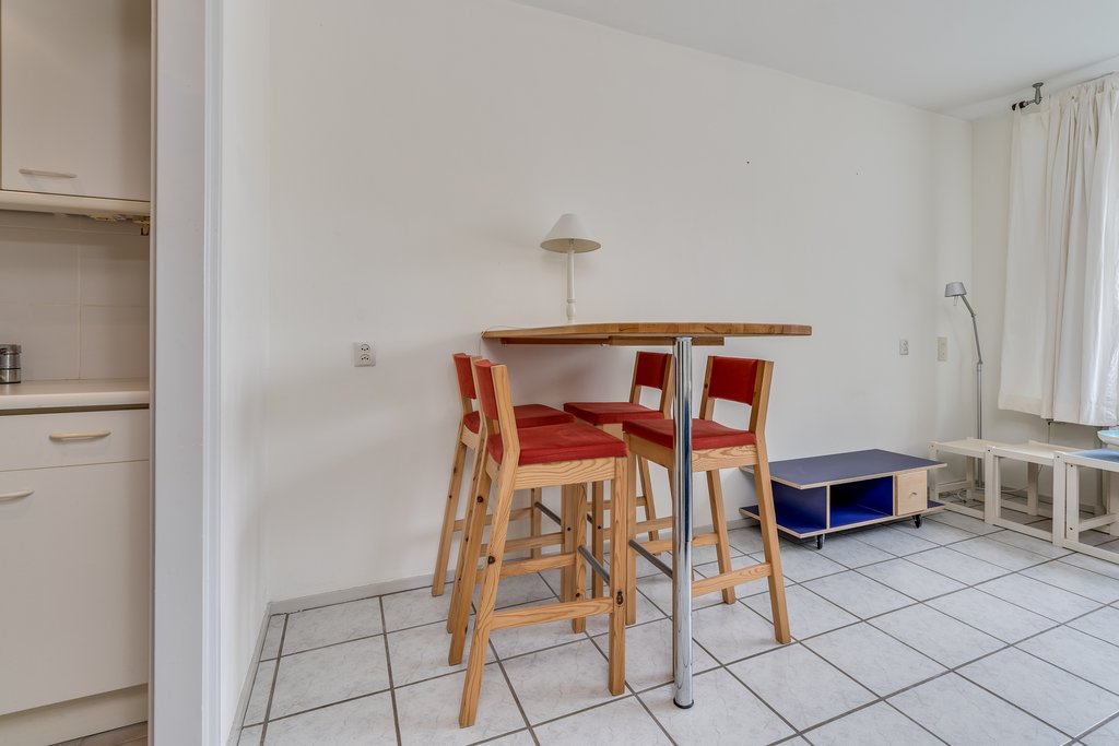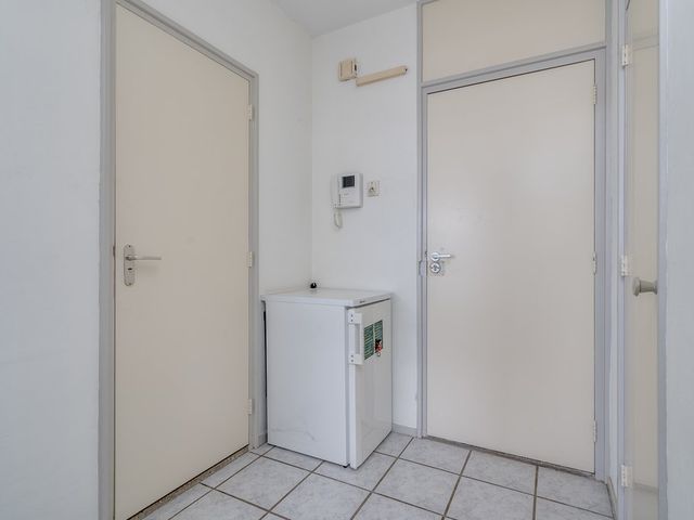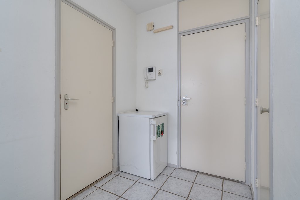 Entree in de hal van het appartement. Toegang tot de woonkamer/keuken en badkamer. De lichte woon-/slaapkamer (ca. 24m2) is gelegen aan de achterzijde en geeft toegang tot de keuken en het balkon. De vloer is voorzien van een witte plavuizenvloer. De eenvoudige keuken is uitgevoerd in het wit. Hier tref je tevens de aansluiting van de wasmachine en heb je toegang tot een vaste kast waar de boiler zich bevindt.