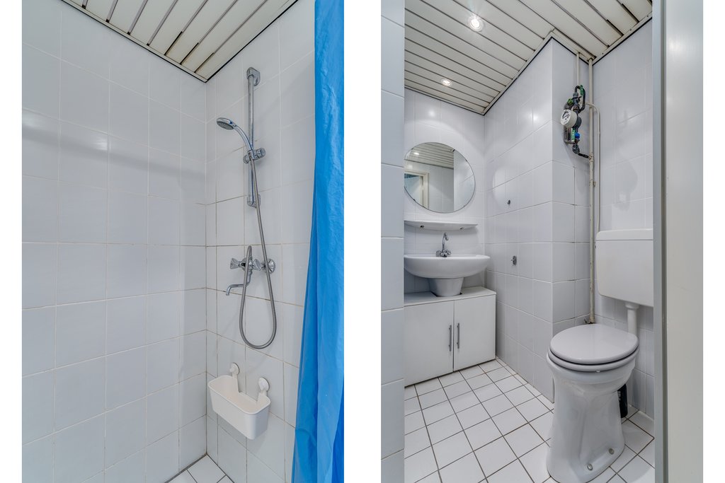 De geheel betegelde en complete badkamer (ca. 5m2) is voorzien van een douche, wastafelmeubel en toilet.