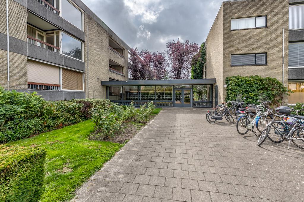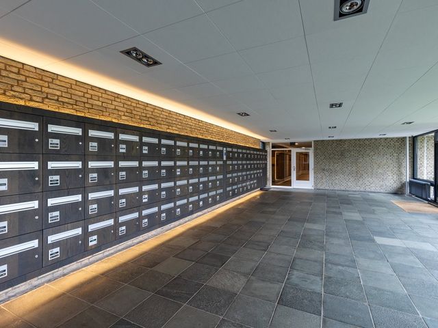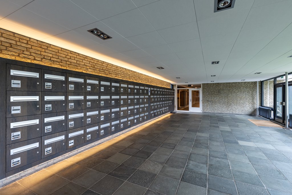 Door de centrale hal met brievenbussen, via enkele treden toegang tot de verdieping.