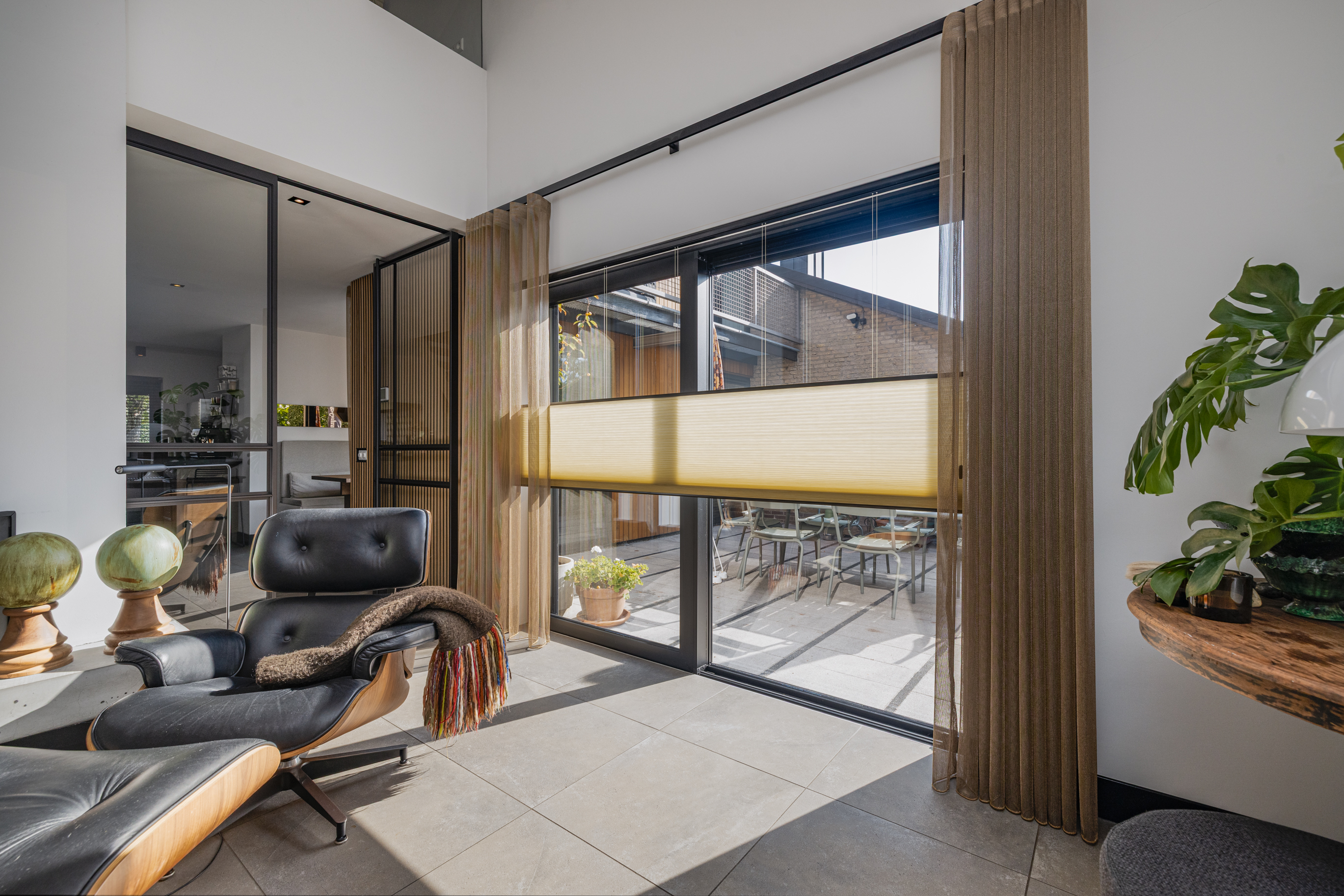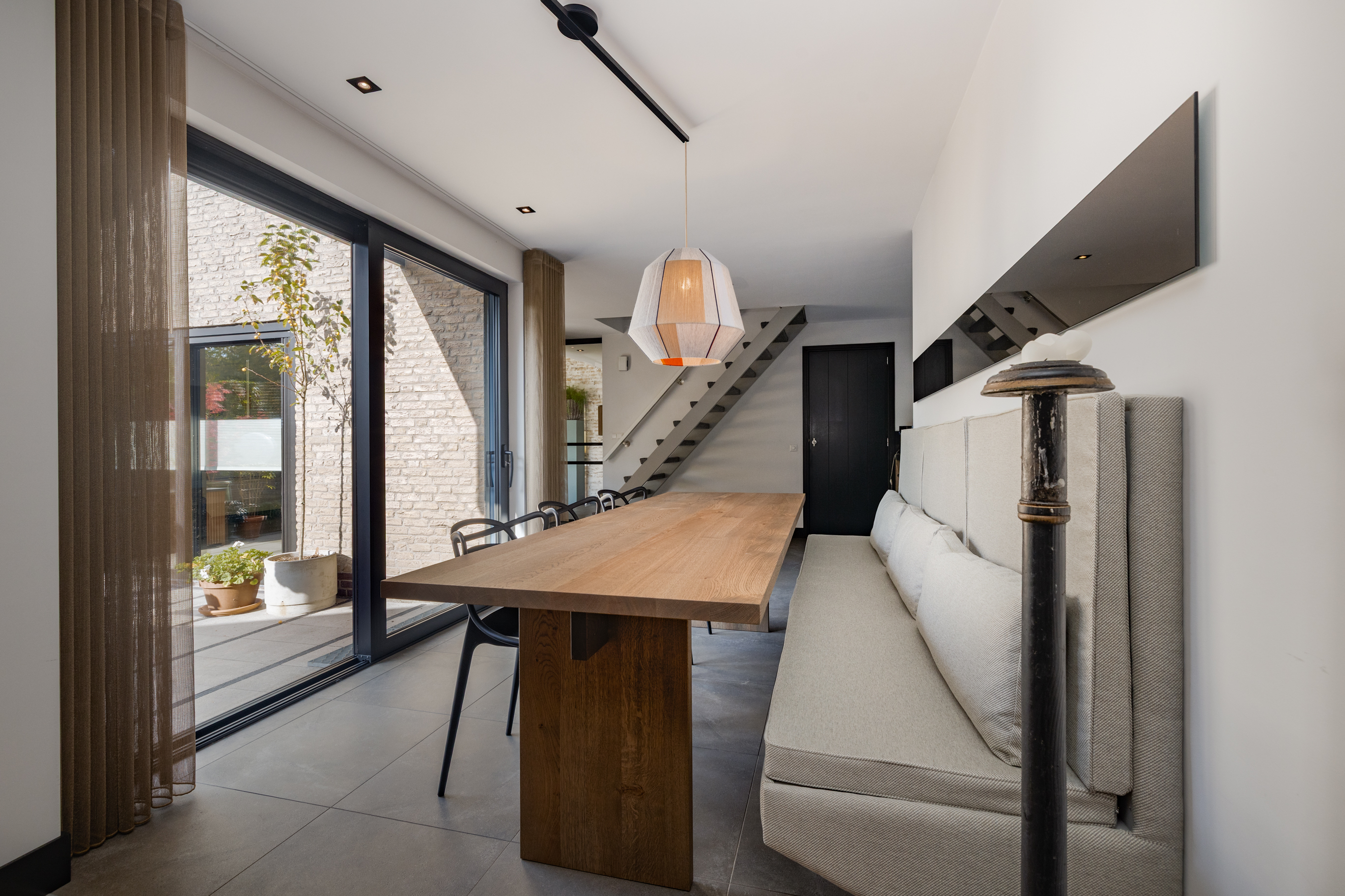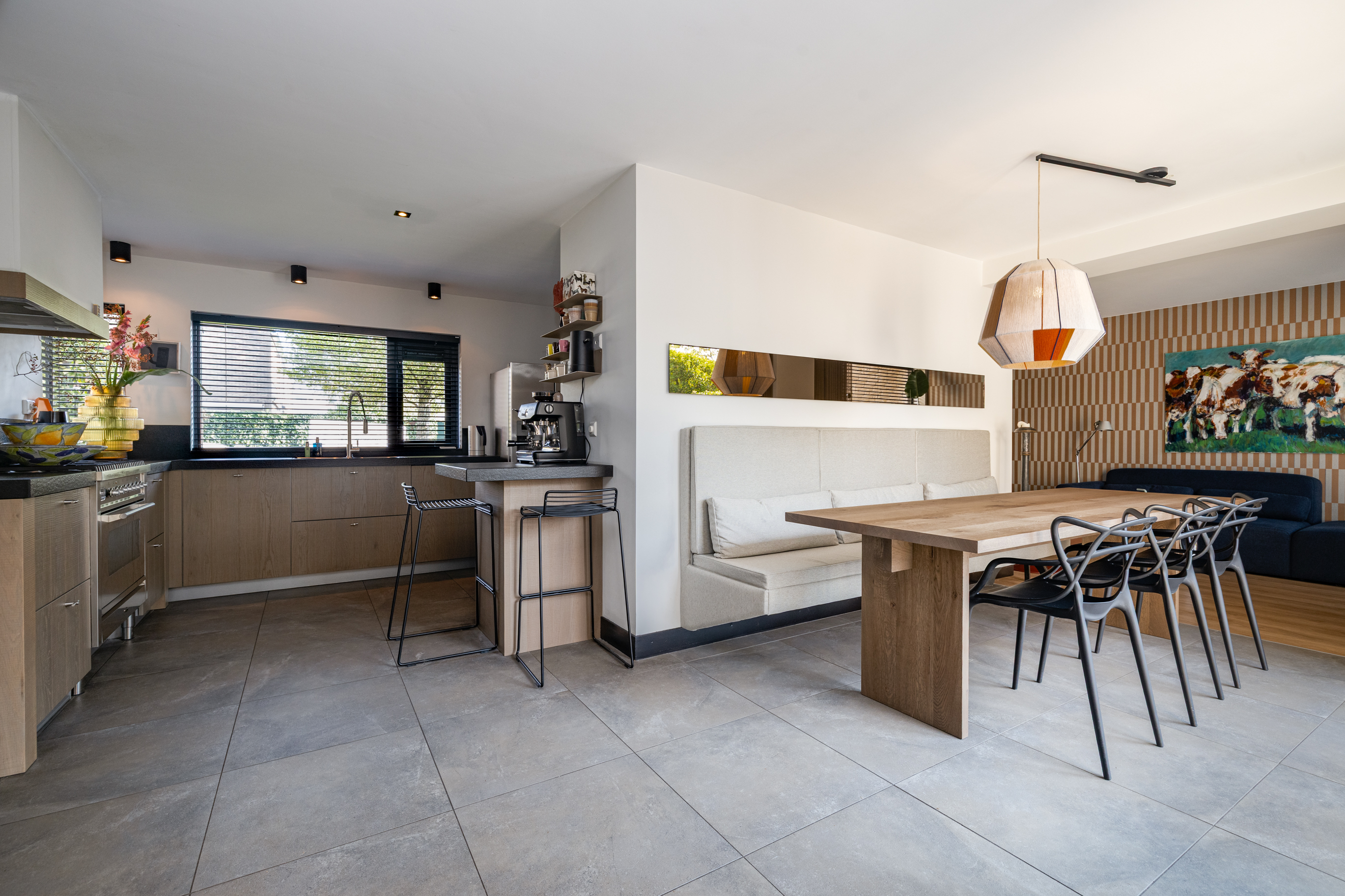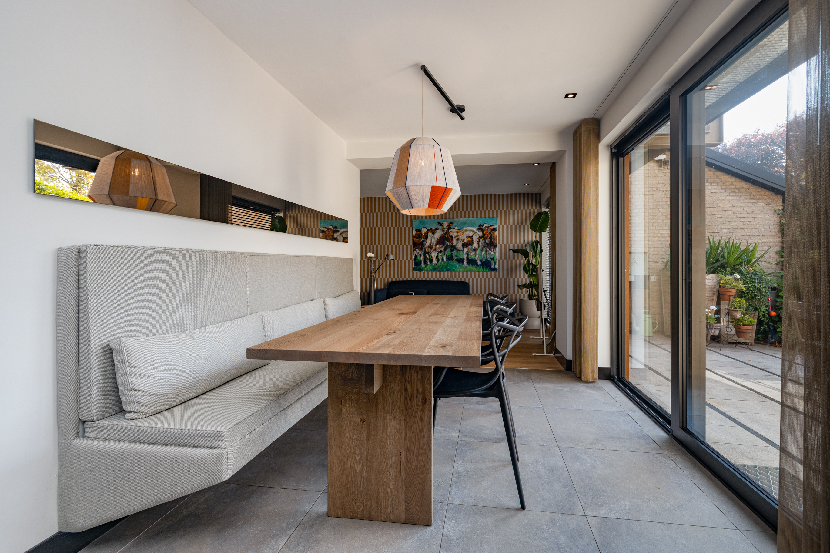 Via het eetkamergedeelte (met vaste bank aan de muur) heb je een perfecte plek als eetkamer. Hier kan je heerlijk avonden genieten met vrienden/familie. Aansluitend is er toegang tot de extra living/woonkamer in de voormalige garage/schuur. Deze living heeft een ruimtelijke en luxe uitstraling met veel raampartijen en biedt bovendien een rustig hoekje om heerlijk tot rust te komen. Deze ruimte kan ook perfect dienen voor een werkplek of een speelgedeelte voor de kinderen. Een prachtig verlengstuk van de leefruimte. Middels een schuifpui is er eveneens toegang tot de achtertuin.