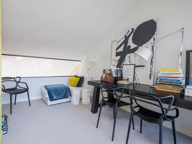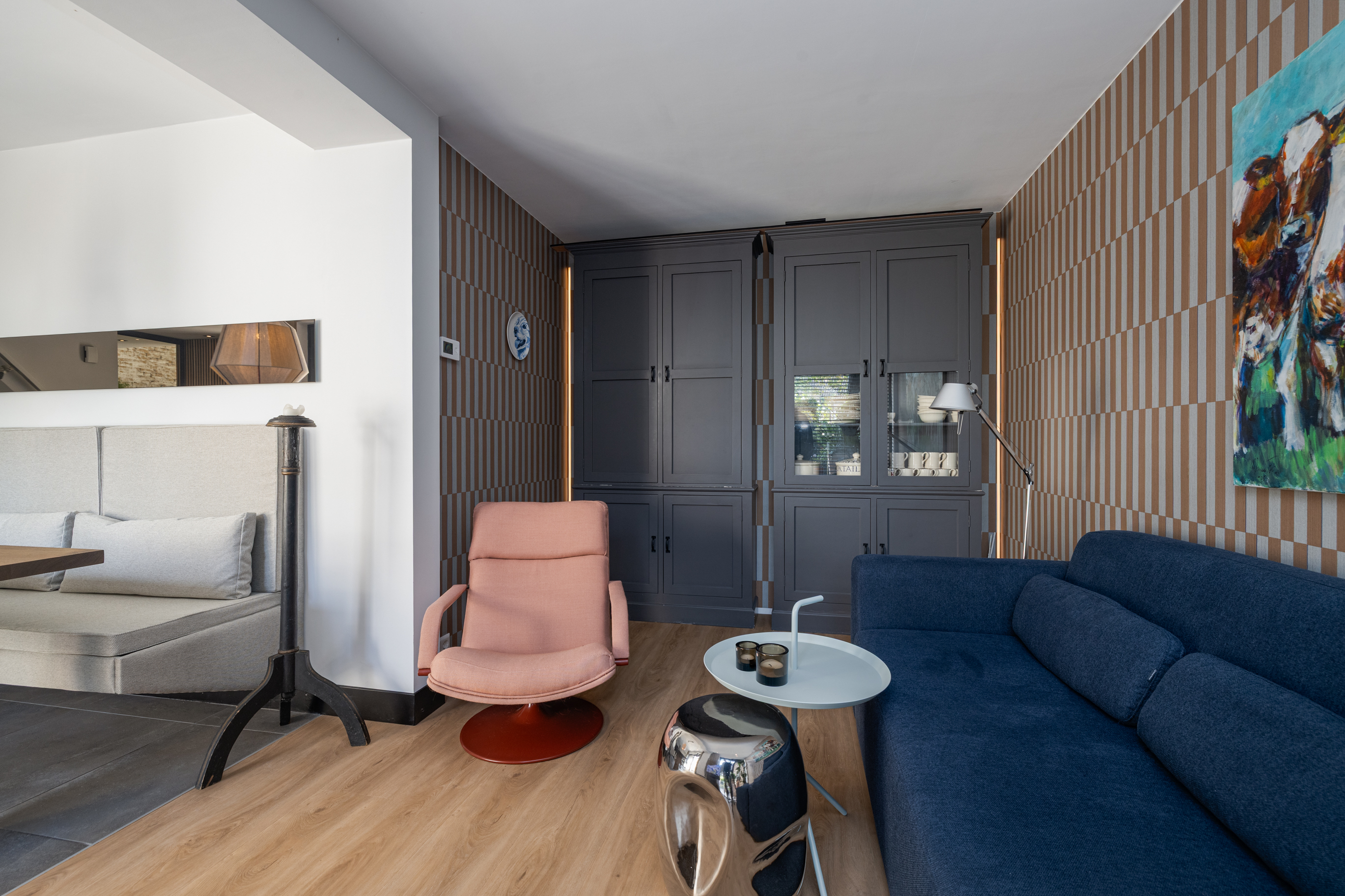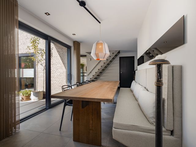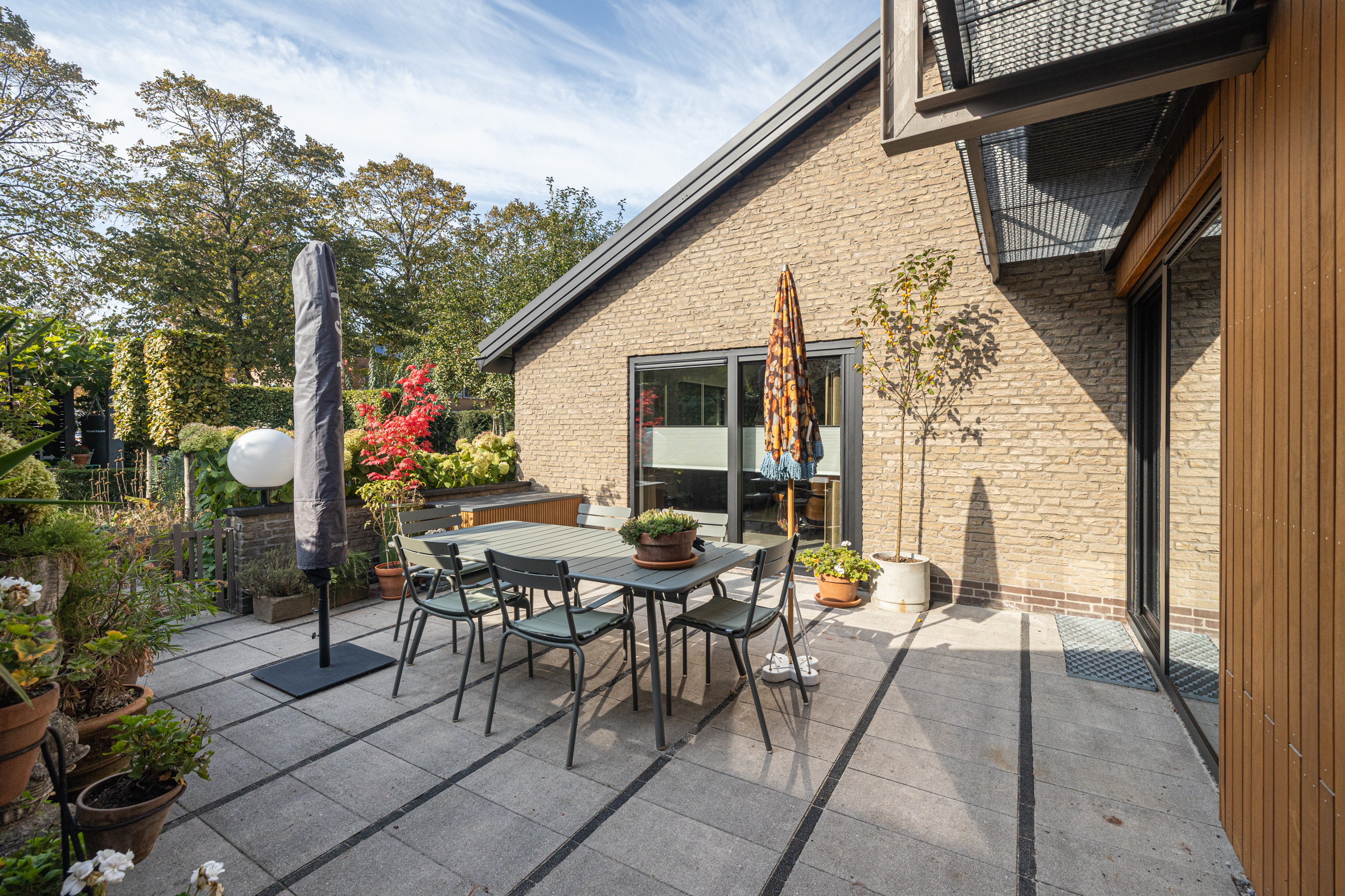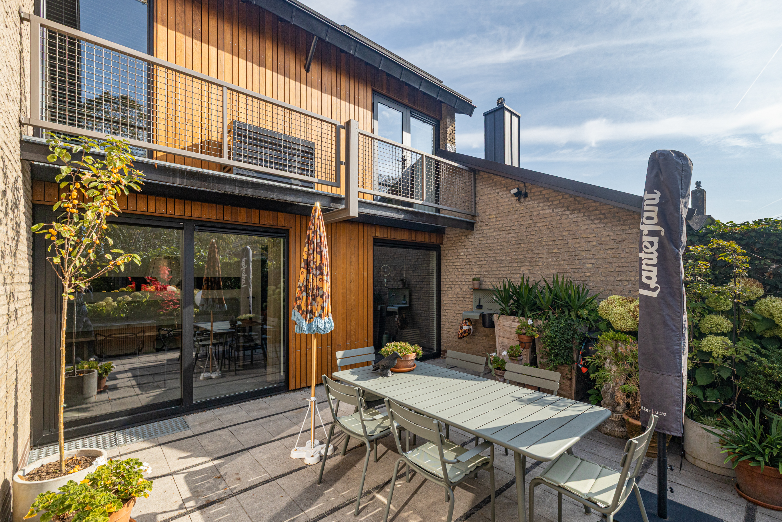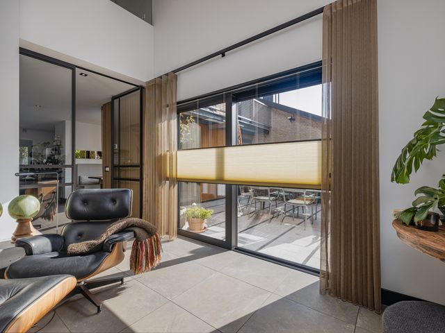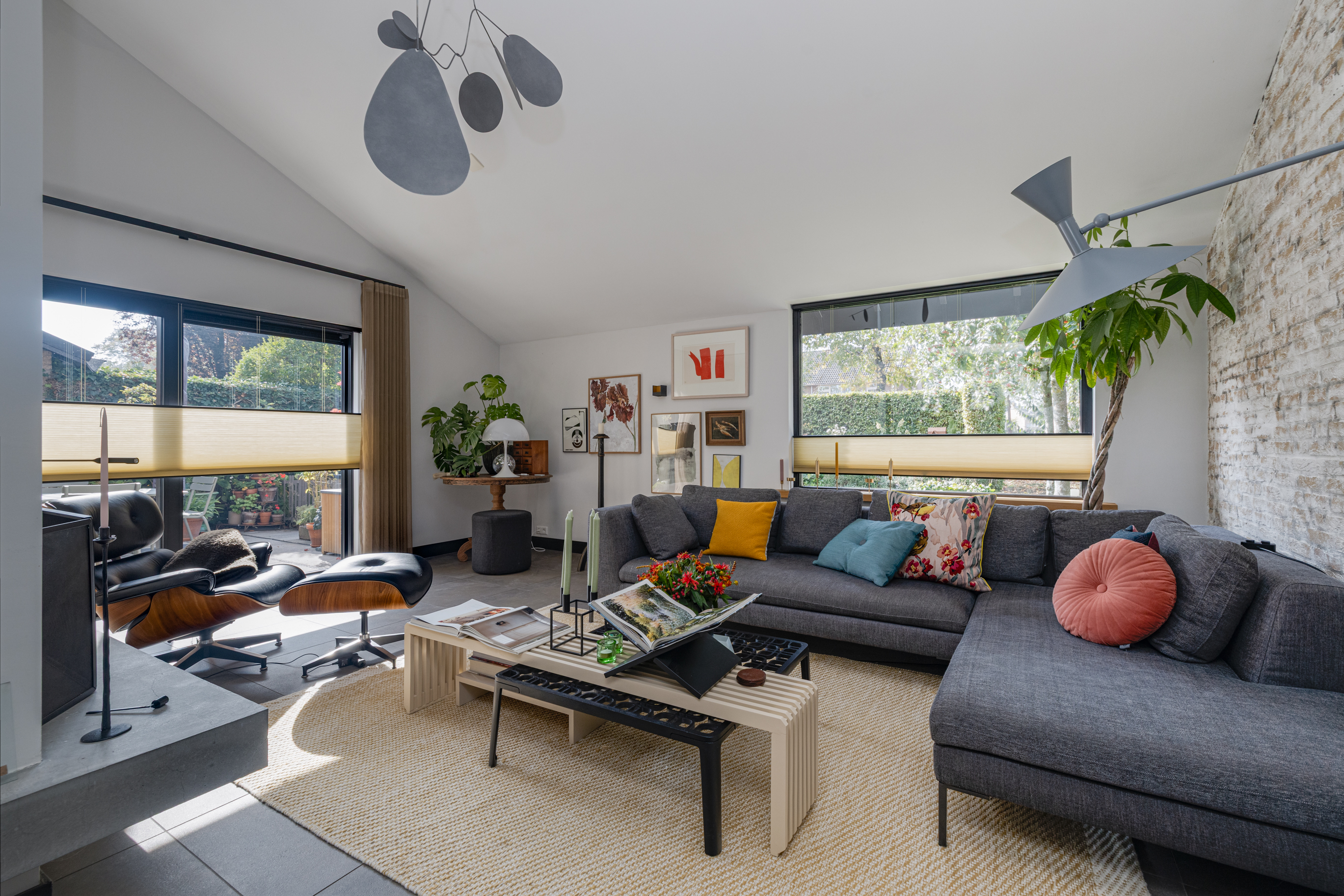 Via het eetkamergedeelte (met vaste bank aan de muur) heb je een perfecte plek als eetkamer. Hier kan je heerlijk avonden genieten met vrienden/familie. Aansluitend is er toegang tot de extra living/woonkamer in de voormalige garage/schuur. Deze living heeft een ruimtelijke en luxe uitstraling met veel raampartijen en biedt bovendien een rustig hoekje om heerlijk tot rust te komen. Deze ruimte kan ook perfect dienen voor een werkplek of een speelgedeelte voor de kinderen. Een prachtig verlengstuk van de leefruimte. Middels een schuifpui is er eveneens toegang tot de achtertuin.