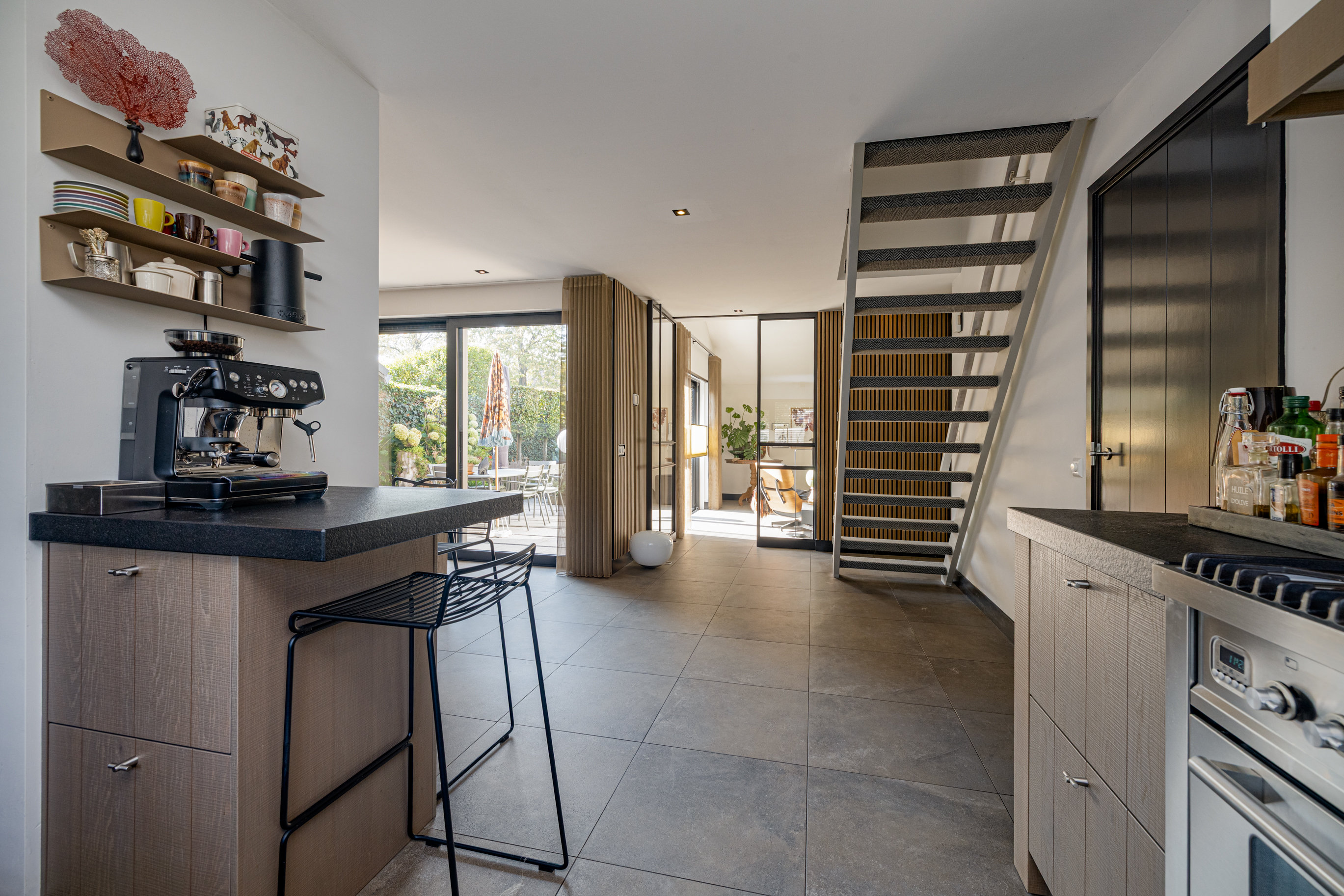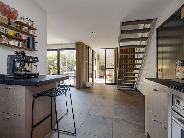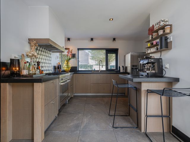De halfopen keuken, gelegen aan de voorzijde van de woning, is modern ingericht en voorzien van diverse inbouwapparatuur, waaronder een kookplaat, oven, afzuigkap en vaatwasser. In de aangrenzende bijkeuken is ruimte voor de wasmachine en droger.