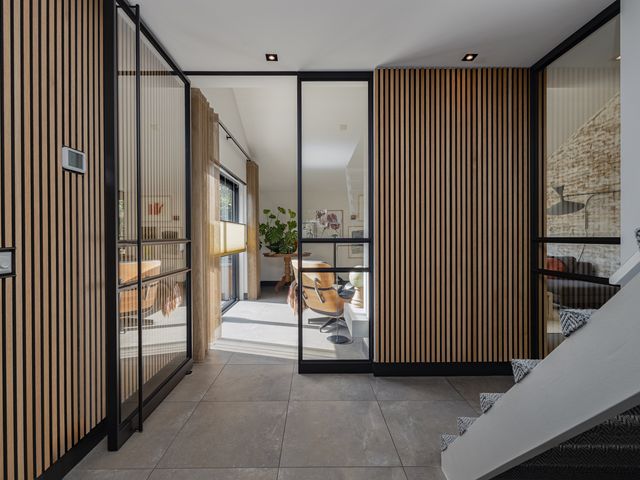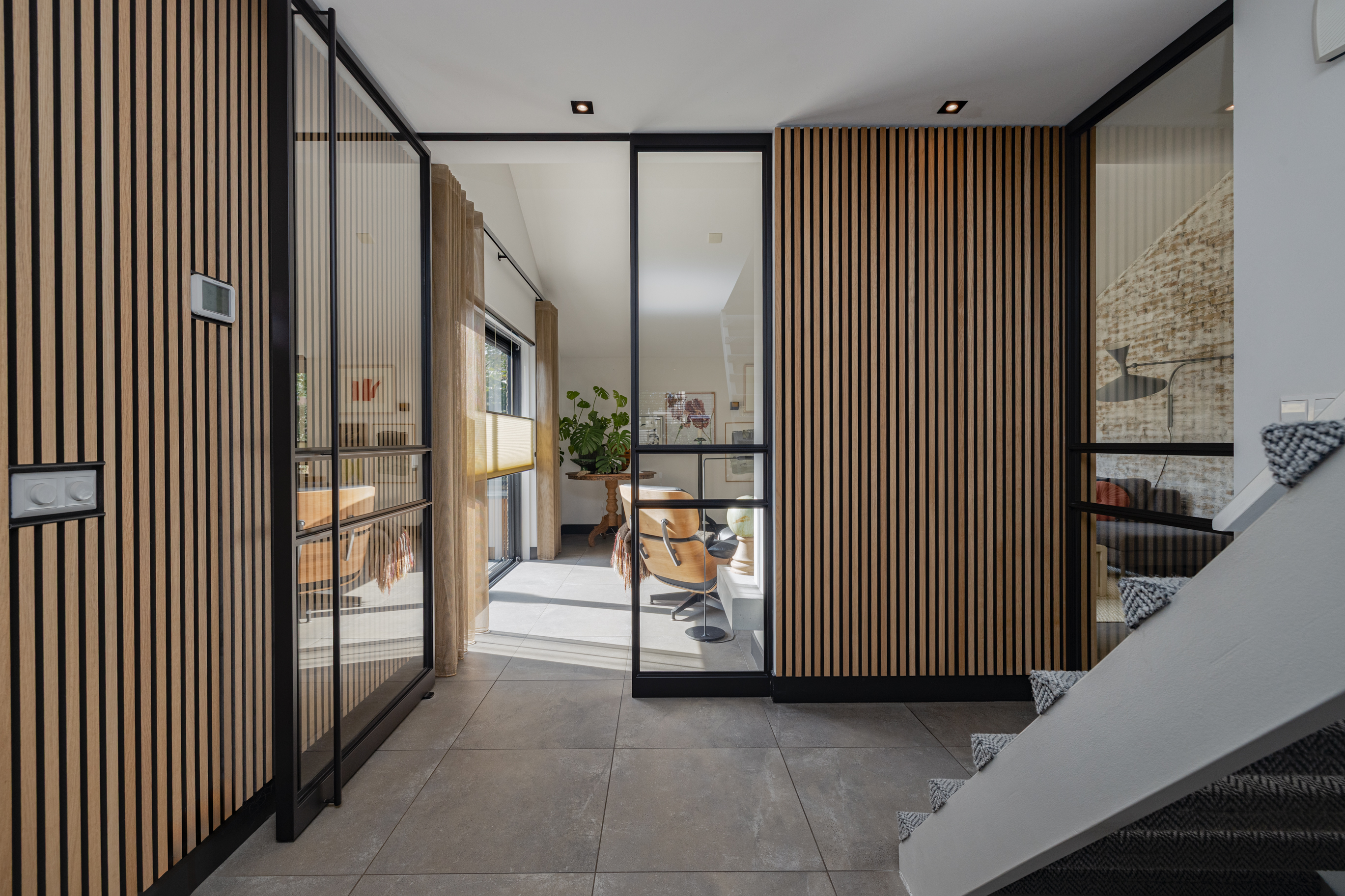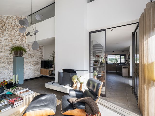 Het toilet is deels betegeld en voorzien van een hangend toilet, een fonteintje en een ingebouwde muurnis voor accessoires of decoratie. Vanuit de gang is er toegang tot het woon-/eetkamergedeelte. De begane grond is luxe en ruimtelijk te noemen. De royale living aan de achterzijde van de woning is voorzien van een open haard, strak gestuukte muren, een moderne inrichting met houten wandpanelen en zwarte stalen deuren. Dit zorgt samen voor een warme en eigentijdse sfeer. Vanuit dit gedeelte is er middels een schuifpui met hor toegang tot de achtertuin. Mede vanwege de glaspartij is er een fijne connectie met de 1e verdieping.