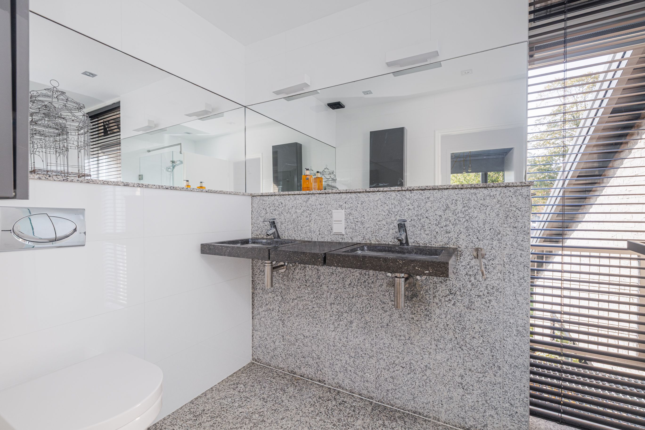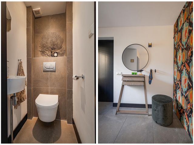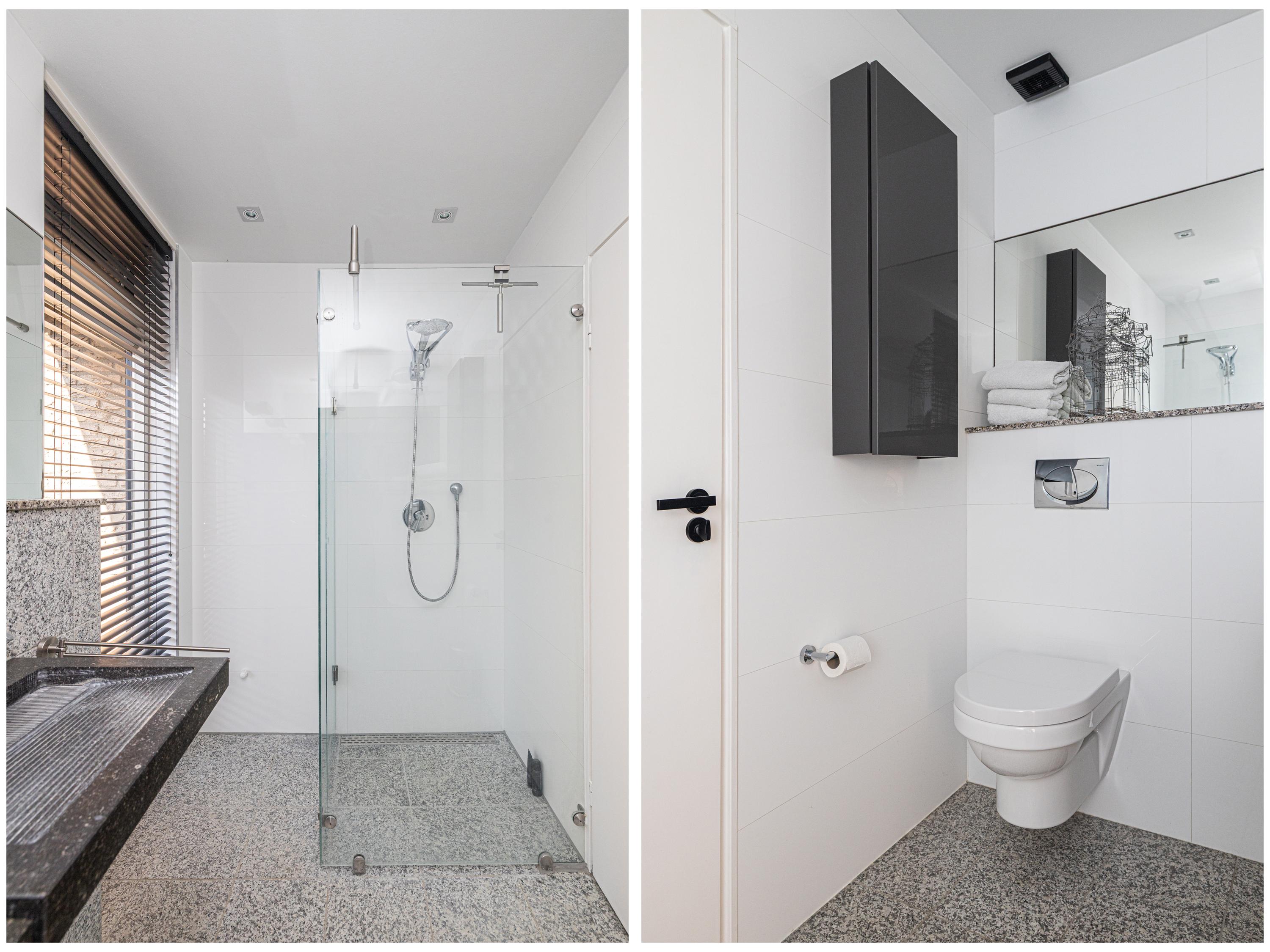 De luxe badkamer is uitgevoerd met een 2e toilet, wastafelmeubel, inloopdouche en is volledig betegeld in een moderne stijl.