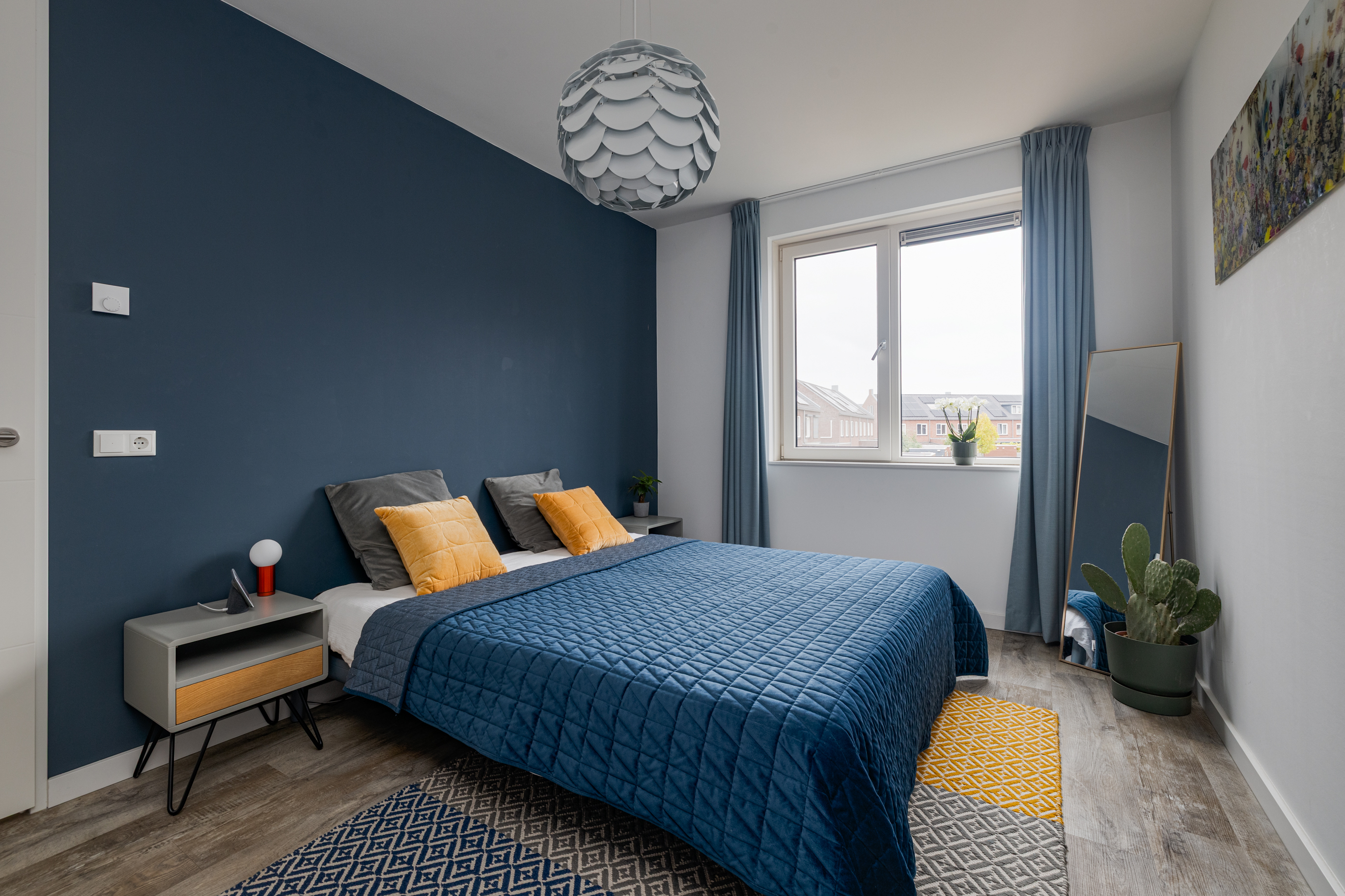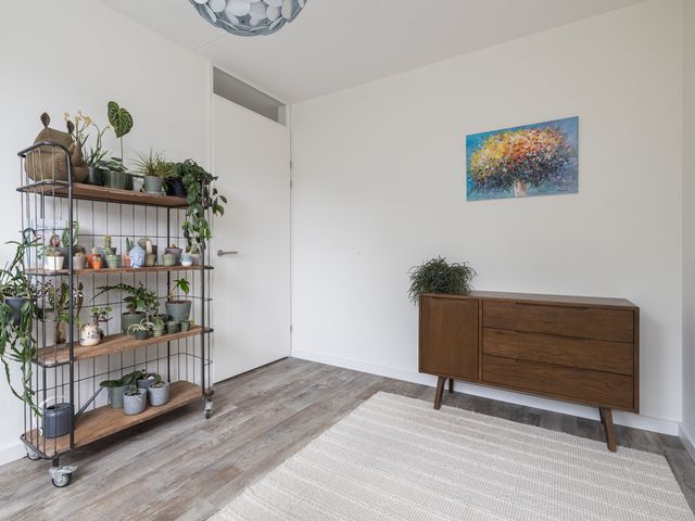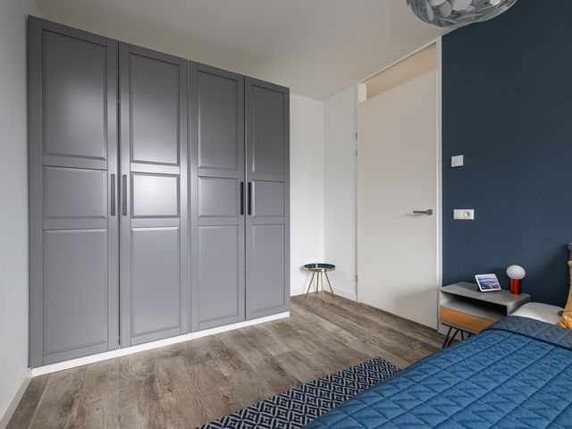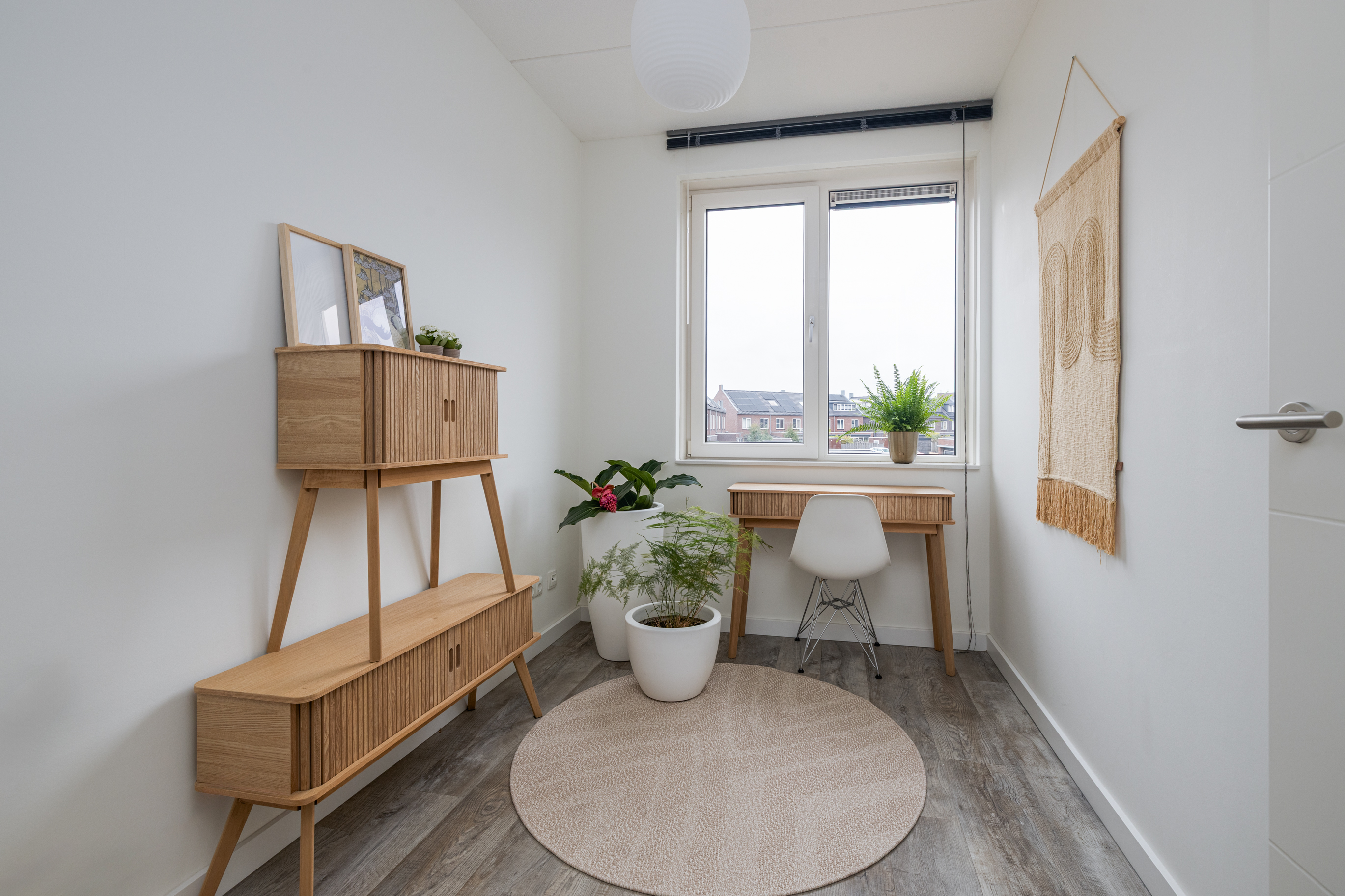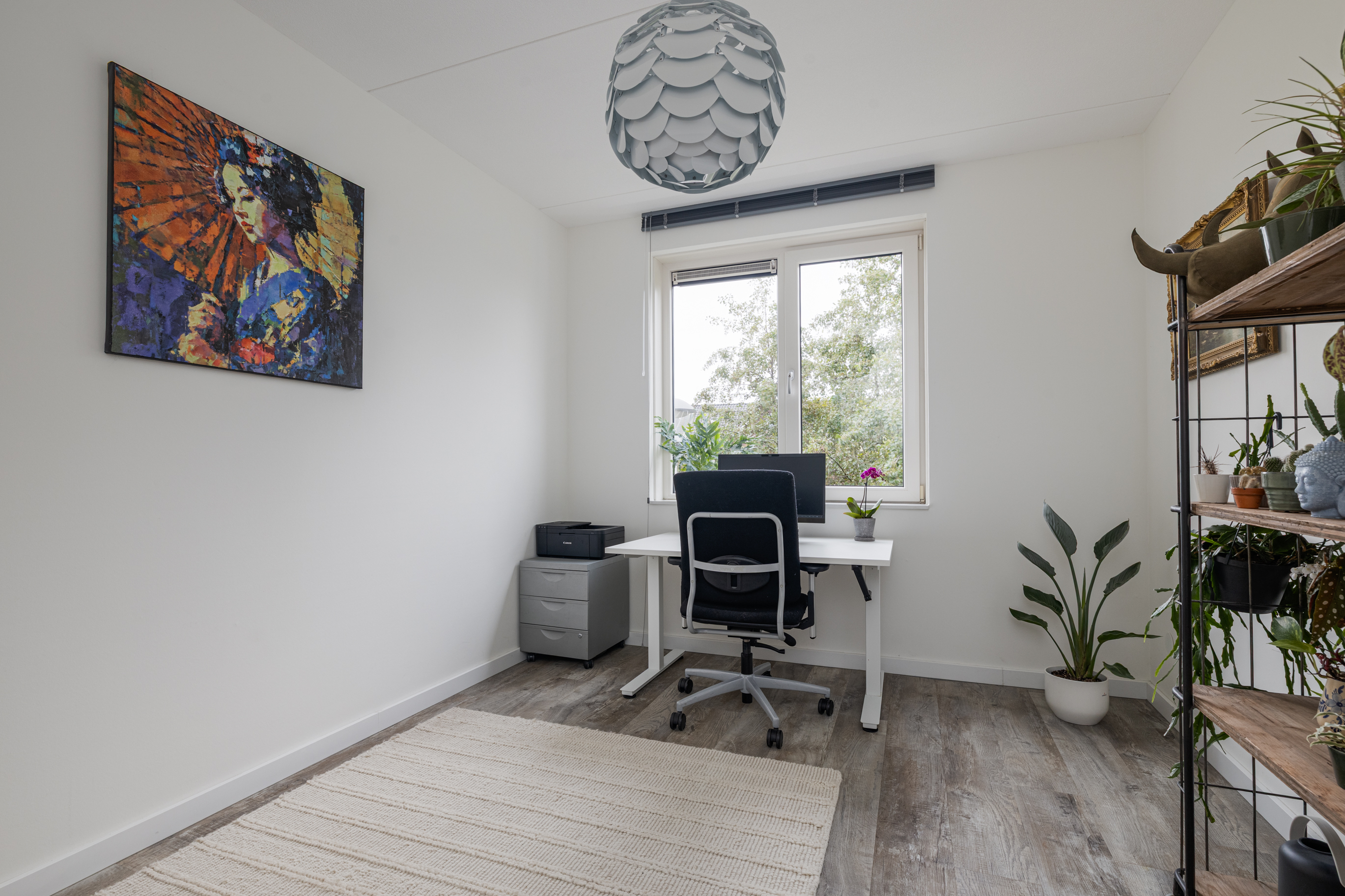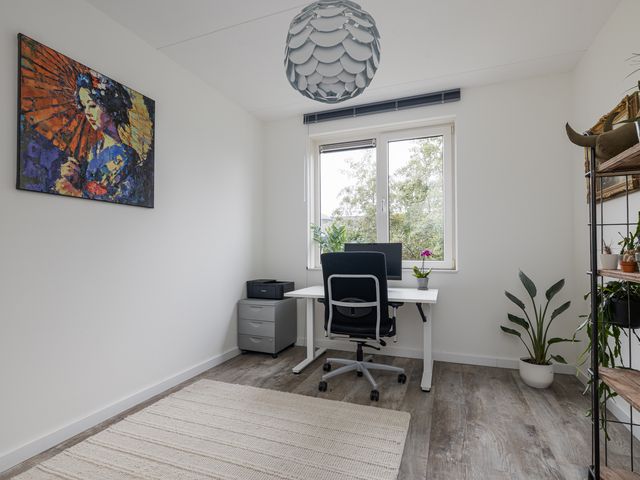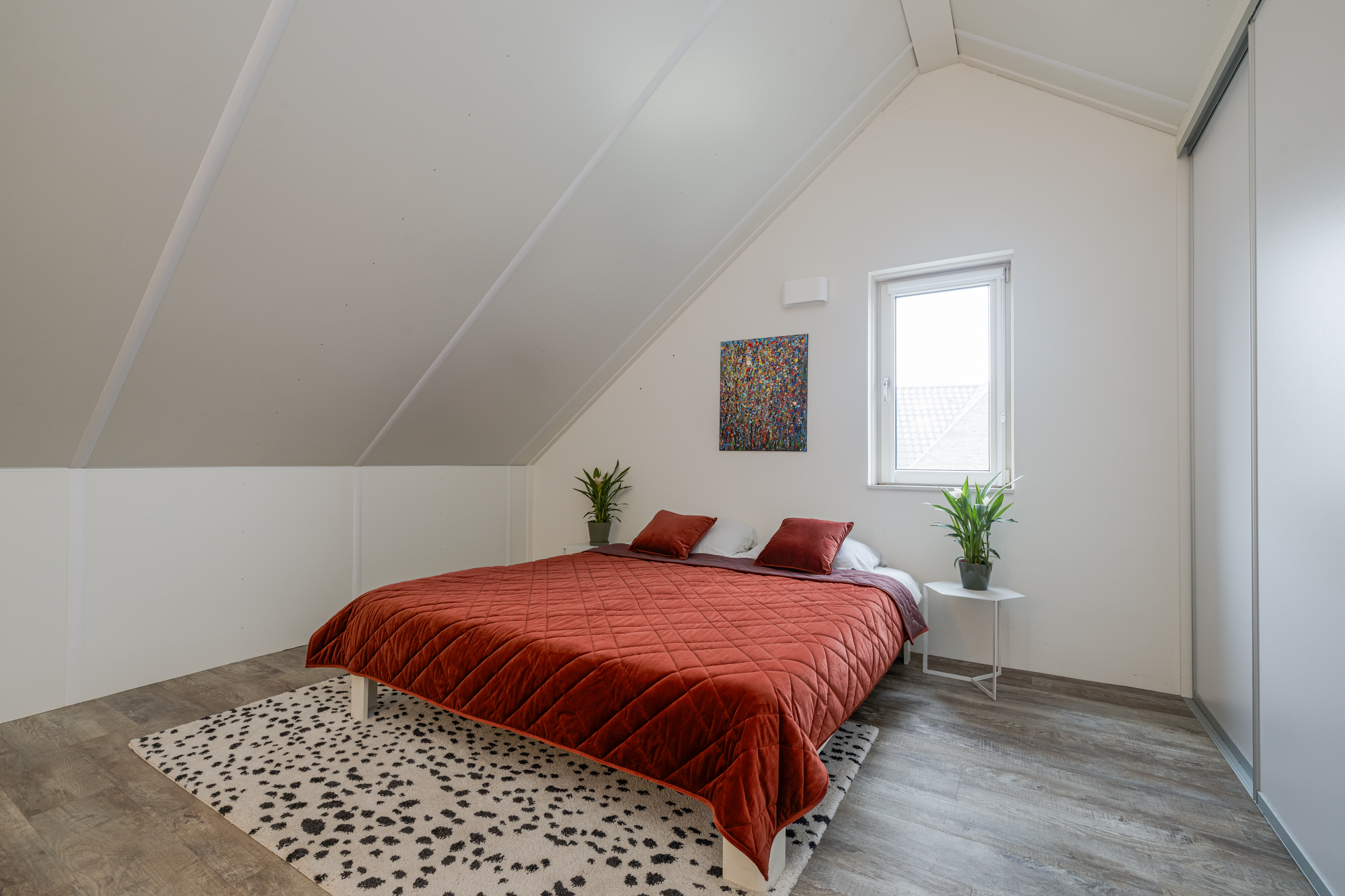 Via de overloop toegang tot drie slaapkamers en de badkamer. De eerste slaapkamer van ca. 6m2 aan de achterzijde is uitstekend geschikt als kinderkamer of werkruimte. De tweede slaapkamer van ca. 15m2 biedt een mooi uitzicht over de tuin, terwijl de derde slaapkamer van ca. 12m2 aan de voorzijde is gelegen. Alle kamers zijn strak en praktisch ingericht, wat een verzorgde indruk geeft.