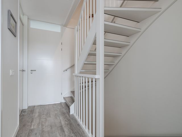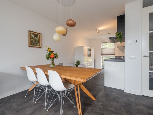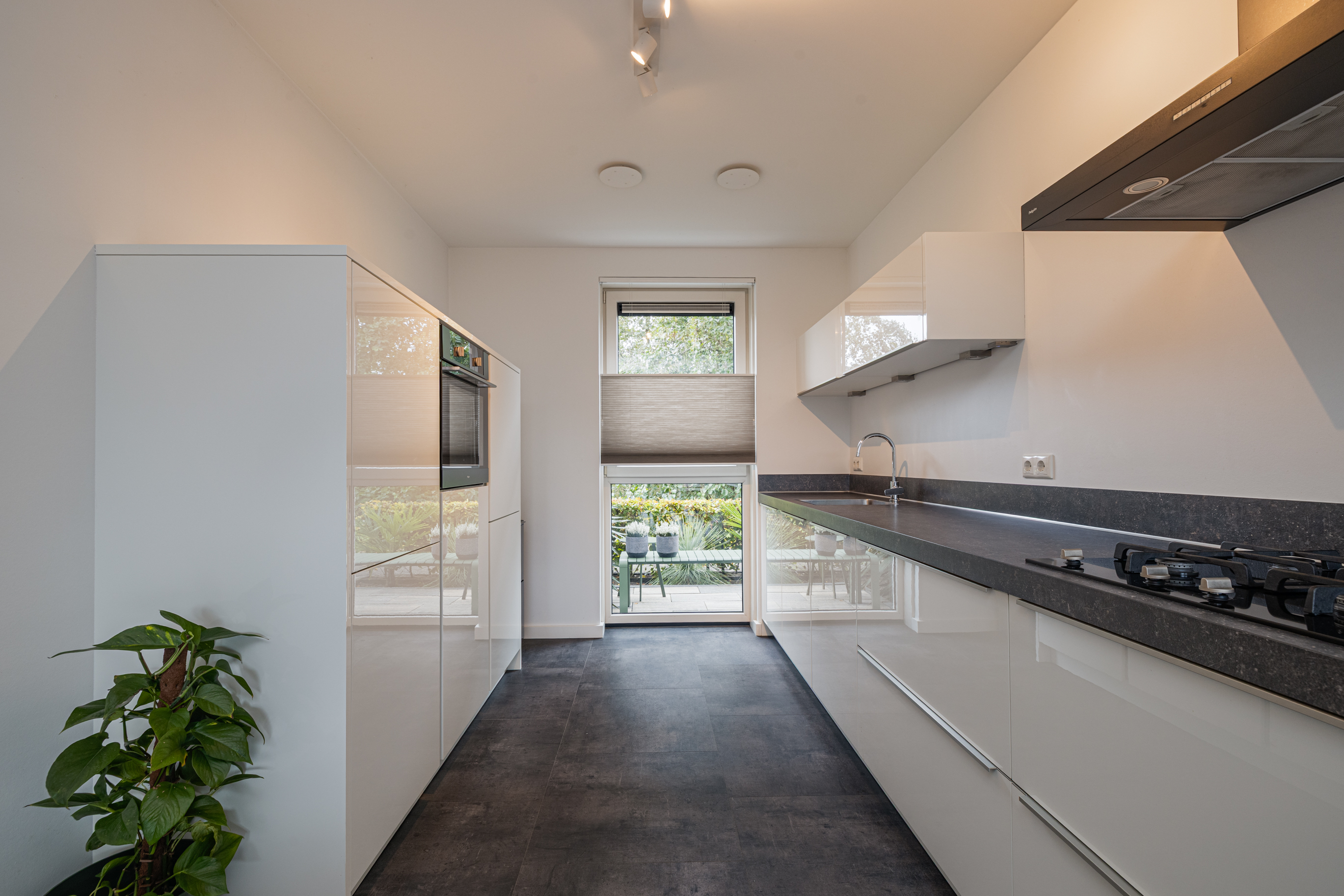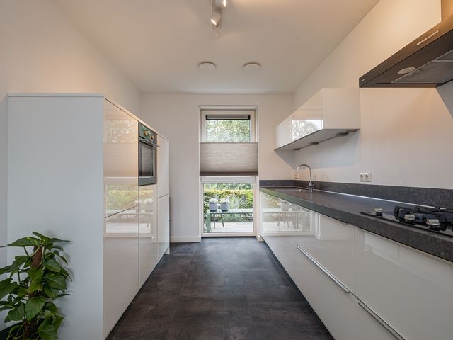 De praktisch en modern ingerichte halfopen keuken van ca. 10m2 is uitgerust met diverse inbouwapparatuur, waaronder een gaskookplaat, koelkast, spoelbak, vaatwasser (2024) en afzuigkap. Dankzij de grote raampartij aan de voorzijde oogt de keuken licht en ruim, wat bijdraagt aan een open en luchtige sfeer over de gehele begane grond.