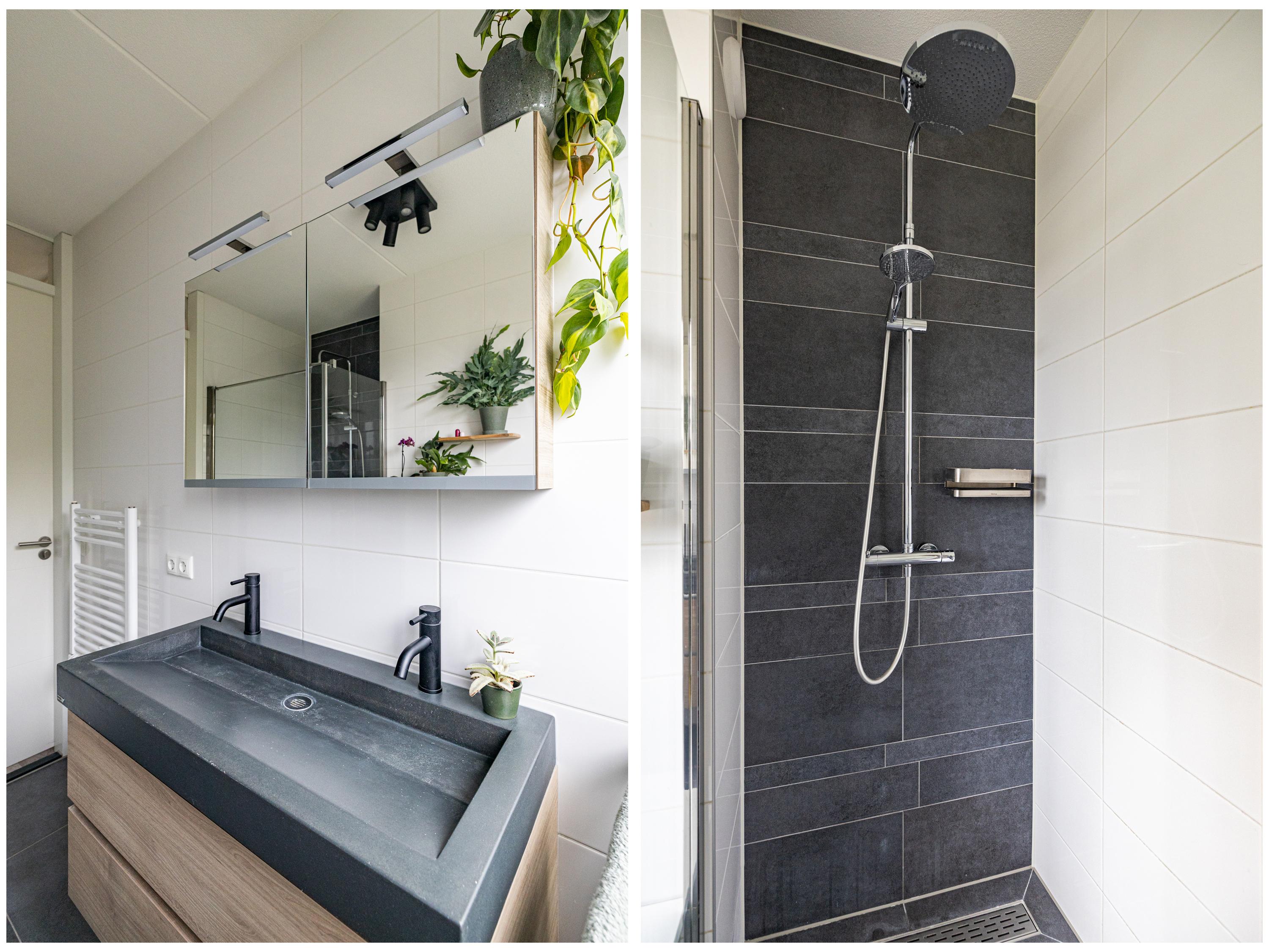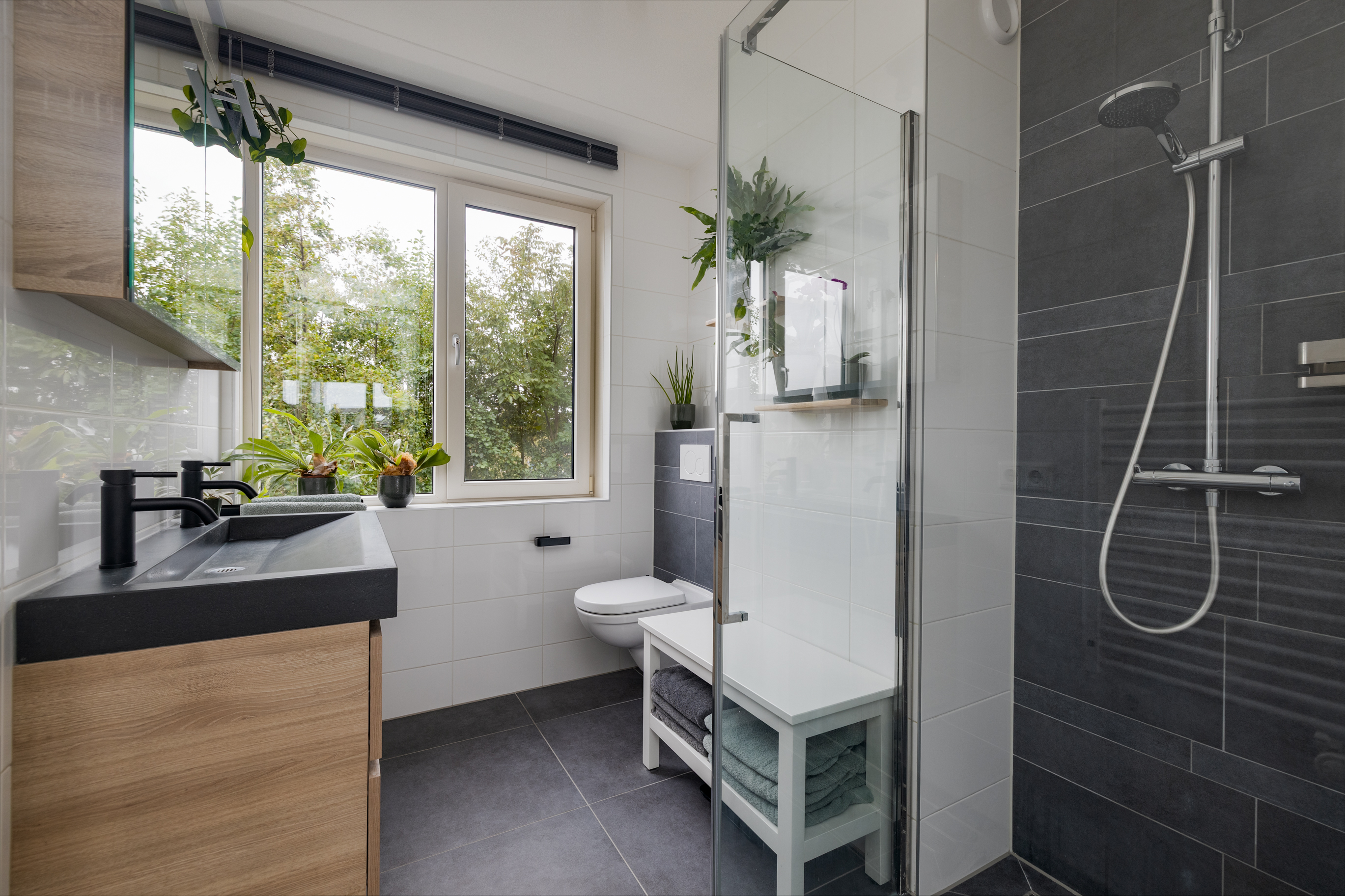 De luxe, moderne badkamer is volledig betegeld en beschikt over een wastafel met meubel met dubbele kranen, een tweede toilet en een ruime inloopdouche, waardoor comfort en stijl perfect samenkomen. De badkamer is geheel betegeld en voorzien van een grote raampartij.