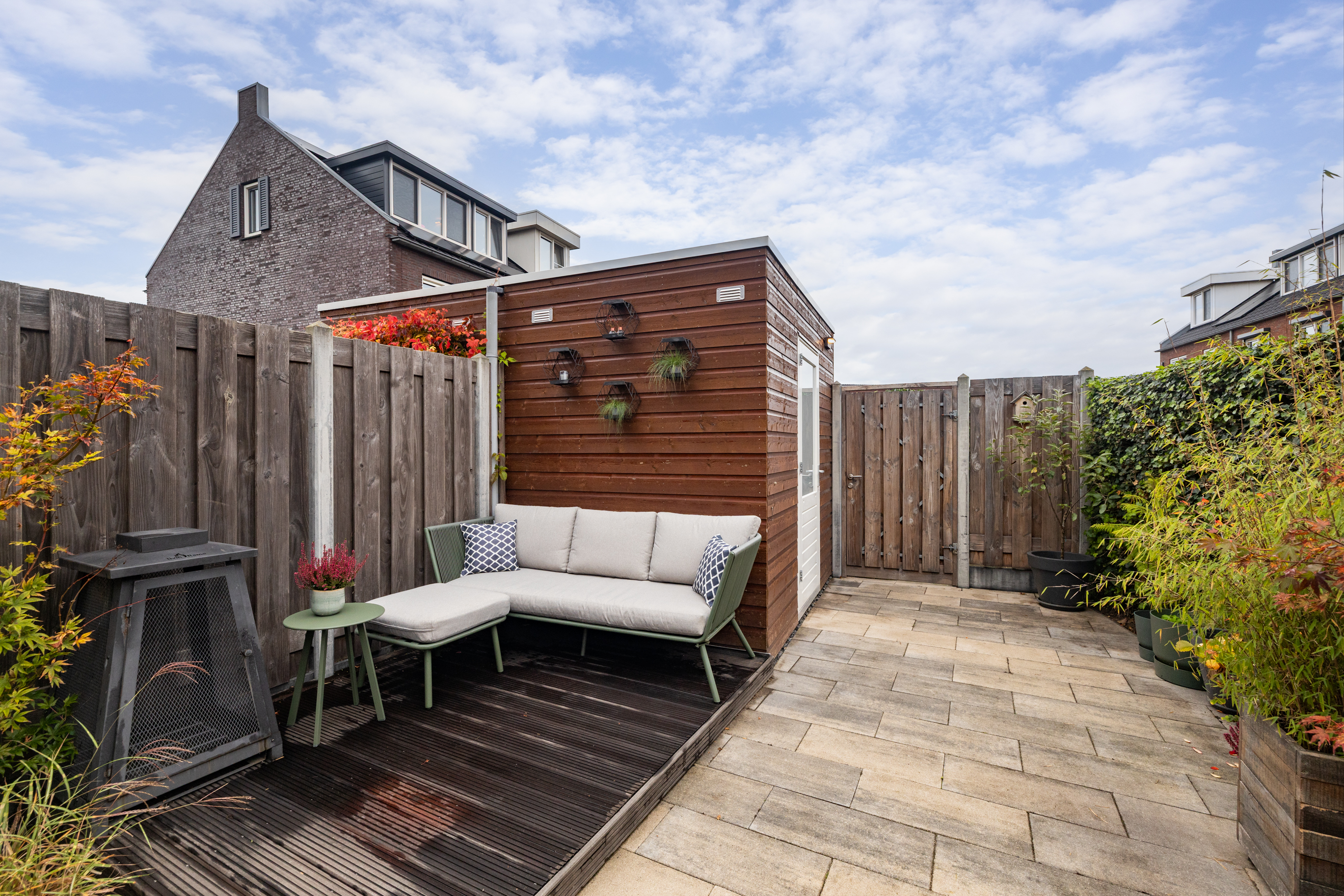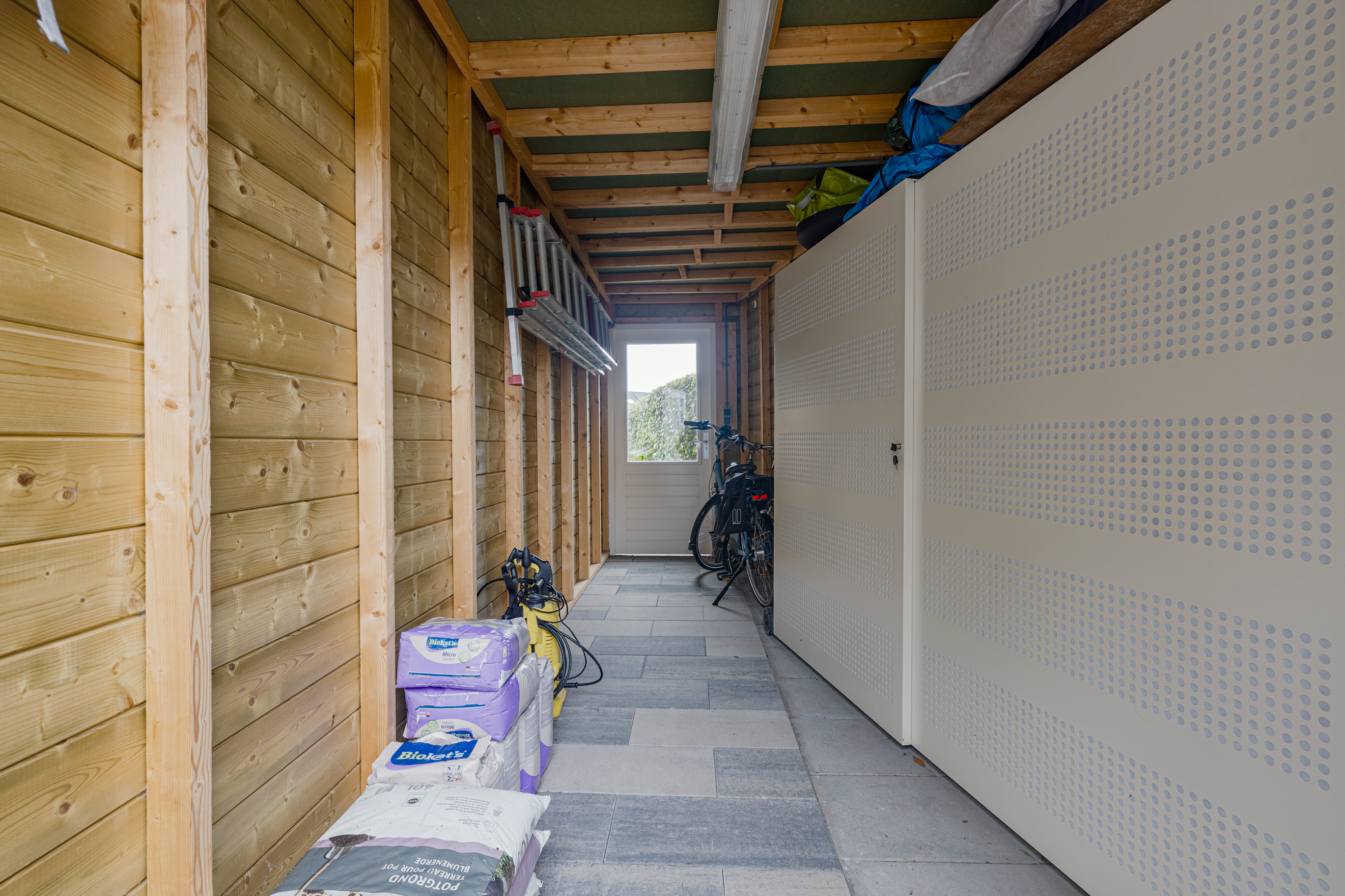 Achterin de tuin bevindt zich de houten schuur en via de zijomloop van de tuin is een tweede schuur bereikbaar, toegankelijk vanaf de voorzijde van de woning.