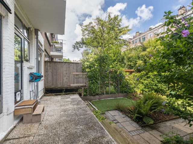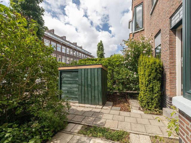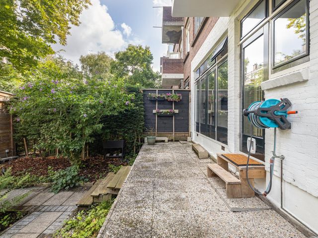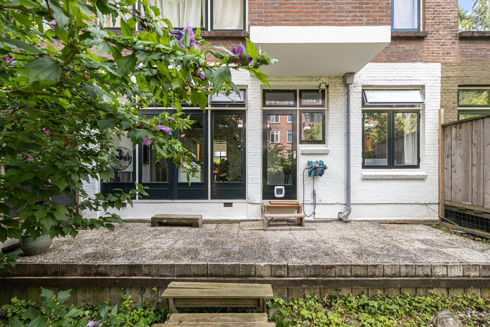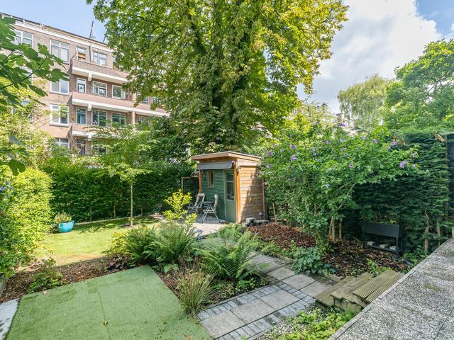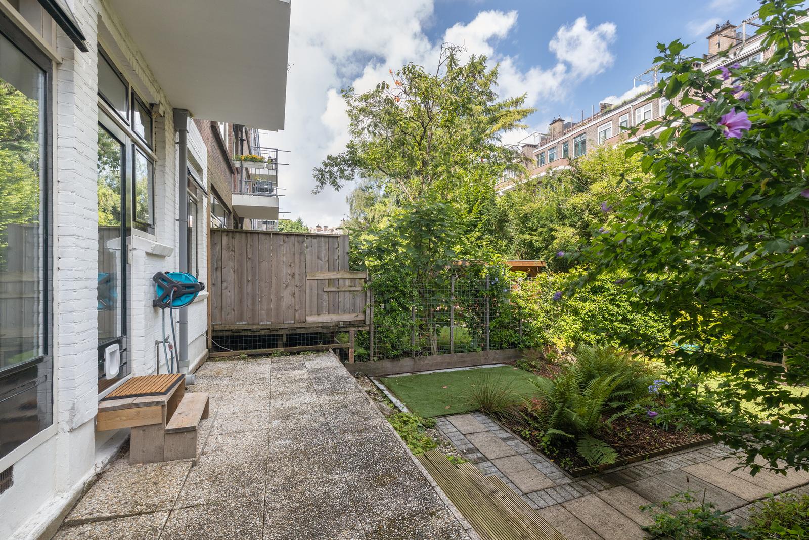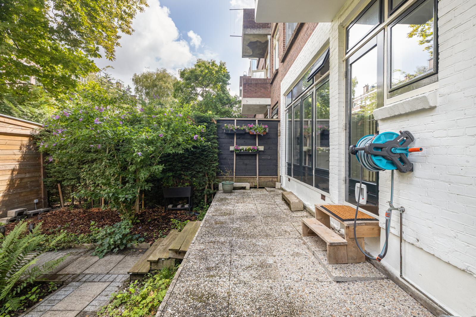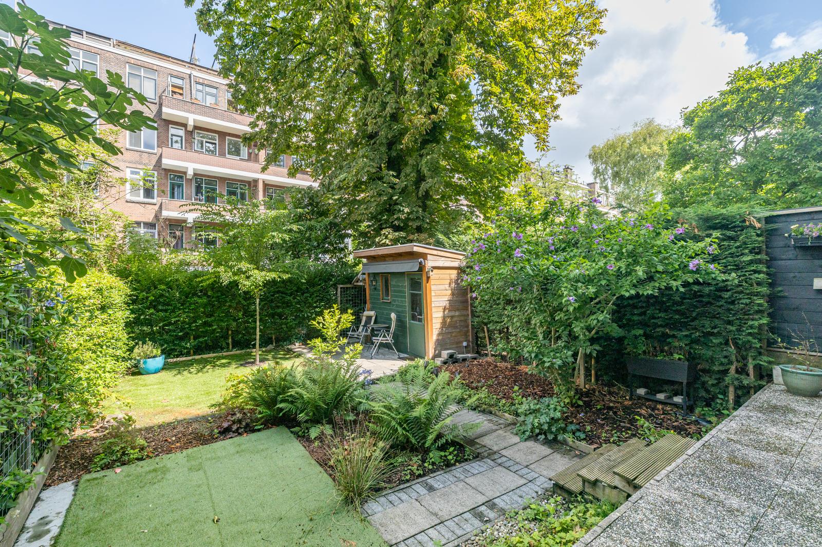 Via openslaande deuren bereik je het terras en de heerlijke achtertuin. Het terras is ca. 2 meter diep en de tuin ca. 9,65 meter diep. Beide hebben een riante breedte van ca. 7,90 meter. Heerlijke groene tuin met privacy, een prachtige kastanjeboom en een houten berging.
