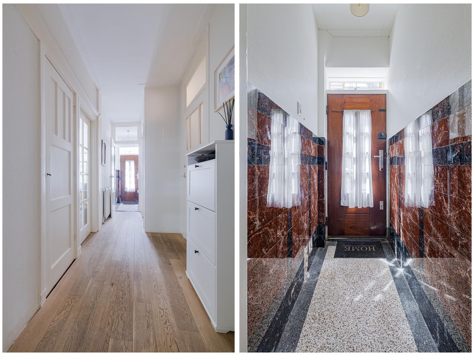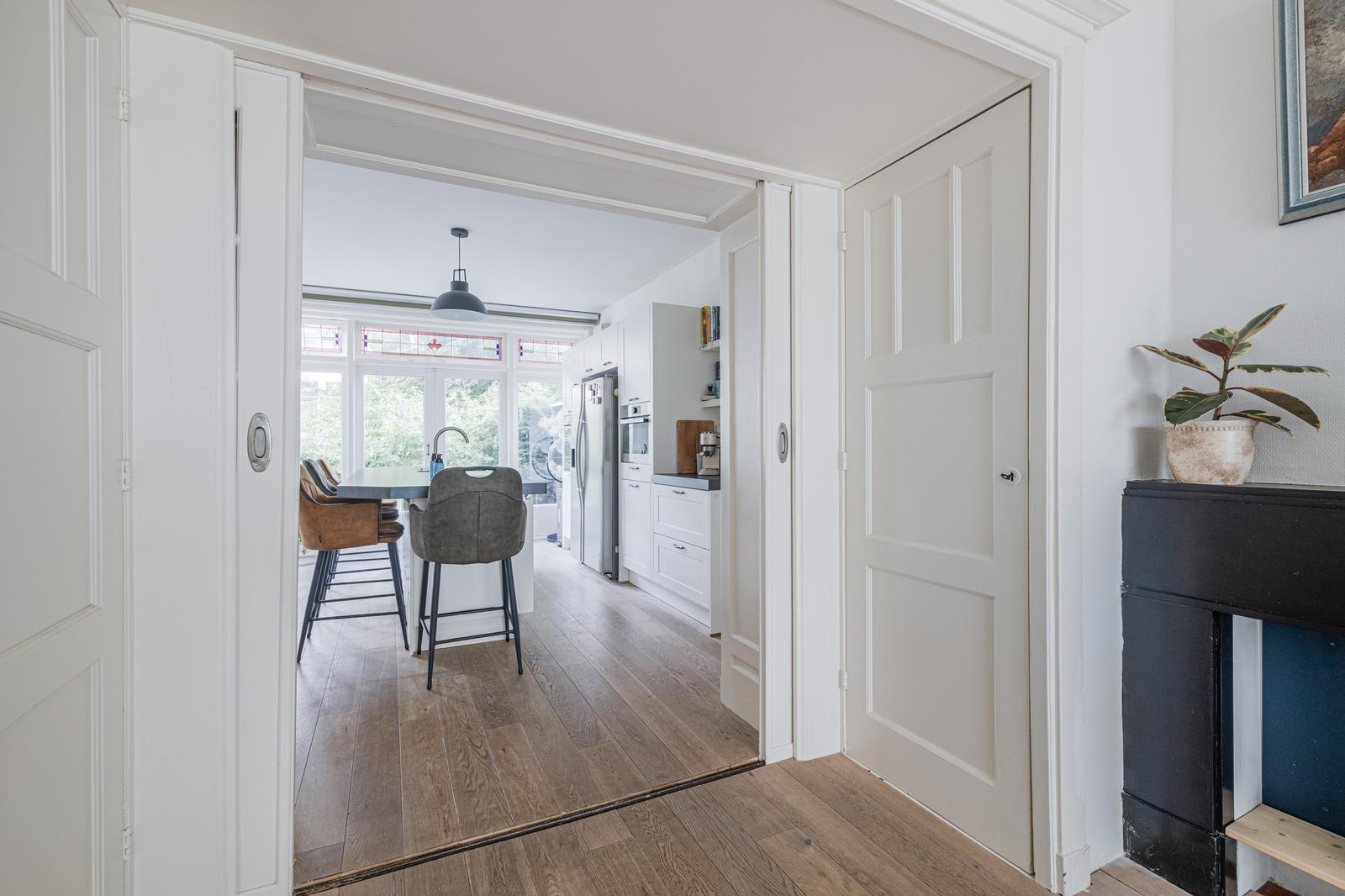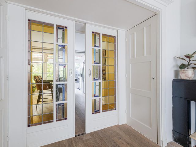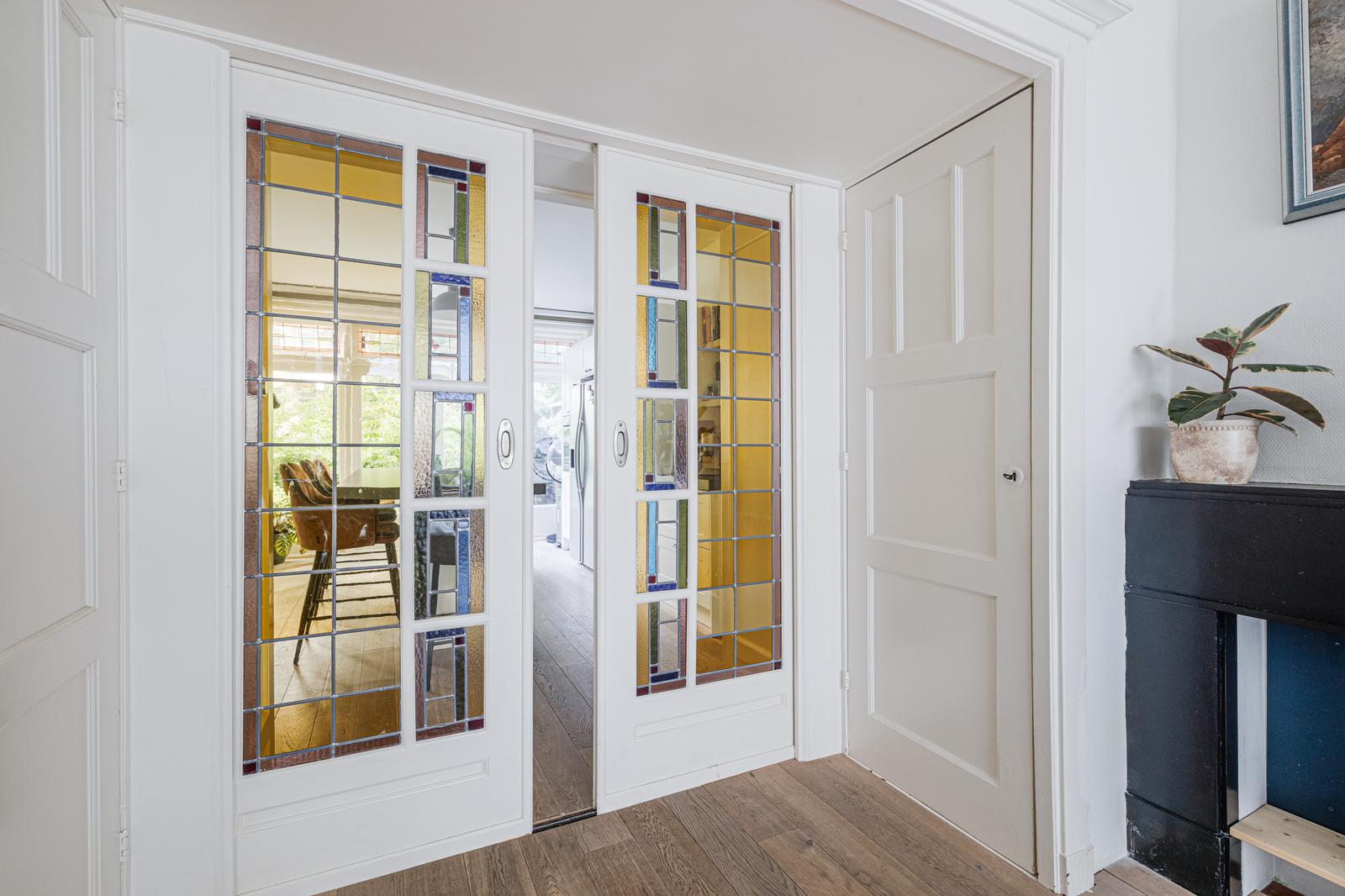 Entree in de hal met toegang tot alle vertrekken. Wij beginnen in de woonkamer, terig te vinden aan je rechter hand. De woonkamer van ca. 18m2 is lekker licht en knus. Aan de voorzijde tref je een karakteristieke erker voorzien van aluminium kozijnen met trippel glas. Via de originele glas-in-lood schuifdeuren, een echte eyecatcher van het huis, loop je door naar de keuken.