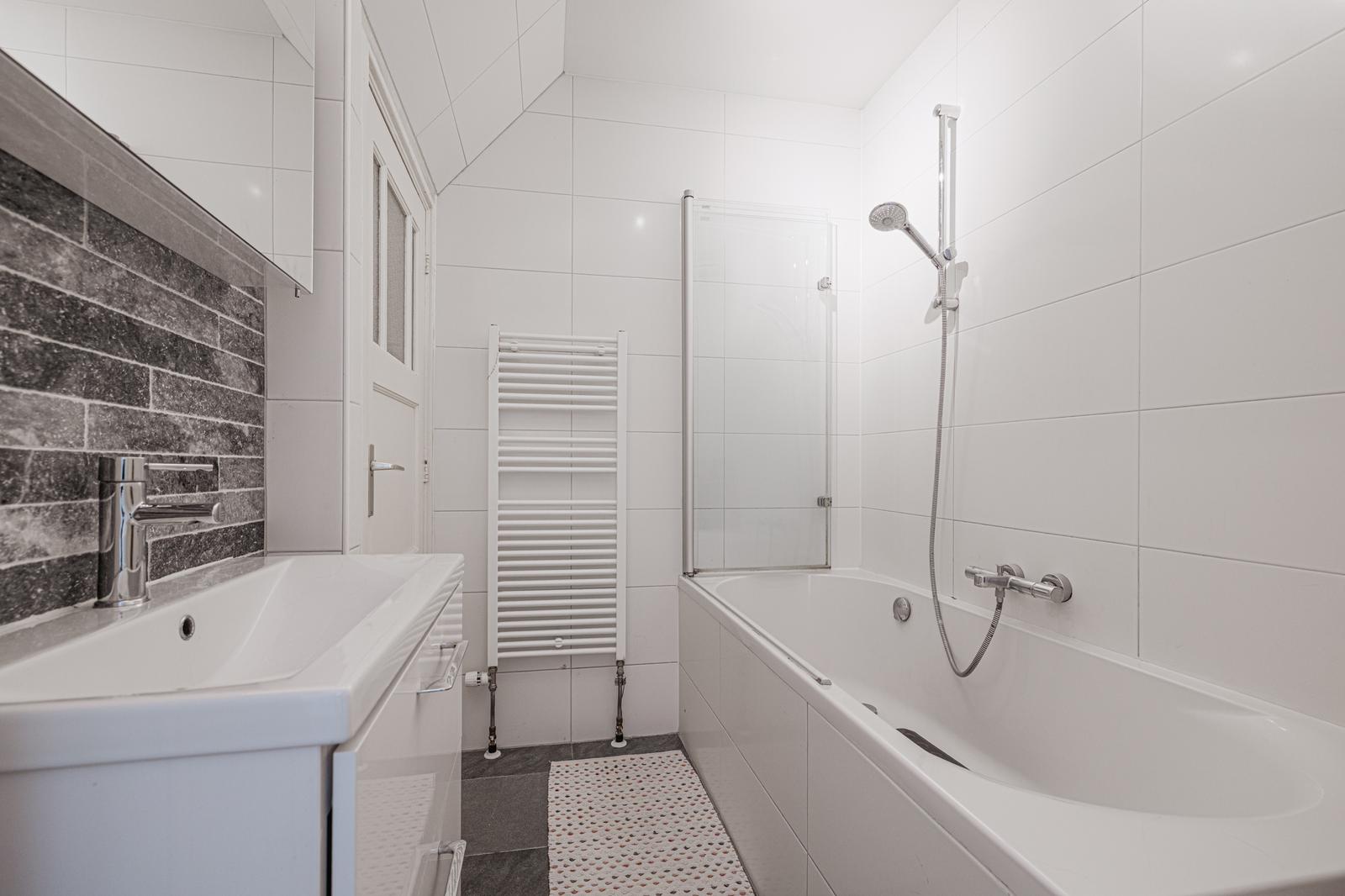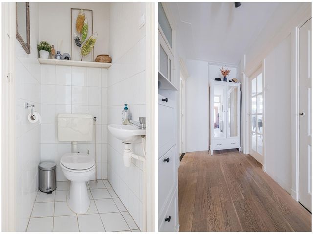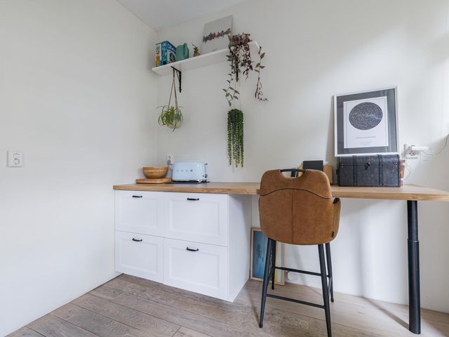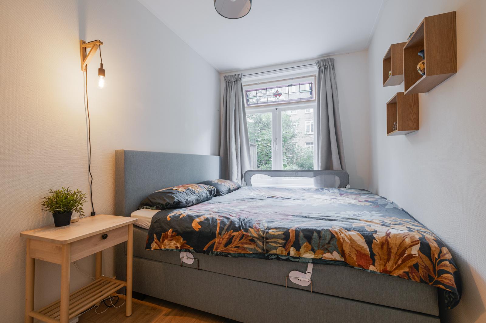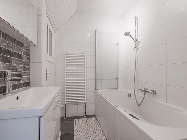 Aan de voorzijde tref je een slaapkamer van ca. 6,5m2 met uitzicht op de voortuin. Bonuspunten voor het souterrain van ca. 12m2 met stahoogte en te openen raam, ideaal als werkplek, extra opslag of chillruimte. Te bereiken middels een deur in de badkamer. De badkamer is in zijn geheel betegeld en uitgevoerd met een ligbad, badkamermeubel met wastafel en een handdoeken radiator. Het toilet is apart gesitueerd naast de badkamer. Aan de achterzijde tref je de slaapkamer van ca. 8,6m2 met vaste kast.