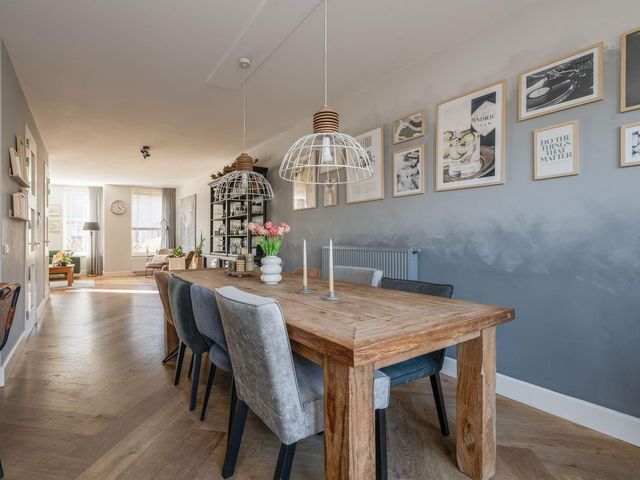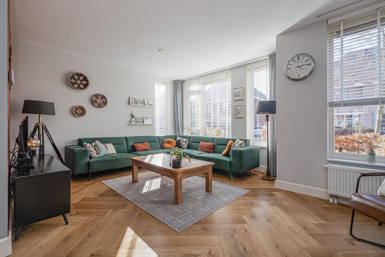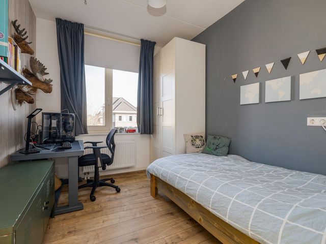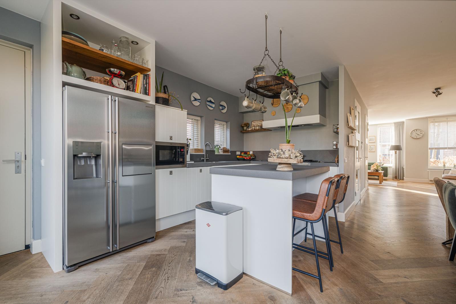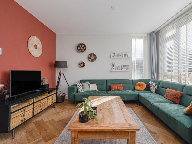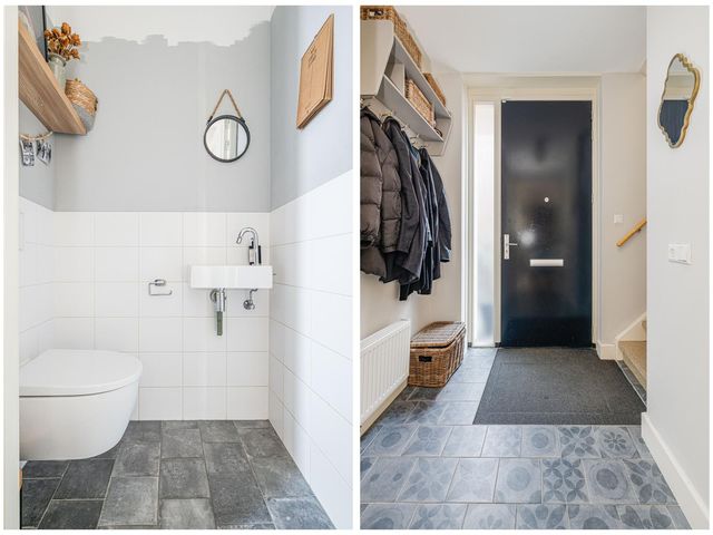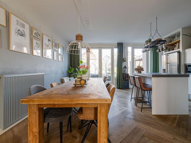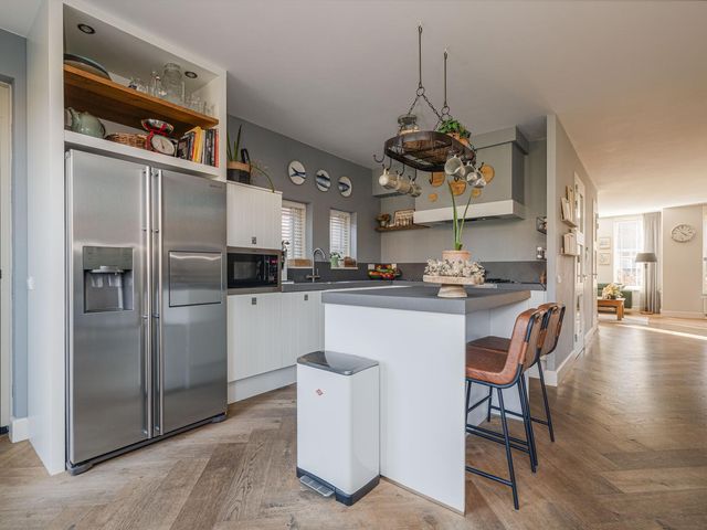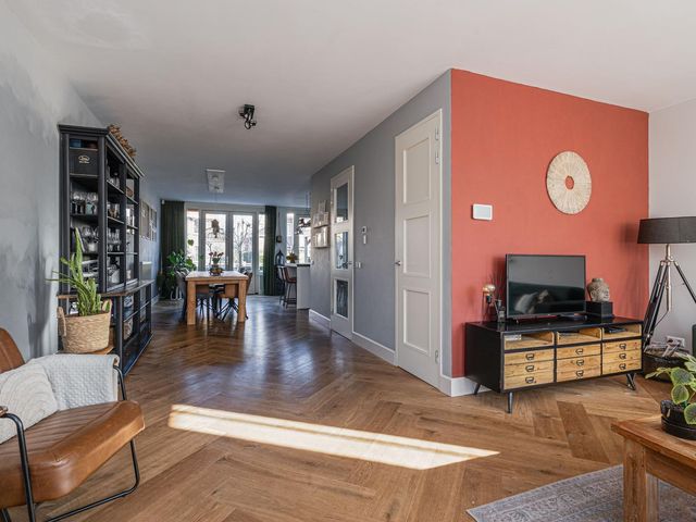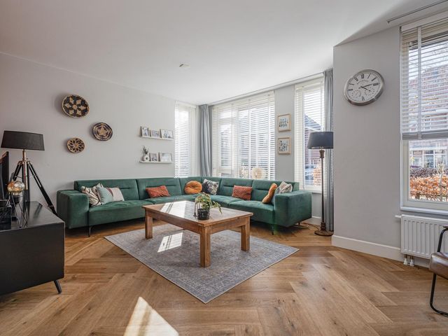 Ruime voortuin met parkeergelegenheid voor twee auto’s op eigen terrein. Entree in de hal met separaat toilet met fonteintje, trapopgang naar de eerste verdieping en toegang tot de royale living. De moderne, L-vormige keuken is voorzien van een bar en biedt voldoende ruimte voor een gezellige eethoek. De gehele living is afgewerkt met een stijlvolle visgraat laminaatvloer.