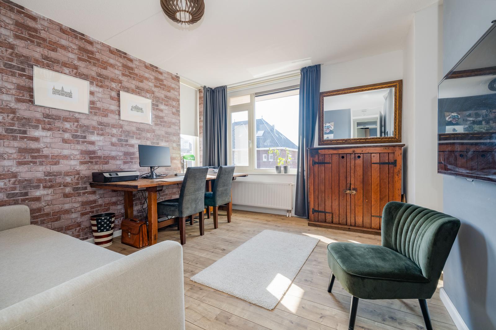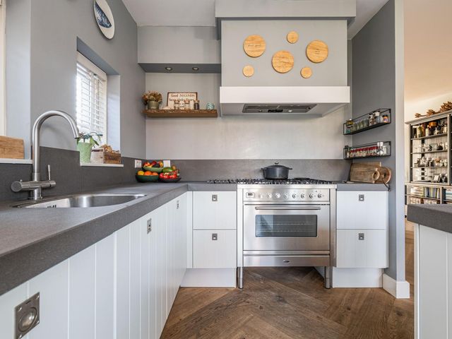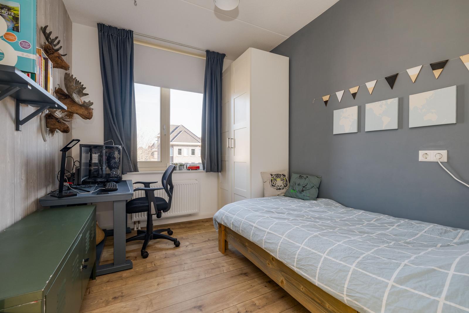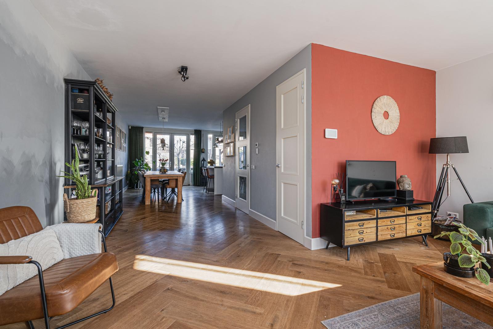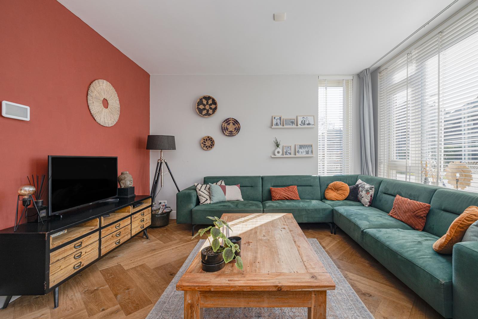 Ruime voortuin met parkeergelegenheid voor twee auto’s op eigen terrein. Entree in de hal met separaat toilet met fonteintje, trapopgang naar de eerste verdieping en toegang tot de royale living. De moderne, L-vormige keuken is voorzien van een bar en biedt voldoende ruimte voor een gezellige eethoek. De gehele living is afgewerkt met een stijlvolle visgraat laminaatvloer.