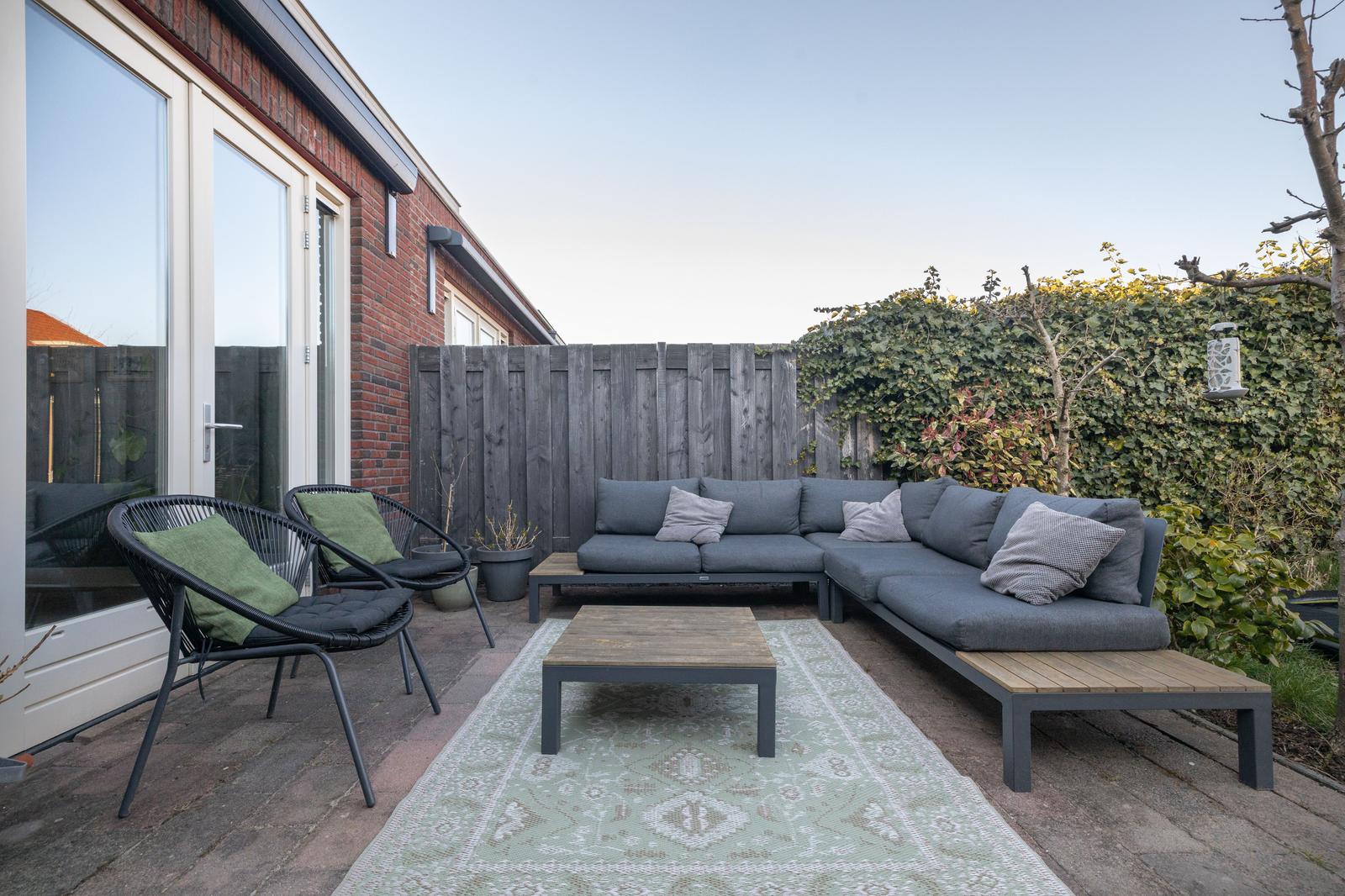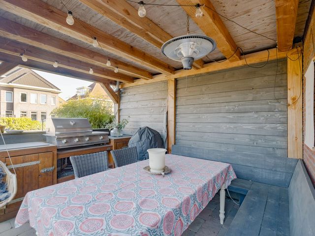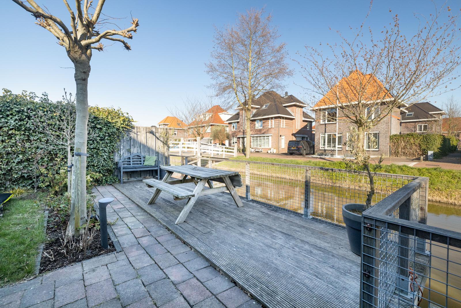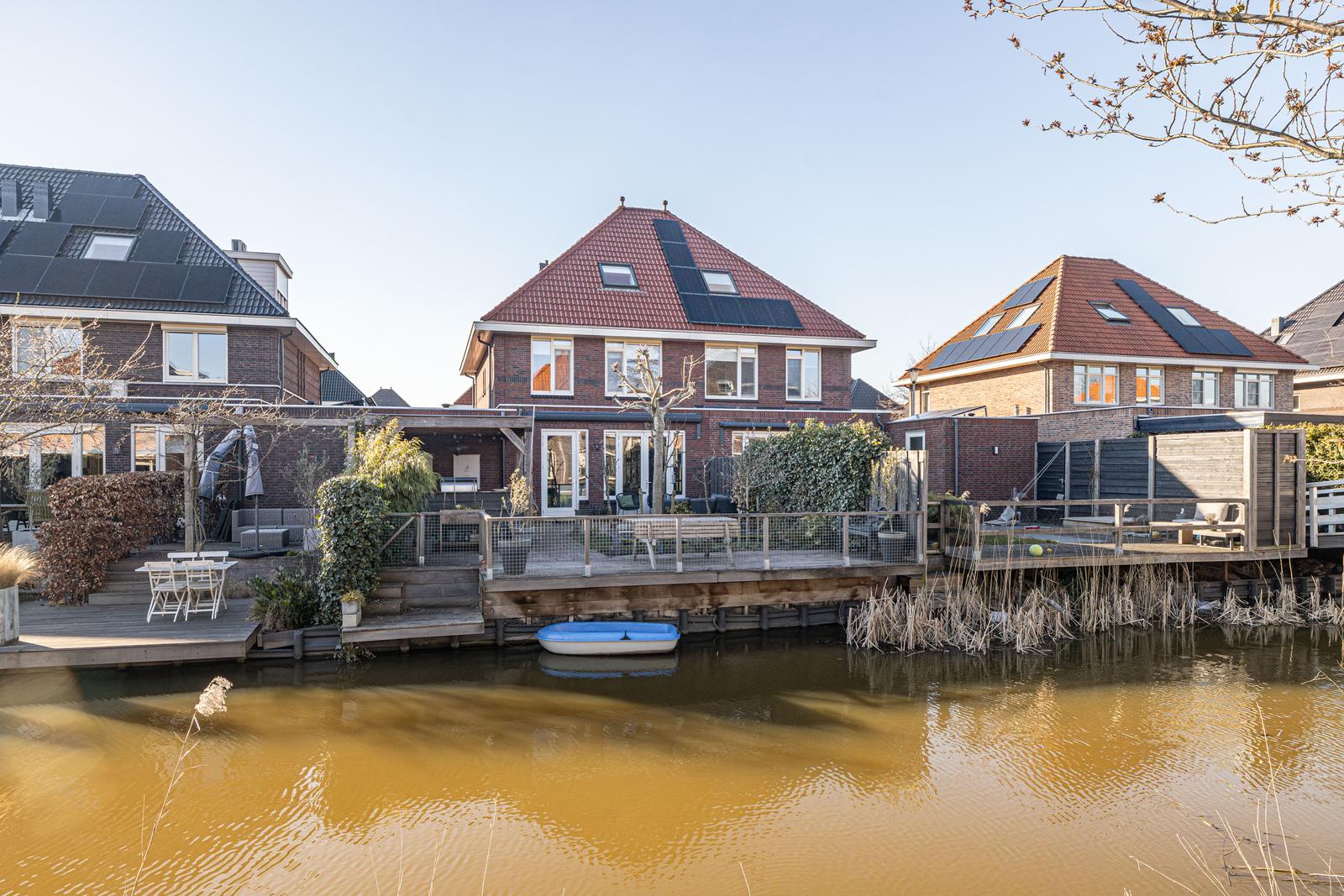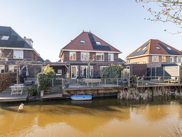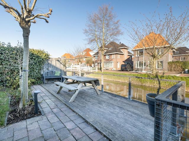 Via openslaande deuren is de zonnige, diepe achtertuin bereikbaar. Gelegen op het oosten, direct aan het water en voorzien van een ruim terras en een houten overkapping. Perfect om het hele jaar door van buiten te genieten.