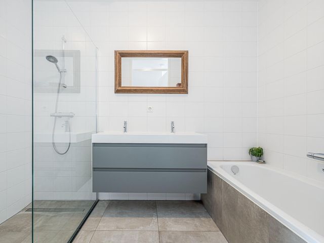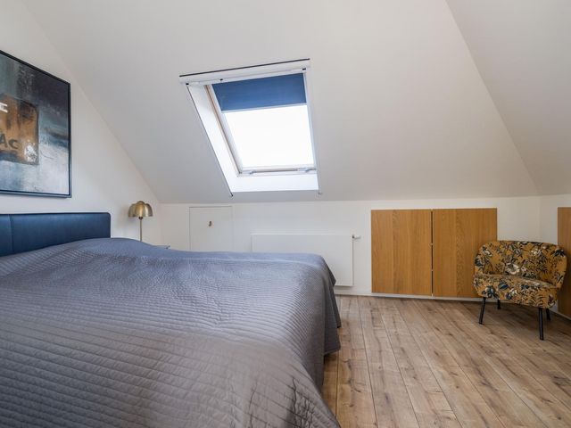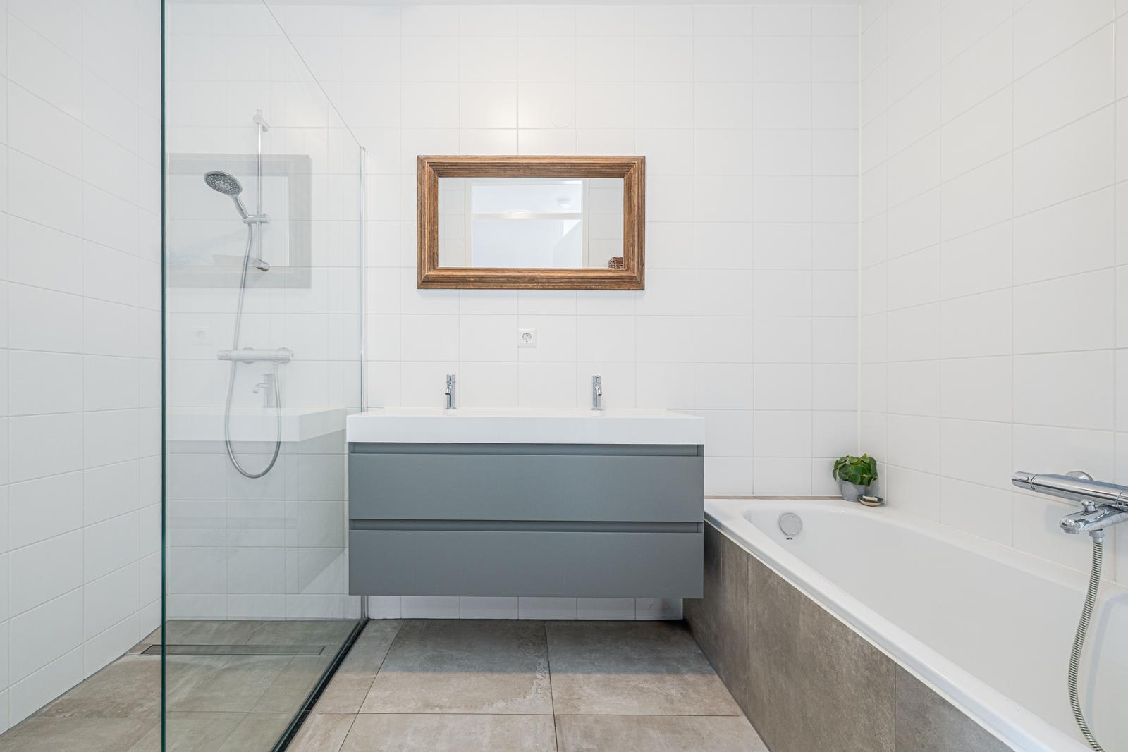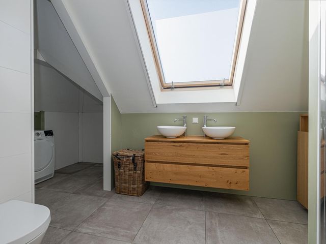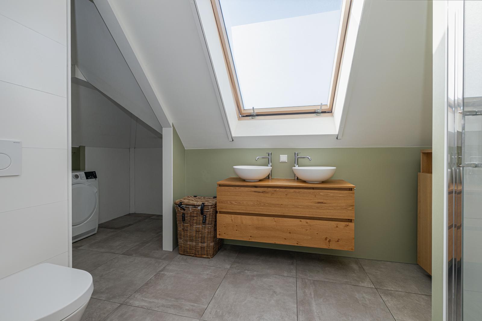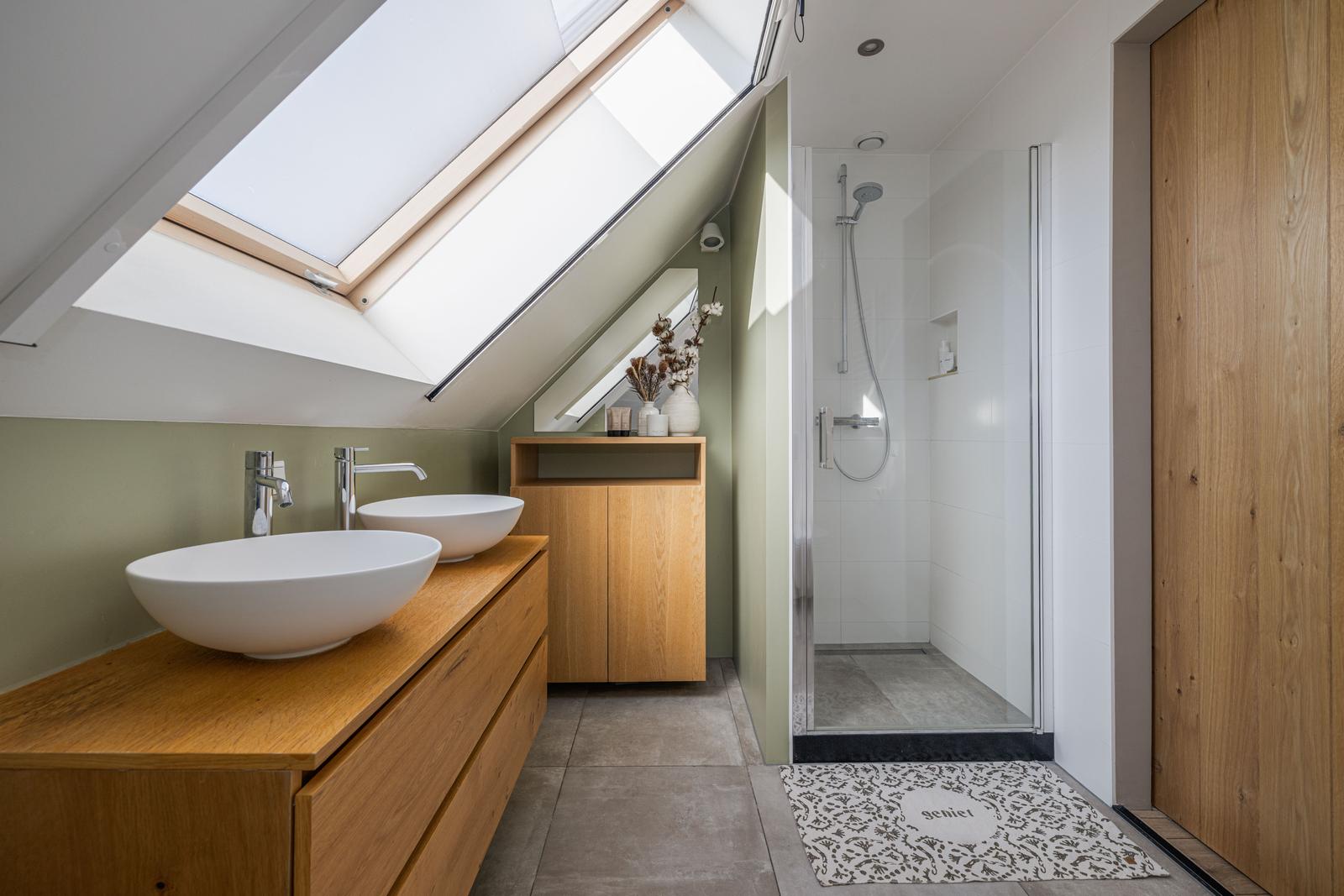 Overloop met toegang tot drie slaapkamers, een ruime badkamer en een apart toilet. De badkamer is uitgerust met een ligbad, douche, dubbele wastafel en wastafelmeubel. Grote raampartijen zorgen voor veel daglicht in alle kamers.