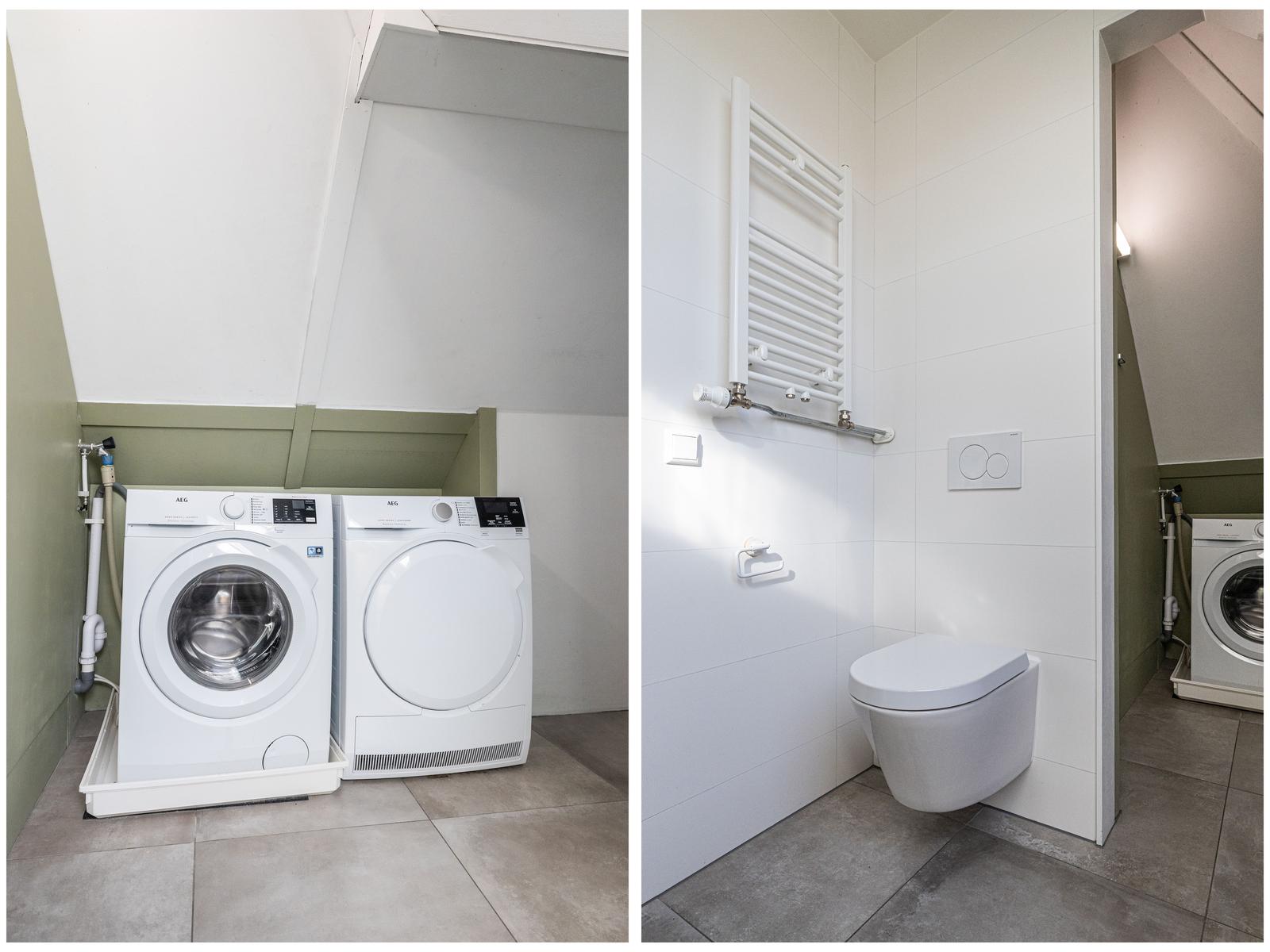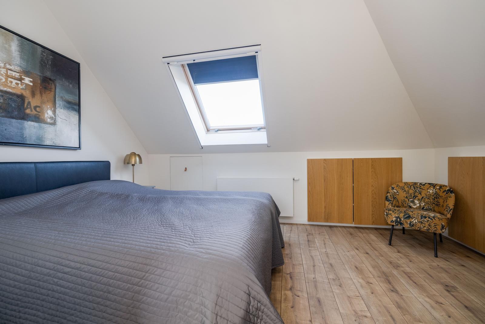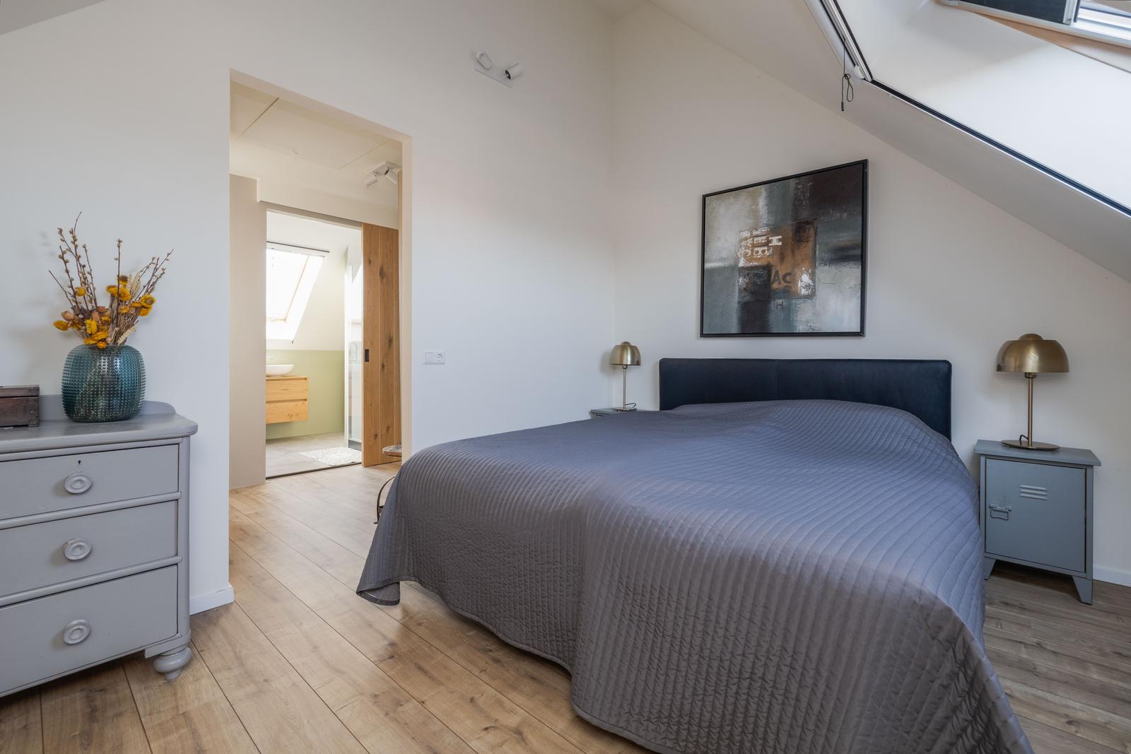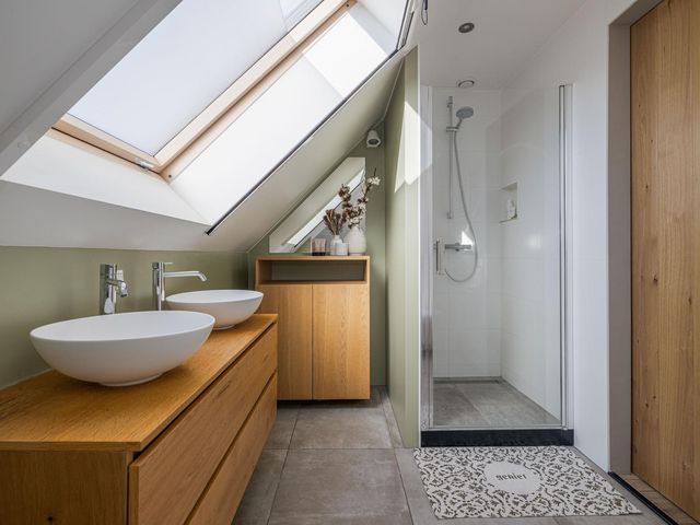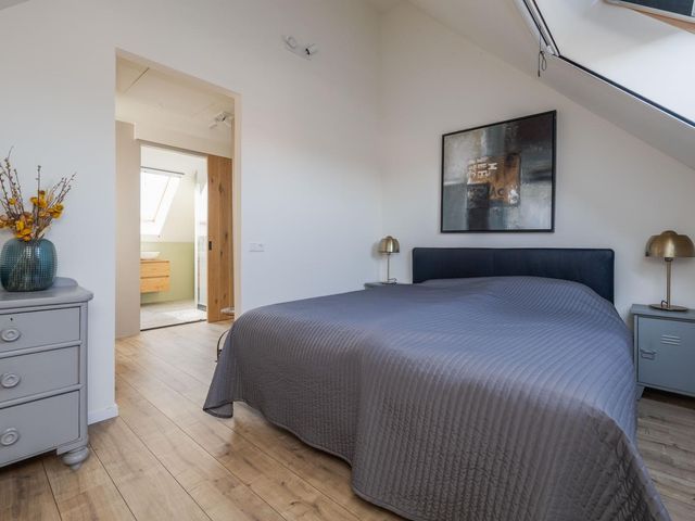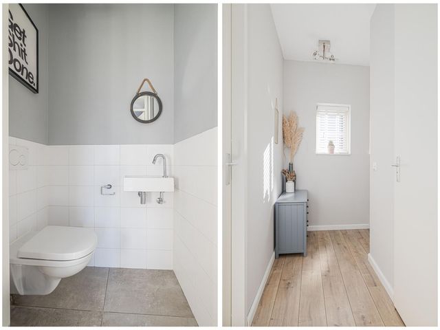 Overloop met toegang tot drie slaapkamers, een ruime badkamer en een apart toilet. De badkamer is uitgerust met een ligbad, douche, dubbele wastafel en wastafelmeubel. Grote raampartijen zorgen voor veel daglicht in alle kamers.