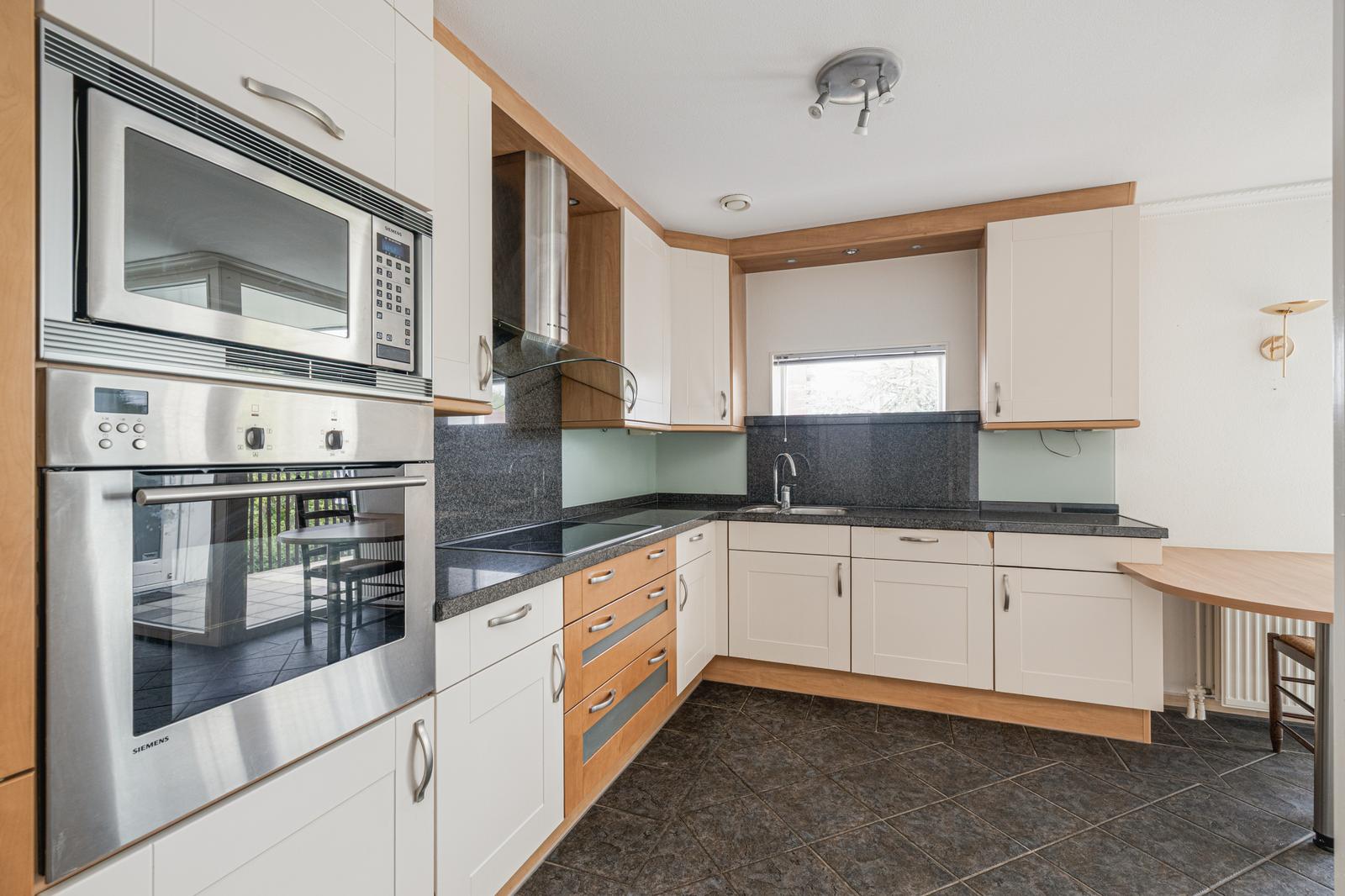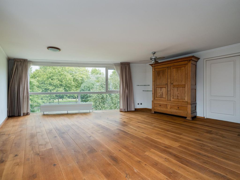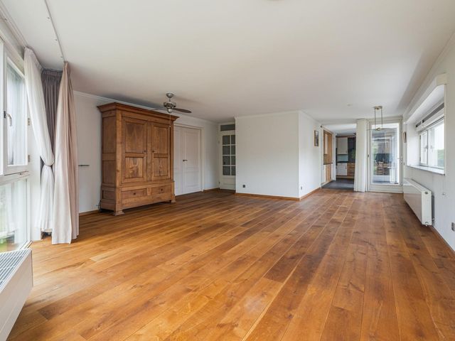 Stap binnen in een ruime hal die toegang biedt tot alle vertrekken. De lichte en royale woonkamer van ca. 40m2 heeft hoge ramen van vloer tot plafond die voor een prachtige lichtinval zorgen. De woonkamer loopt over in de uitgebreide keuken van ca. 18m2, met granieten werkblad en hoogwaardige inbouwapparatuur: twee koelkasten, een vaatwasser, keramische kookplaat, oven, magnetron en een gezellige eethoek. Via de woonkamer bereik je het zonnige balkon van