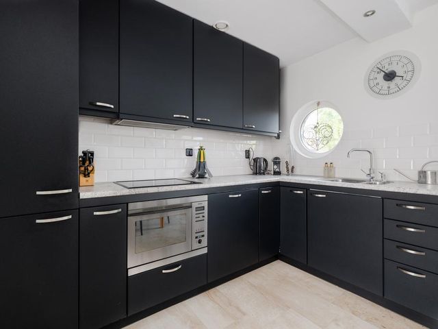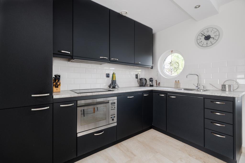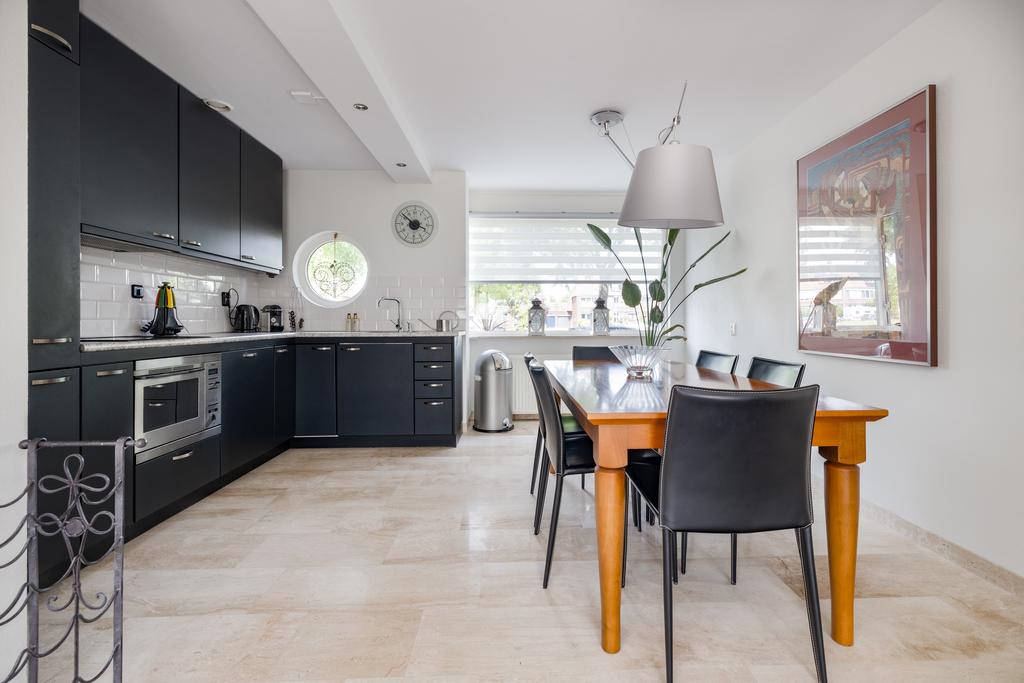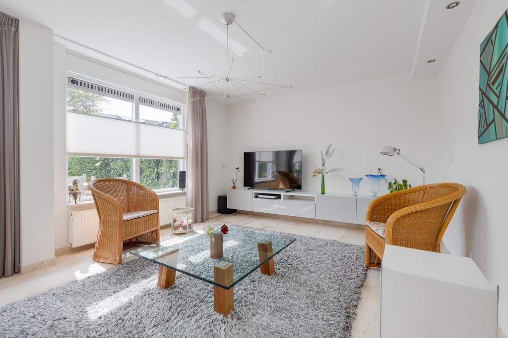 Ruime voortuin met parkeergelegenheid op eigen terrein. Entree in de hal met apart toilet met fonteintje, trapopgang naar de eerste verdieping en toegang tot de living. De keuken en eethoek zijn gesitueerd aan de voorzijde van de woning, een lichte ruimte dankzij de aanwezigheid van een erker. De keuken is uitgevoerd met zwarte kastjes en diverse inbouwapparatuur als een koelkast, vriezer, combi-oven en inductiekookplaat. De eethoek bestaat uit een rechthoekige houten tafel met een zestal zwarte stoelen. Het woonkamergedeelte bevindt zich aan de achterzijde van de woning en grenst direct aan de achtertuin. Middels openslaande deuren is de achtertuin te bereiken en mede dankzij de aanwezigheid van veel ramen is deze ruimte ook heerlijk licht! De woonkamer beschikt over een tweezitter, twee stoelen, vloerkleed, salontafel en een zwevend televisiemeubel.