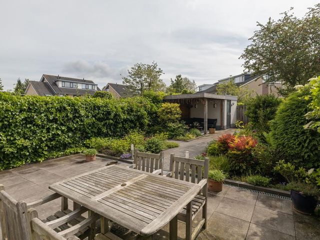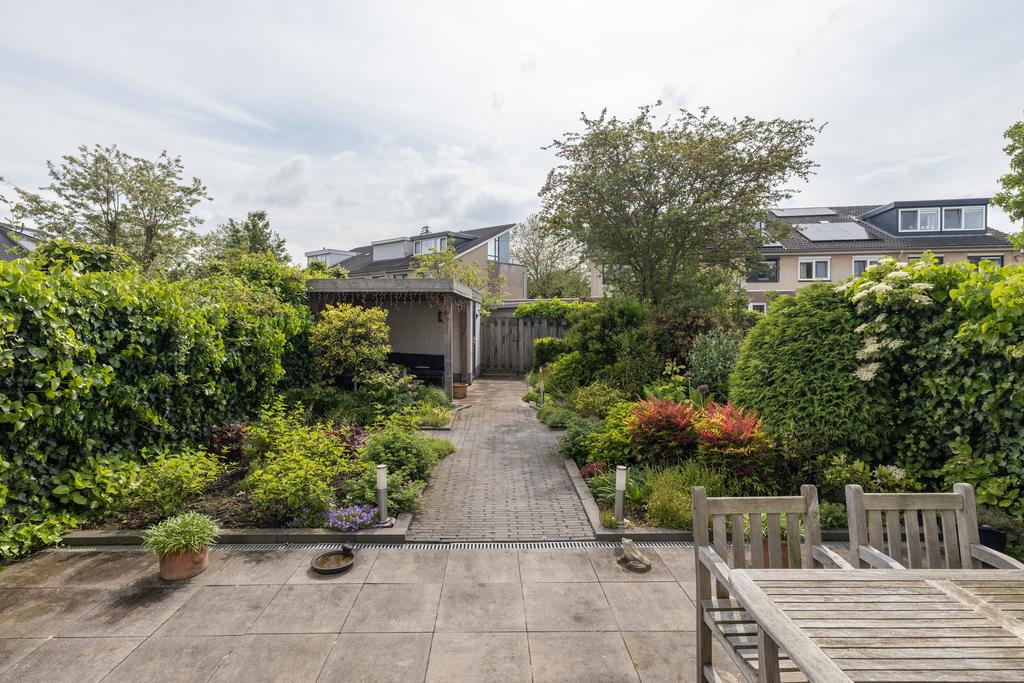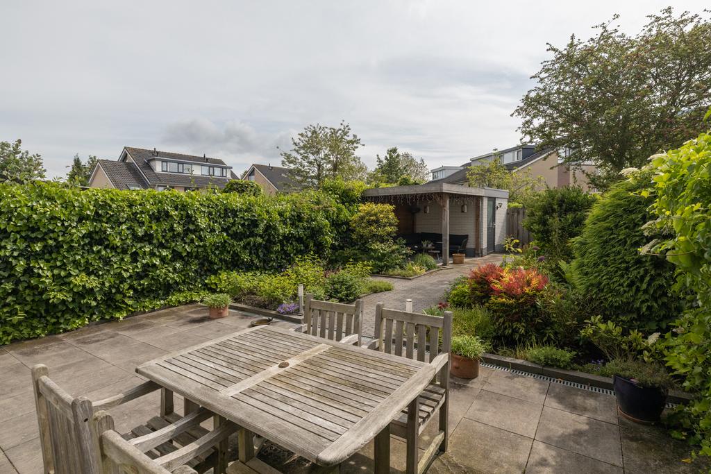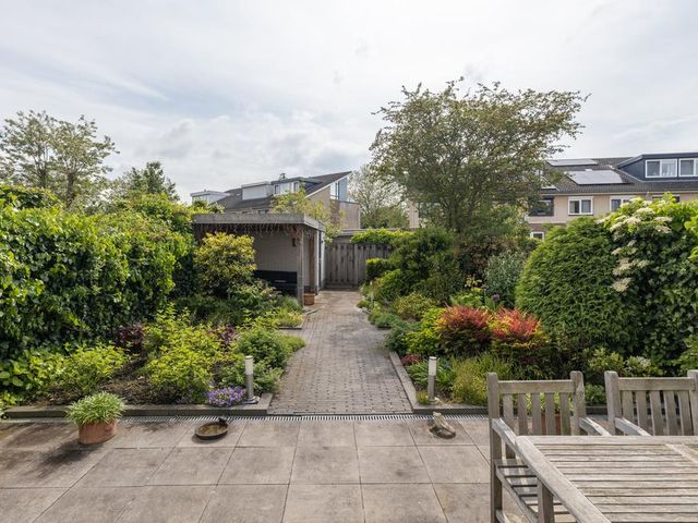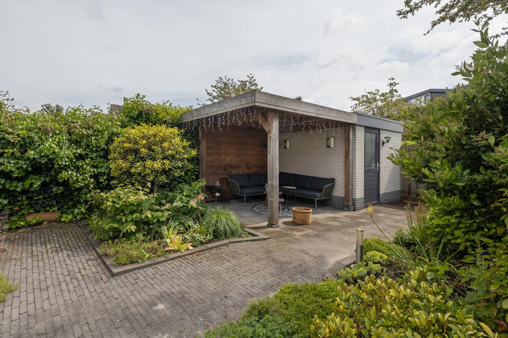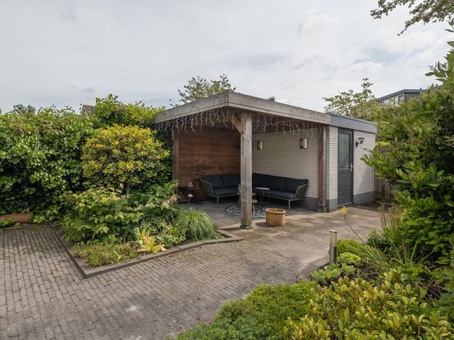 De zonnige en 15 meter diepe achtertuin is gelegen op het zuidwesten en beschikt over een ruim terras en veel groen. Aan de achterzijde is een vrijstaande stenen schuur te vinden met overkapping en achterom. Daarbij beschikt de woning over een zonnescherm.