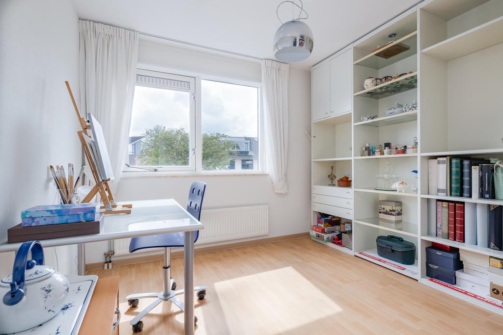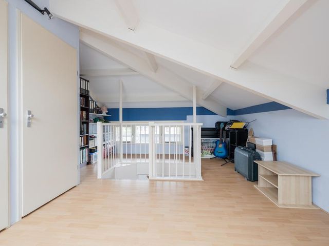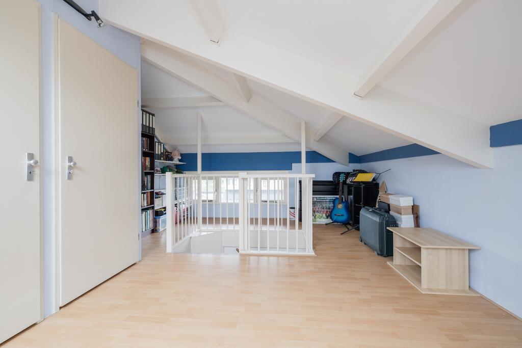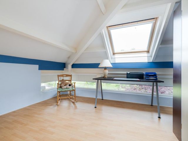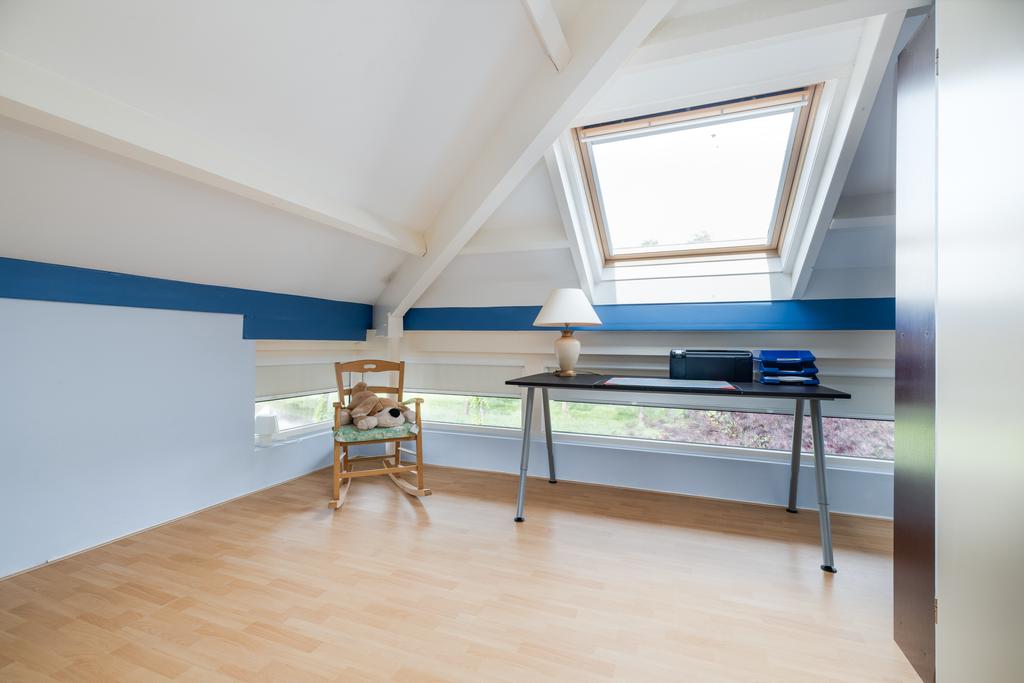 Speels ingerichte zolderkamer met veel lichtinval dankzij de aanwezigheid van (dak)ramen. Toegang tot een aparte ruimte voor wasmachine en wasdroger. Eveneens een aparte toegang voor ruimte met de Cv-ketel.