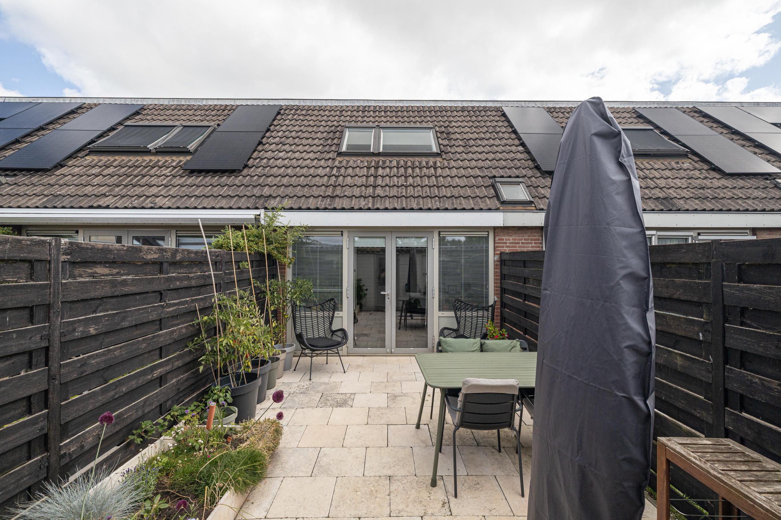 De zonnige achtertuin, gelegen op het zuidwesten, is in zijn geheel betegeld. Via de tuin is er toegang tot de schuur en middels de achterom is er toegang tot parkeermogelijkheden.