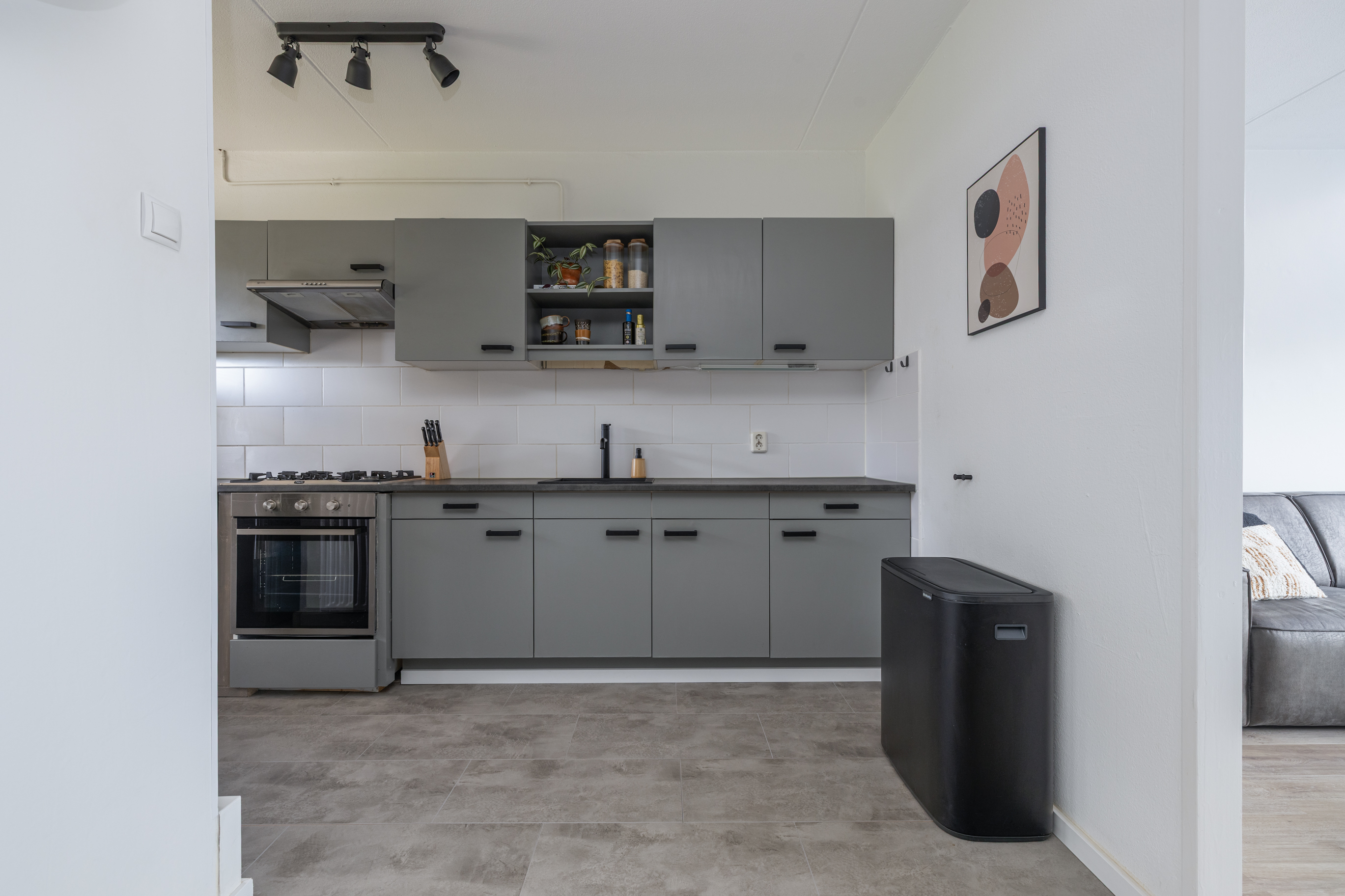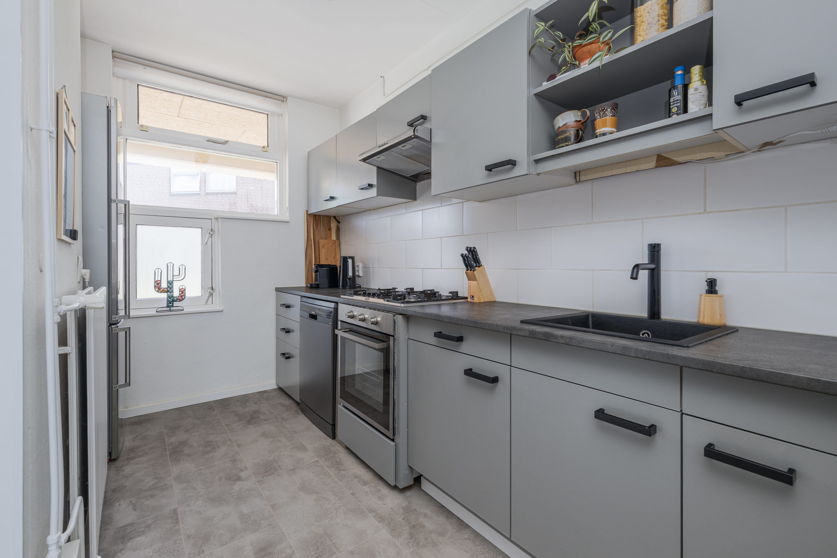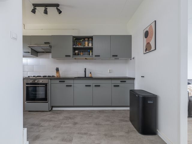 Entree, hal met toegang tot het volledig hangend en betegelde toilet met fonteintje, trap naar verdieping en de woonkamer. Heerlijk, lichte en tuingerichte woonkamer. Middels openslaande deuren is er toegang tot de achtertuin, welke gelegen is op het zonnige zuidwesten. Moderne ruime open keuken in lichte kleurstelling welke is gelegen aan de voorzijde van de woning. De keuken is voorzien van diverse apparatuur waaronder een 5-pits fornuis, afzuigkap, losse koel-/vriescombinatie en een inbouwvaatwasser.