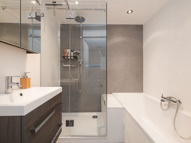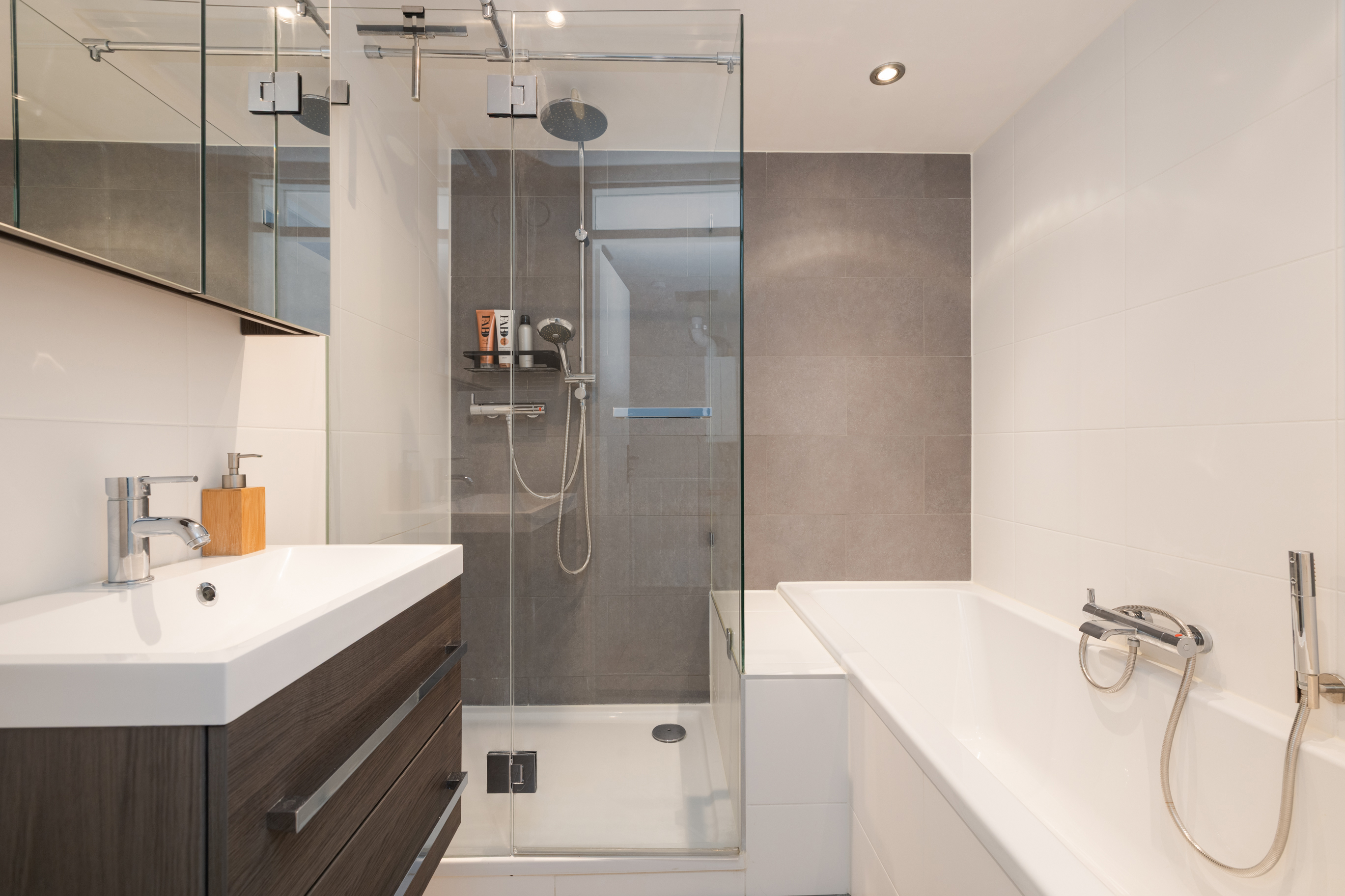De badkamer is praktisch en luxe te noemen. Deze is voorzien van een ligbad, inloop regendouche en wastafelmeubel. De badkamer is volledig betegeld in wit-en-grijstinten.