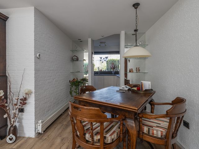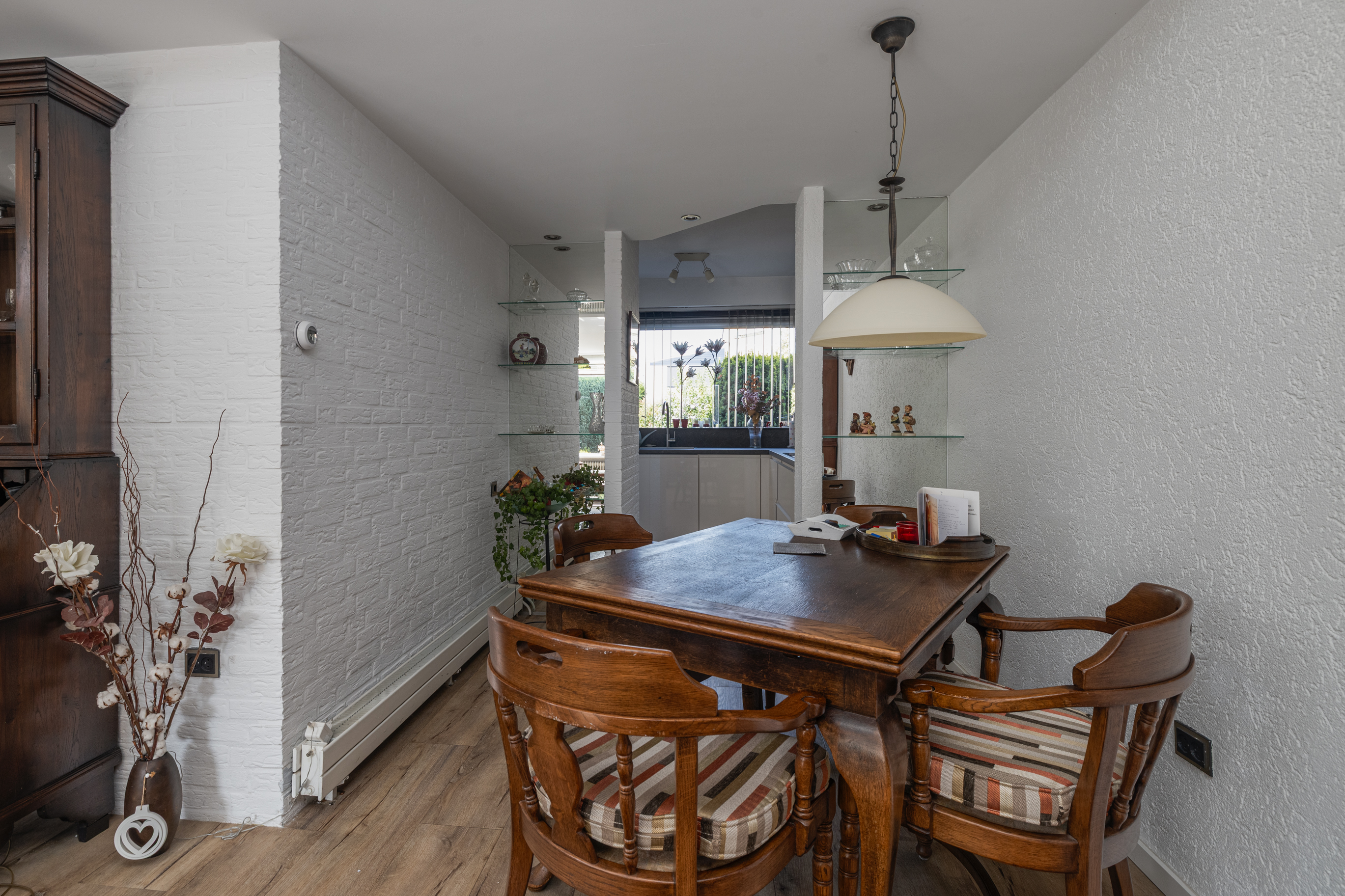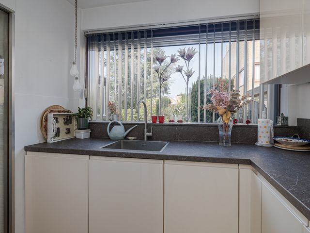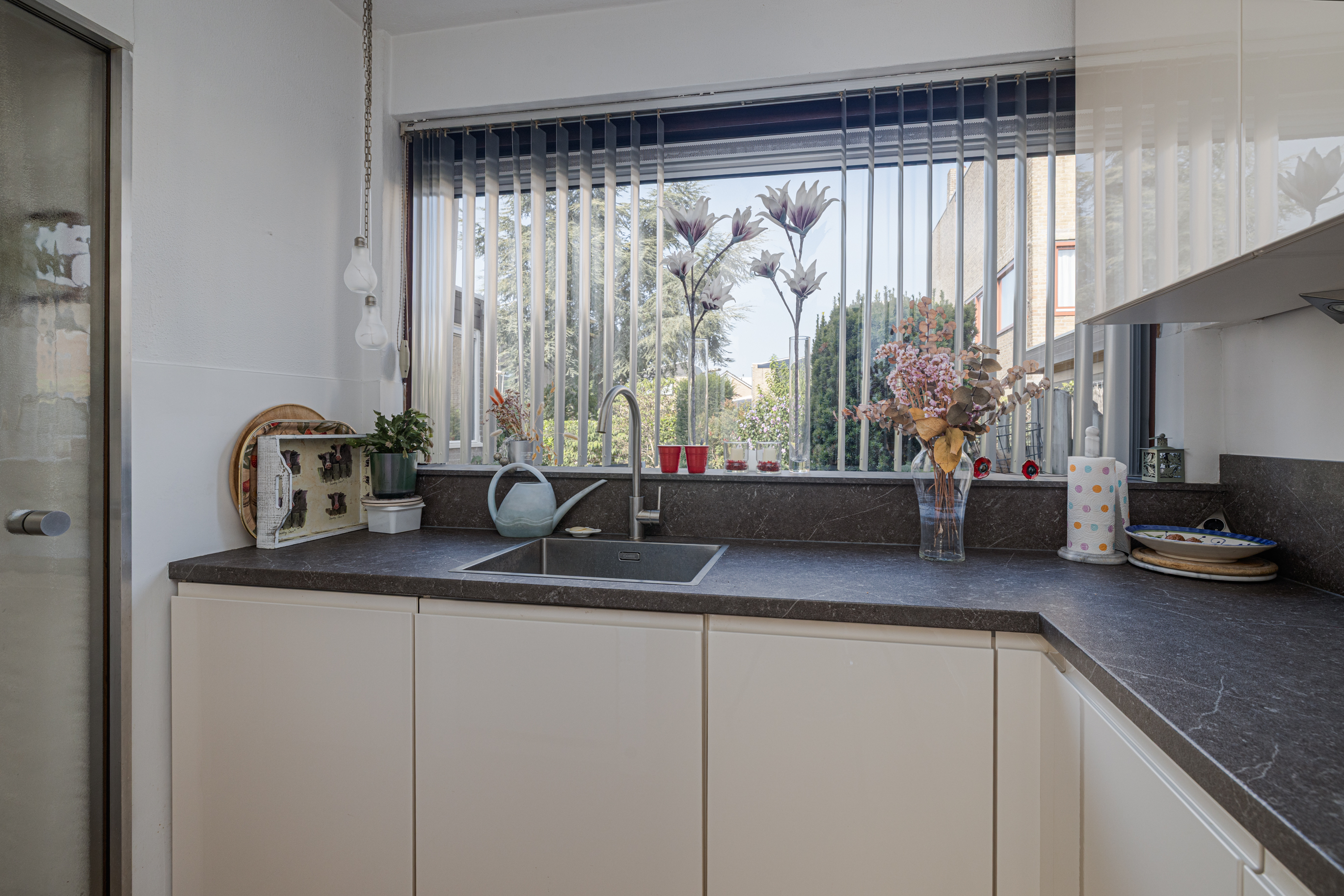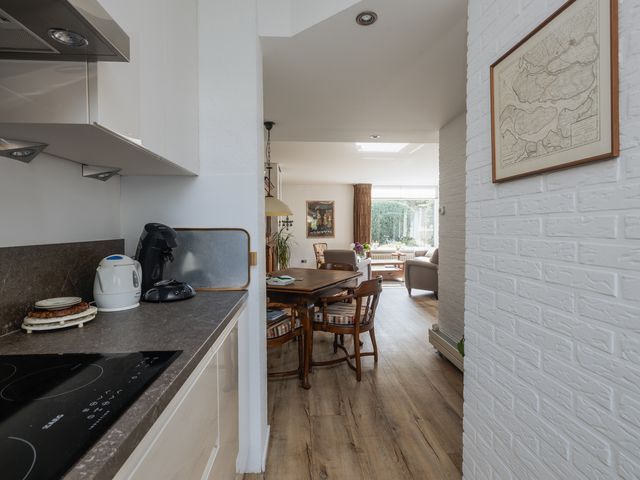De L-vormige keuken, bereikbaar vanuit zowel de entree als de woonkamer, is praktisch ingedeeld en voorzien van diverse inbouwapparatuur, waaronder een kookplaat, afzuigkap en vaatwasser, en biedt bovendien volop bergruimte.