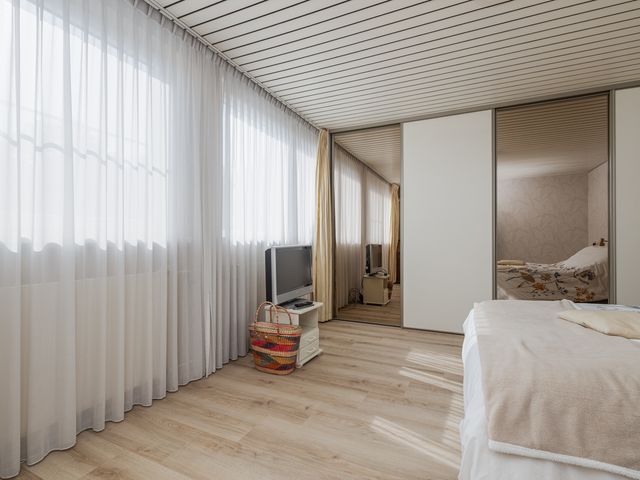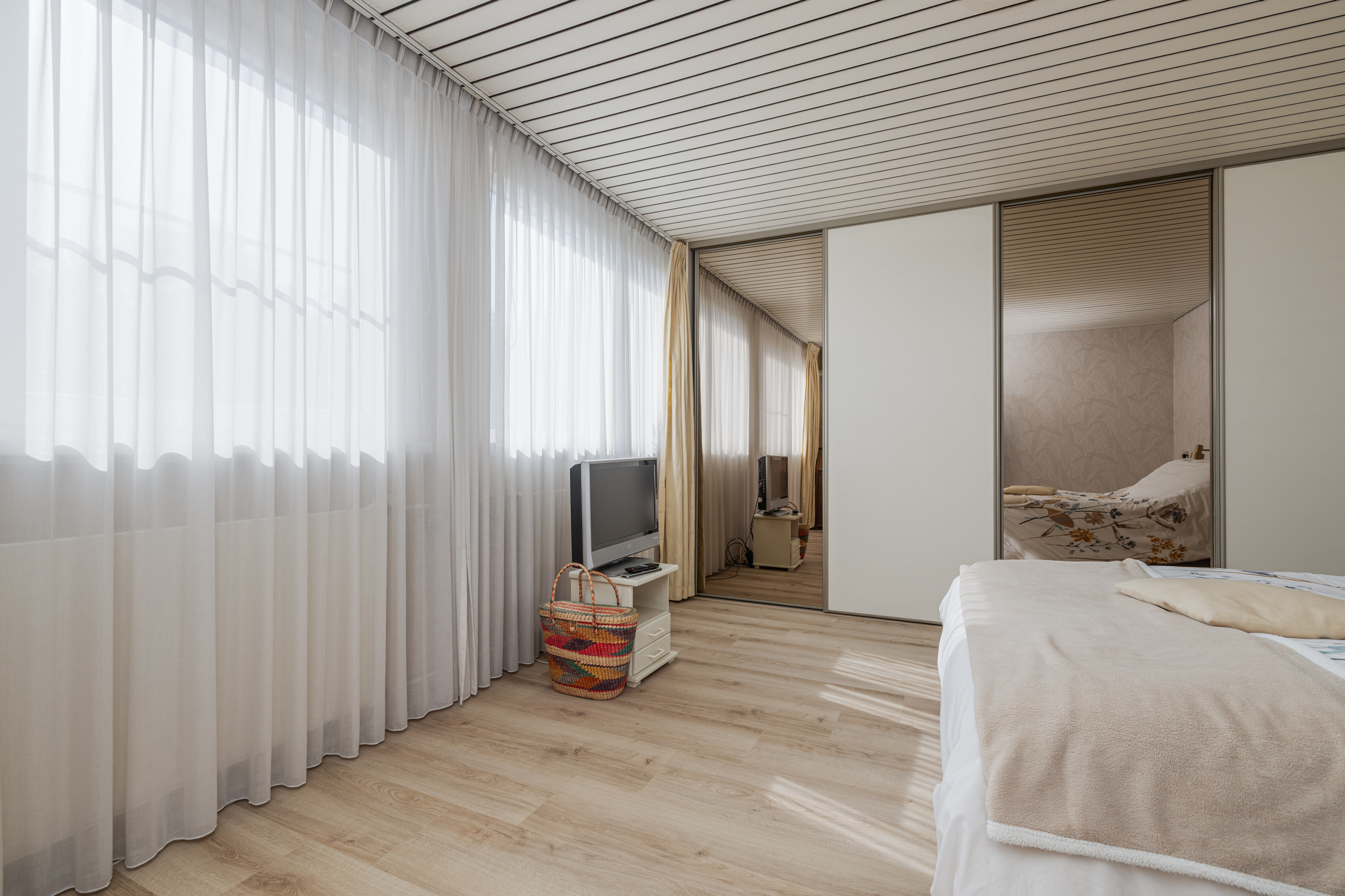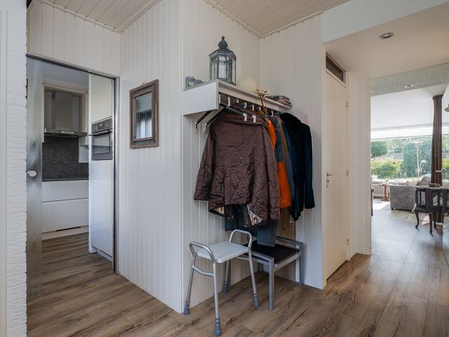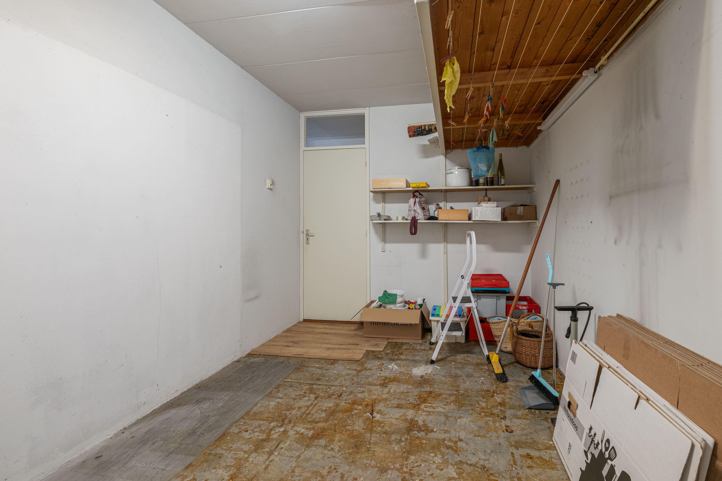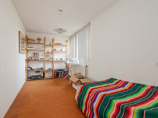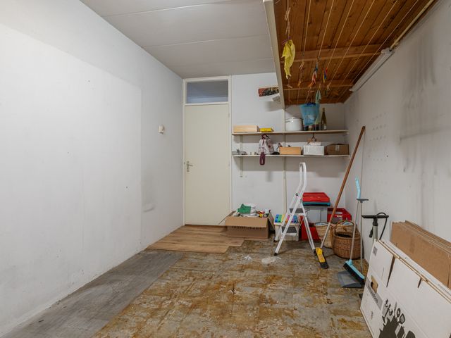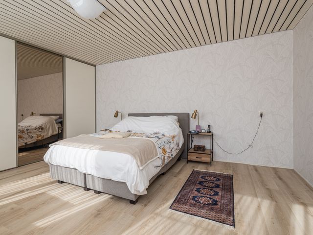 Vanaf de entree heb je toegang tot de badkamer, die netjes is afgewerkt met witte tegels en is voorzien van een douche, wastafel en toilet. De royale slaapkamer aan de achterzijde van de woning heeft een oppervlakte van ca. 22m2. Uitgevoerd met een grote kastenwand en een airco. Vanuit de entree kom je in de hal, waar zich de tweede slaapkamer aan de voorzijde zich bevindt van ca. 13m2. Ideaal als logeer- of werkkamer. Daarnaast is er toegang tot de garage met carport, voorzien van een aansluiting voor de wasmachine en droger en geschikt als praktische opbergruimte. Tevens toegang tot de vliering.